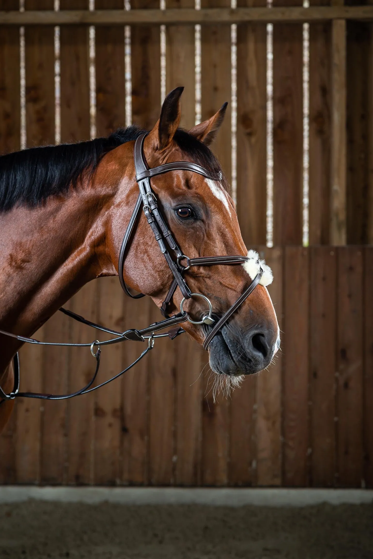 Der Nasenriemen ist das herausragende Merkmal dieser Trense. Er sorgt für optimale Kontrolle, indem der Druck gleichmäßig verteilt wird – das hilft, das Maul des Pferdes geschlossen zu halten und die Konzentration zu fördern. Gleichzeitig ermöglicht das Design eine bessere Luftzirkulation und ist damit ideal für intensives Training und Turniereinsätze. Durchdacht konstruiert, bleibt das Pferd auch bei langen Ritten frei von Reibung und Irritationen – mit Komfort als oberster Priorität. Verstellbare Backenstücke erlauben eine individuelle Passform für unterschiedliche Kopfformen und -größen. Kombiniere die Trense mit passenden Dy’on-Zügeln aus Büffelleder oder einem Martingal für ein vollständiges Setup, das auf Leistung ausgelegt ist. Dieses Modell verbessert nicht nur die Kontrolle und Kommunikation mit dem Pferd, sondern vereint auch Funktionalität und Stil für den täglichen Einsatz.
