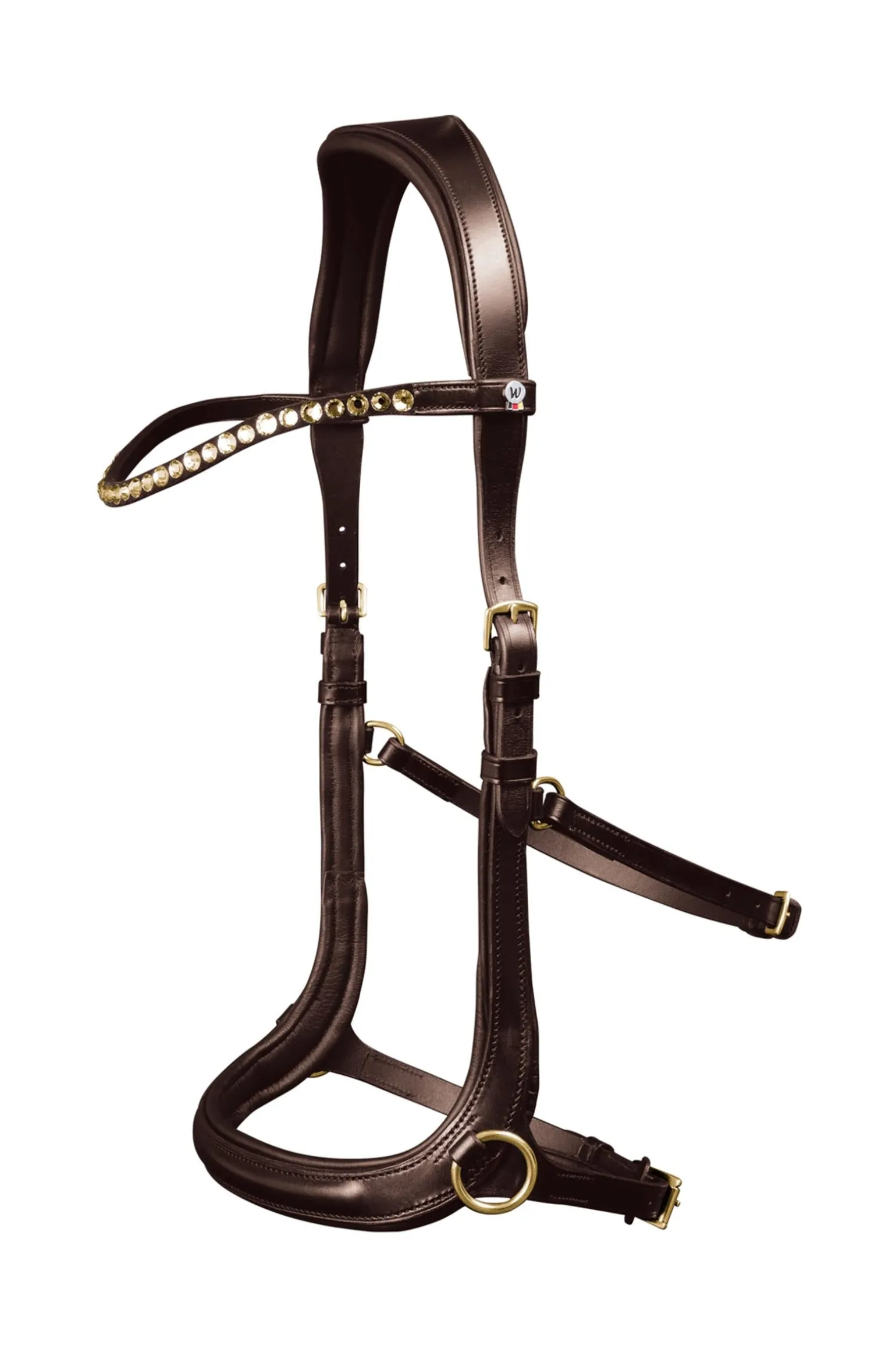 Die schöne gebisslose Trense ist aus feinstem Leder gefertigt und verfügt über ein schmuckvoll verziertes Stirnband. Sie ist anatomisch geformt für das Wohlbefinden deines Pferdes.