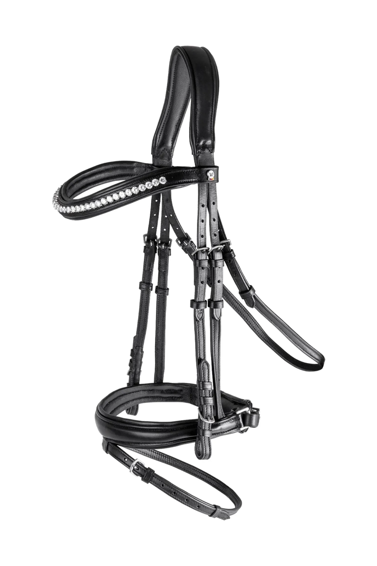Die Waldhausen X-Line Supersoft Joy Trense verfügt über einen Pull-back-Nasenriemen und extrem weiches Leder für maximalen Komfort. Das anatomisch geformte Kopfstück sorgt für eine perfekte Passform, während das gebogene Stirnband mit einer Strassstein-Kette einen Hauch von Eleganz verleiht. Nasenriemen, Stirnband und Kopfstück sind weich gepolstert für zusätzlichen Komfort, und die Edelstahlbeschläge gewährleisten Haltbarkeit. Diese Trense wird auch mit 19 mm Webbingzügeln für bessere Kontrolle und Komfort geliefert.