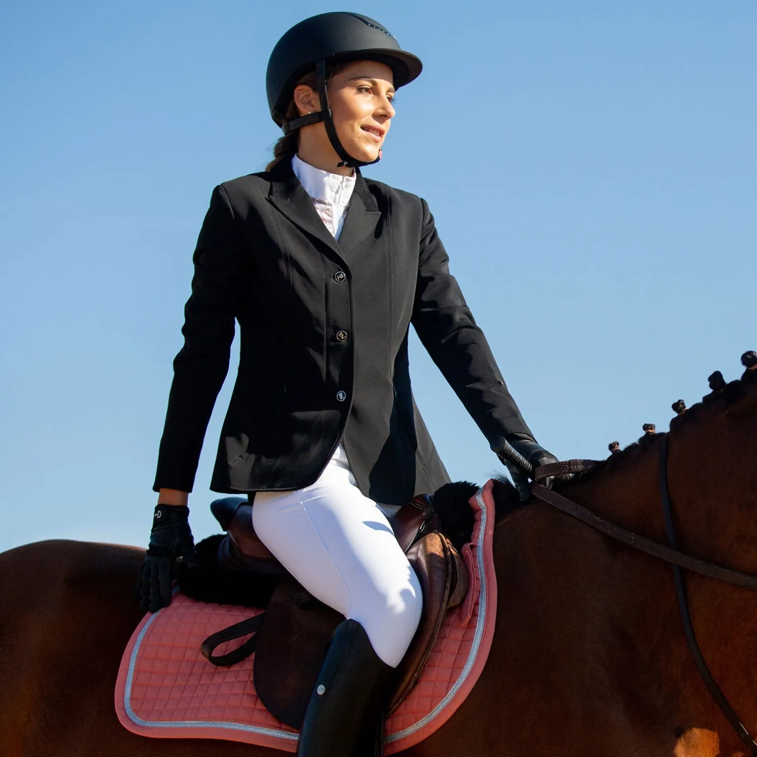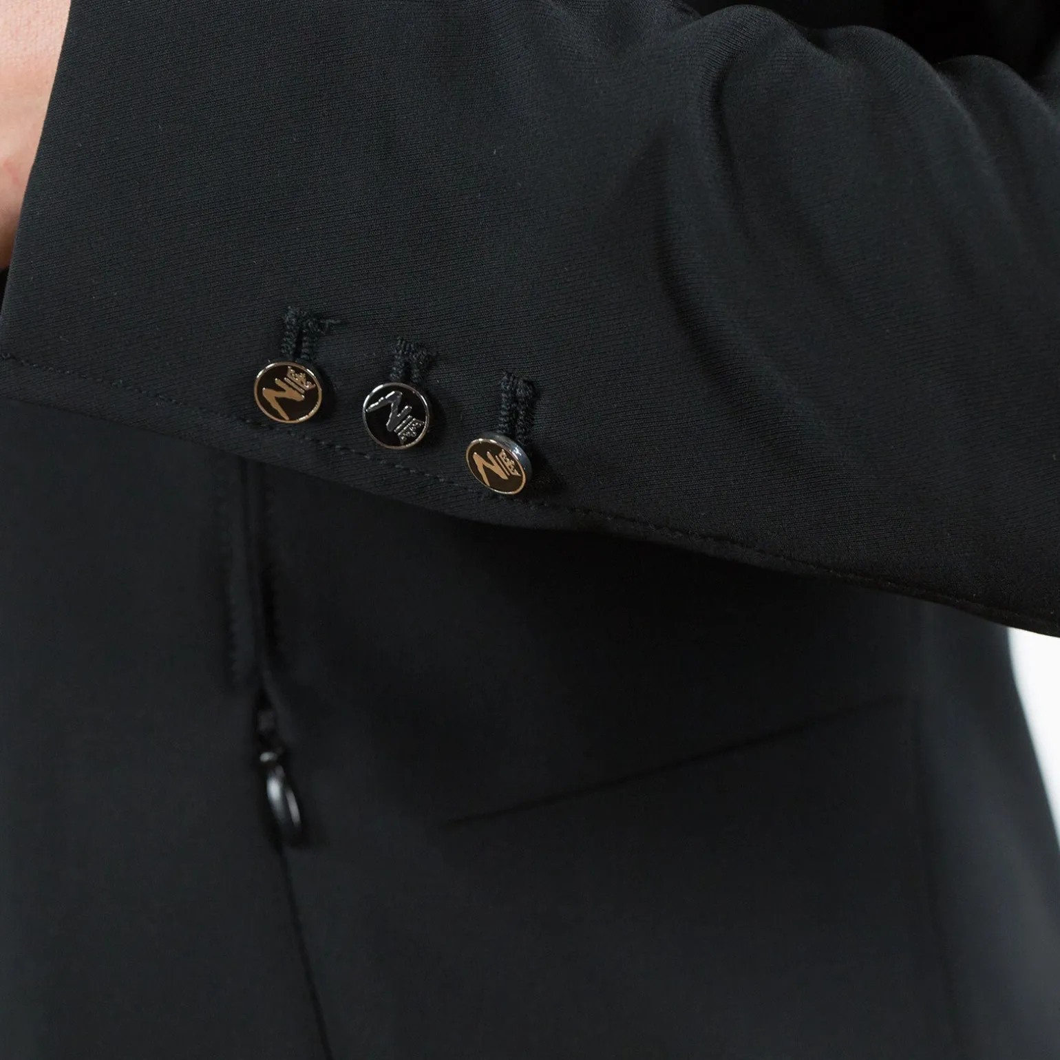 Ein modisches, dehnbares Turnierjackett mit 3 klassischen Frontknöpfen und einer verjüngten Taille für einen figurbetonten Look. An der Manschette befinden sich drei elegante Knöpfe, die zur Vorderseite passen und die diskreten Reißverschlusstaschen sind am Saum versteckt. Wunderschönes Wildleder-Material verleiht dem Kragen eine schlichte, elegante Note.