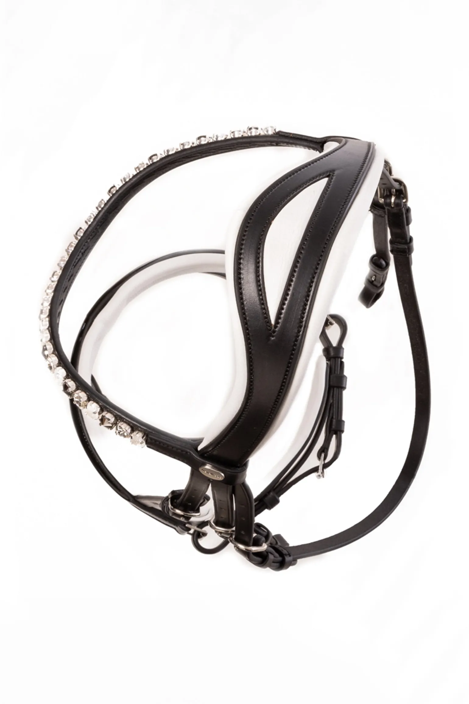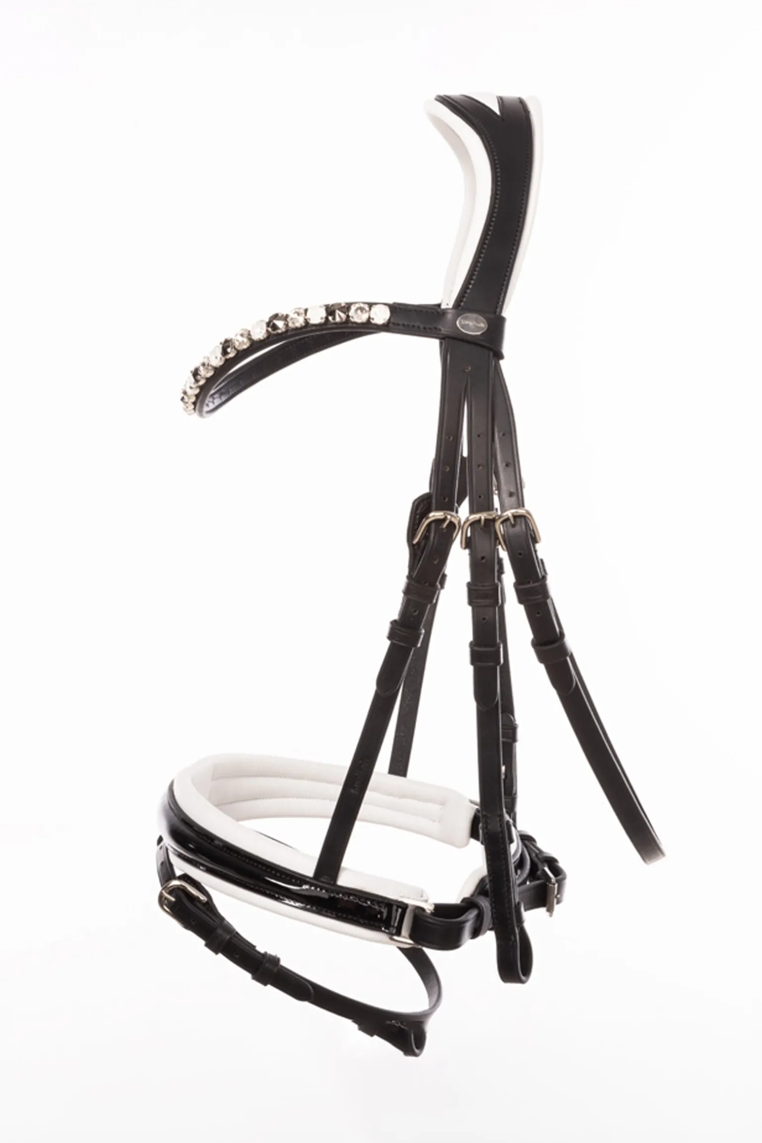Die Dressurtrense „Zora“ besteht aus hochwertigem deutschen Qualitätsleder sowie einem besonders weichen Genickstück, welches stark anatomisch geformt ist mit Einschnitt. Die weiche Polsterung vom Nasenriemen und Stirnband bieten ebenfalls einen besonderen Komfort für das Pferd. Das Reithalfter ist beidseitig verstellbar. Der Trensenzaum wird ohne Zügel geliefert.