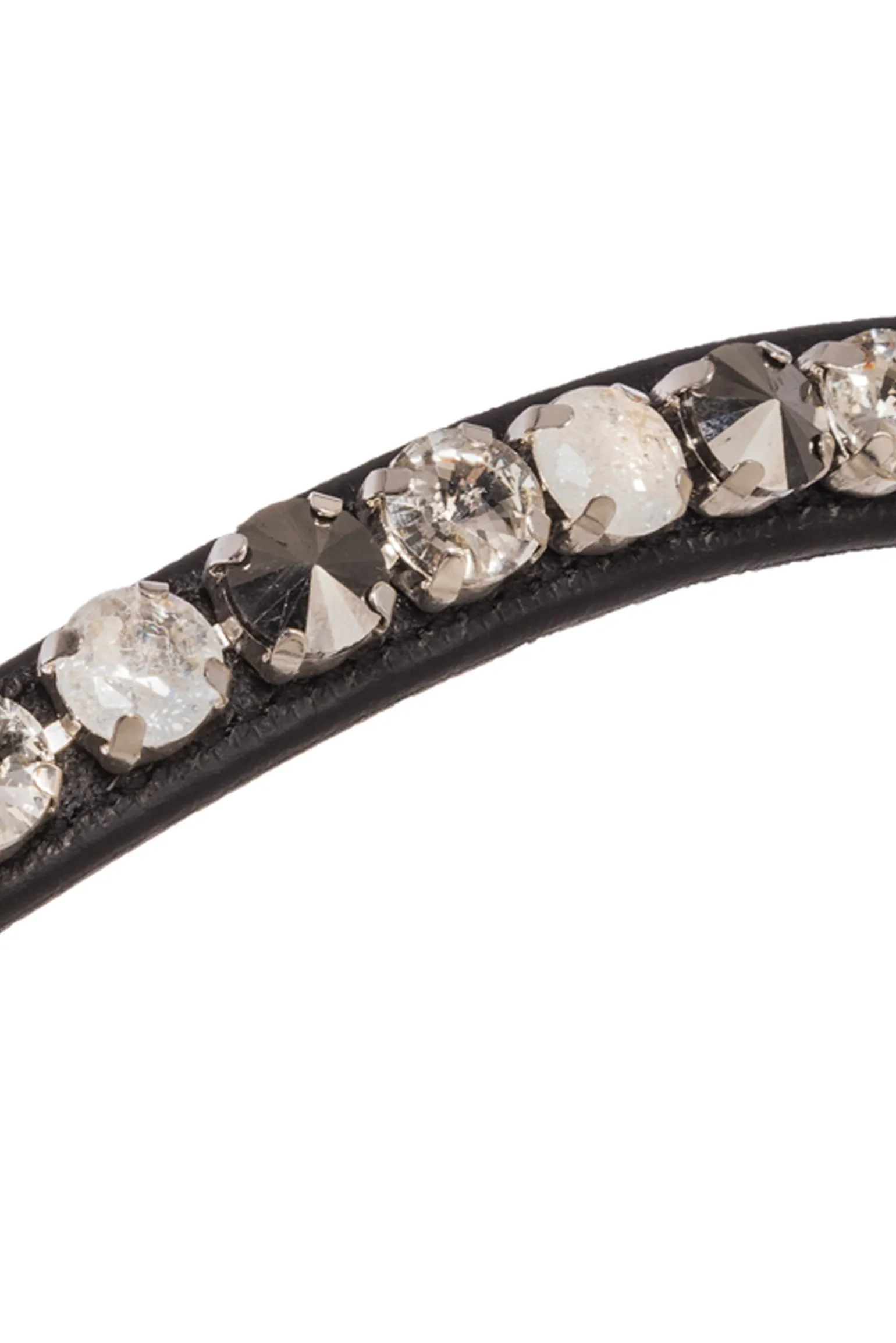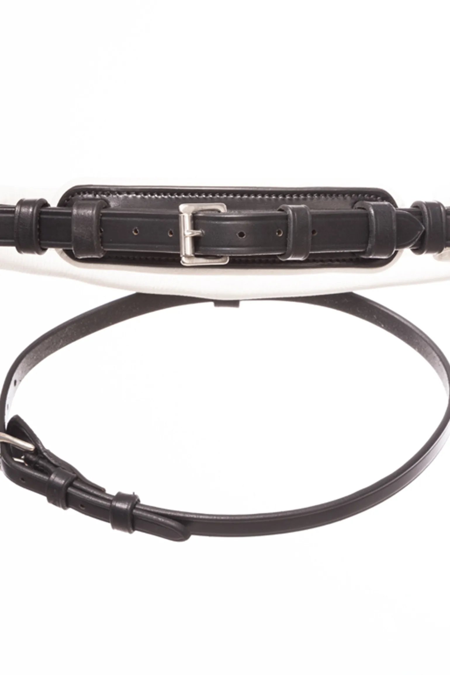 Bei Trensen mit dem Zusatz KavalSH4 ist der Sperrriemen abnehmbar. Das Besondere daran ist, dass die Halterung für den Sperrriemen nicht, wie bei herkömmlichen Trensen mit abnehmbarem Sperrriemen, ersichtlich ist.