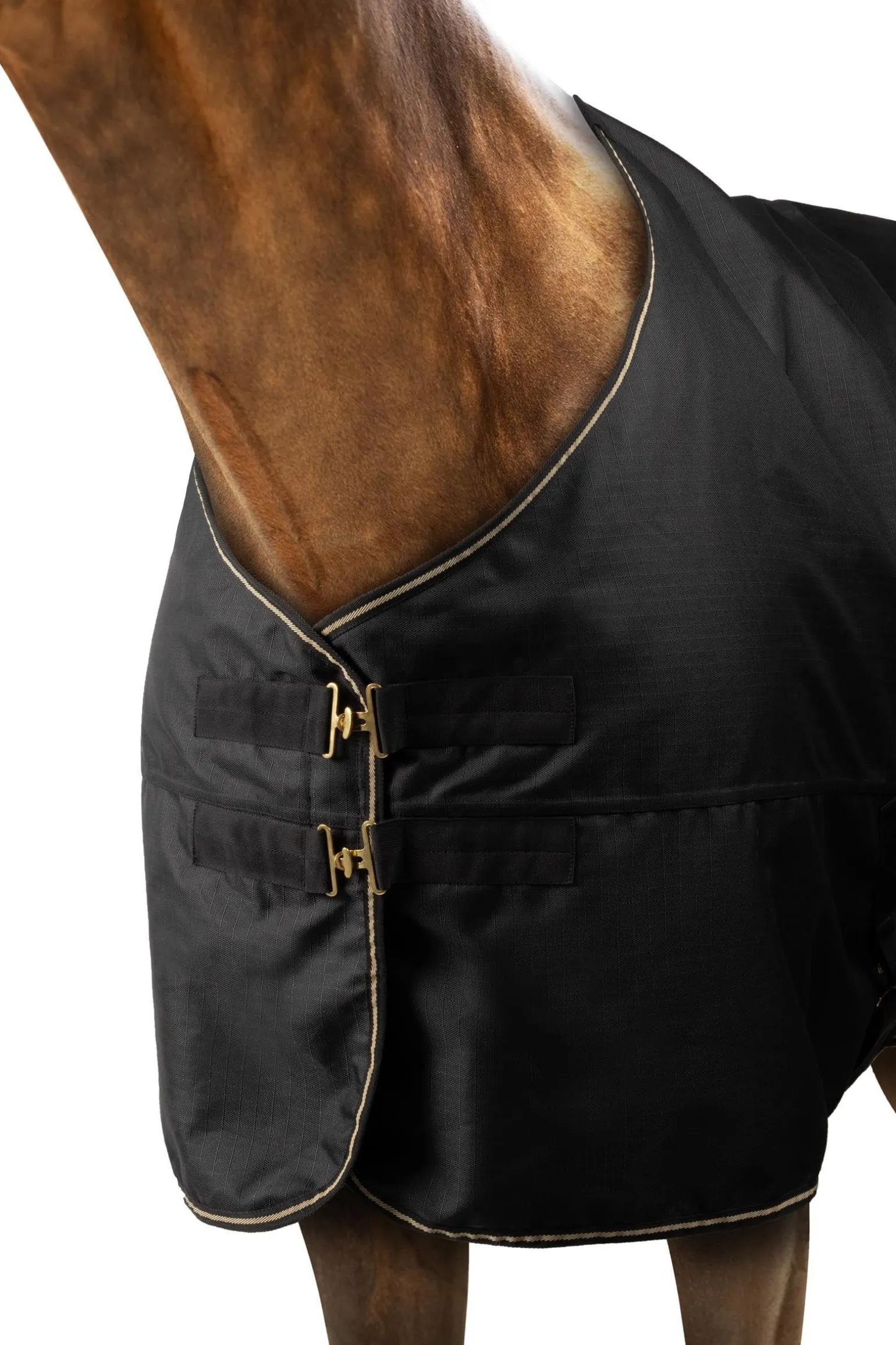 Halte dein Pferd trocken und komfortabel mit dieser strapazierfähigen Outdoordecke aus 1200D-Material. Das wasserdichte und atmungsaktive Gewebe sorgt für Schutz bei jedem Wetter, während getapte Nähte zusätzlichen Nässeschutz bieten. Zwei T-Schnallenverschlüsse vorne und Kreuzgurte gewährleisten sicheren Sitz, ergänzt durch Beinschnüre, einen Schweiflatz und eine praktische Schweifkordel. Weiche Neoprenpolsterung am Widerrist beugt Scheuerstellen vor, und die matten, goldfarbenen Metallelemente verleihen der Decke einen eleganten Look. Der reflektierende, goldfarbene Logo-Print sorgt zudem für bessere Sichtbarkeit – Funktion und Stil perfekt kombiniert.
