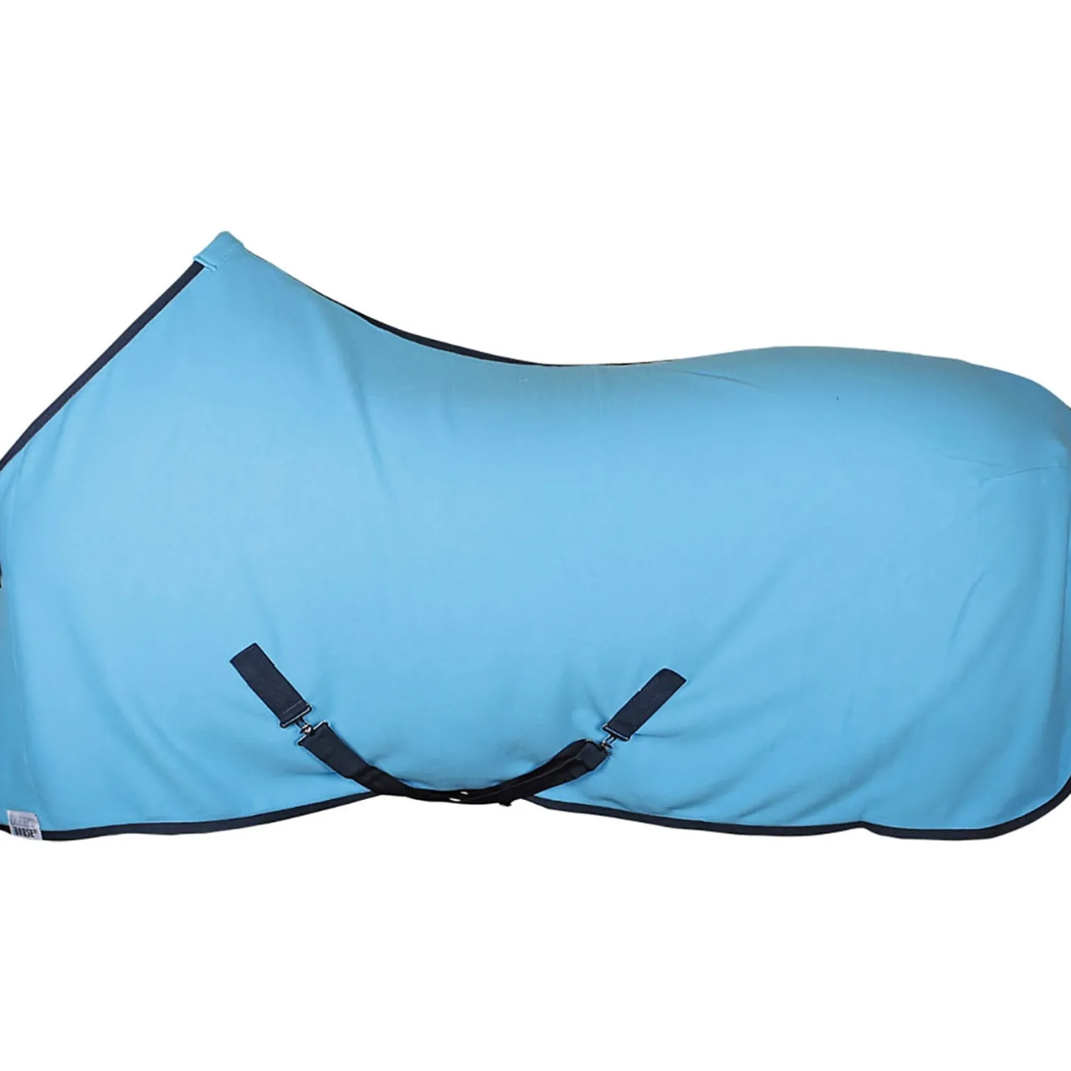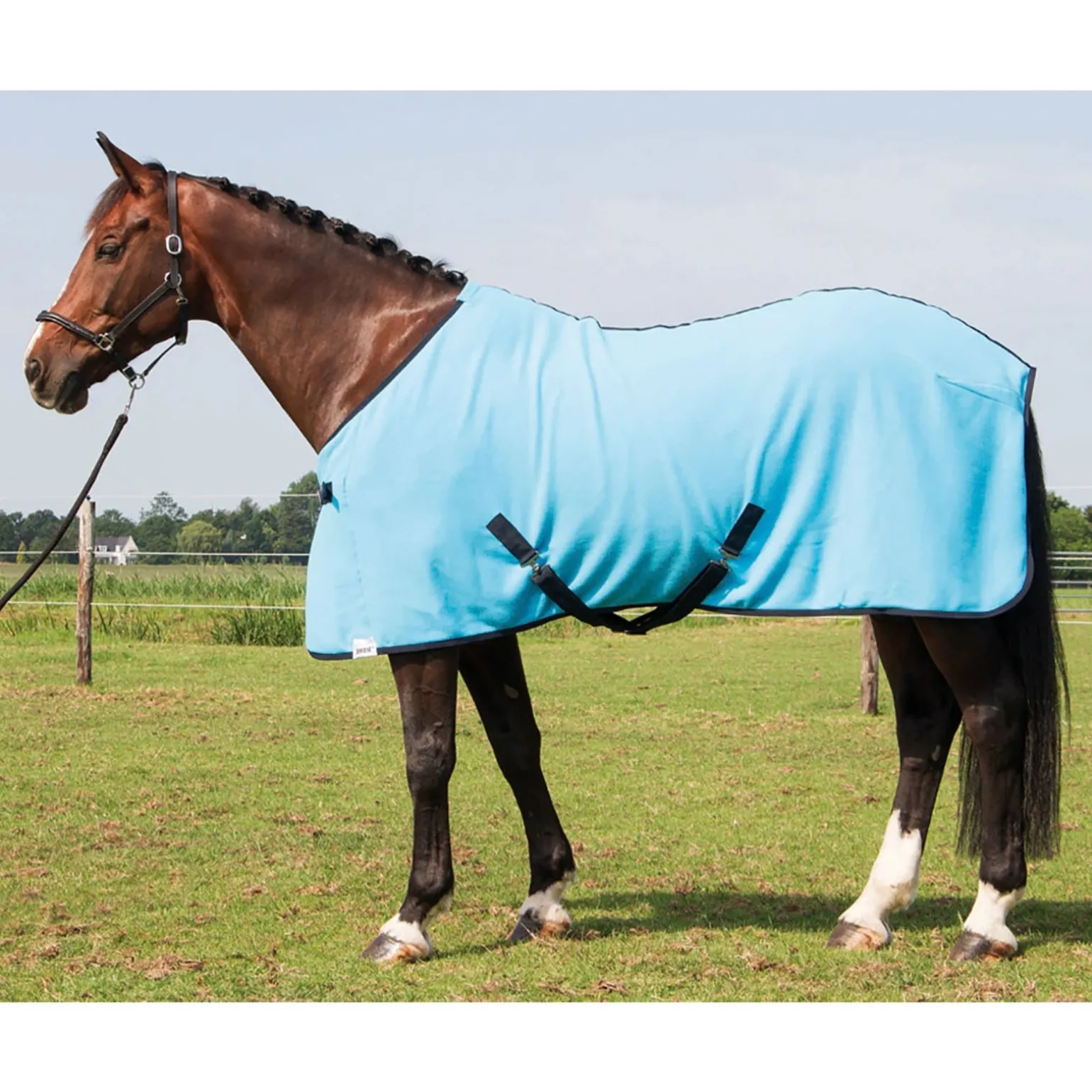 Fleecedecke mit einem Brustverschluss, Schweifriemen und Kreuzbegurtung.