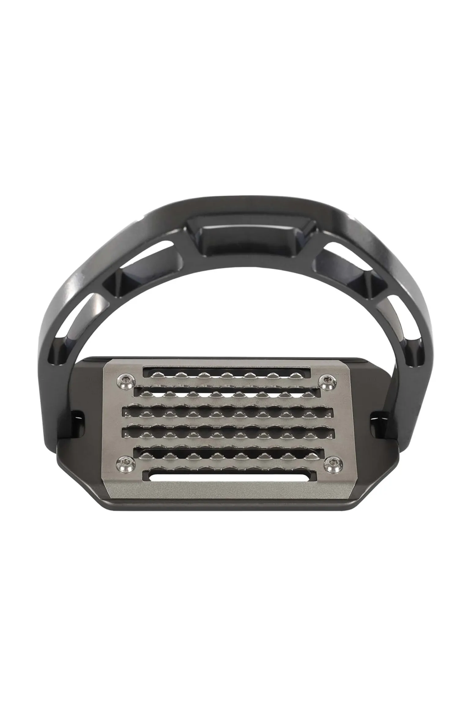 Die Trittfläche ist aus rostfreiem Stahl und hat lange horizontale Löcher. Die 5° Neigung hilft den Reitern, die richtige Haltung einzunehmen und entlastet Knöchel, Waden, Knie und Hüfte.