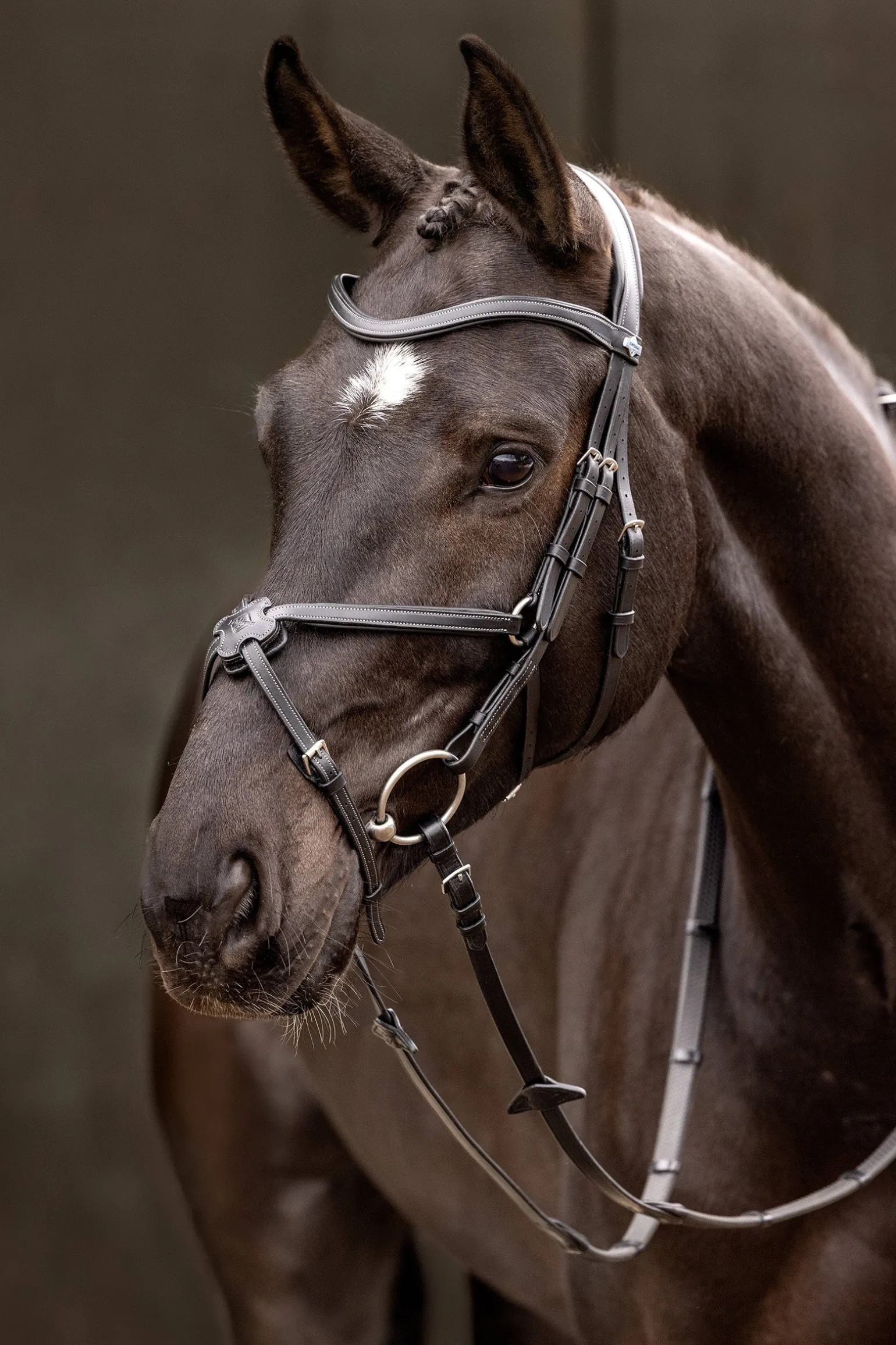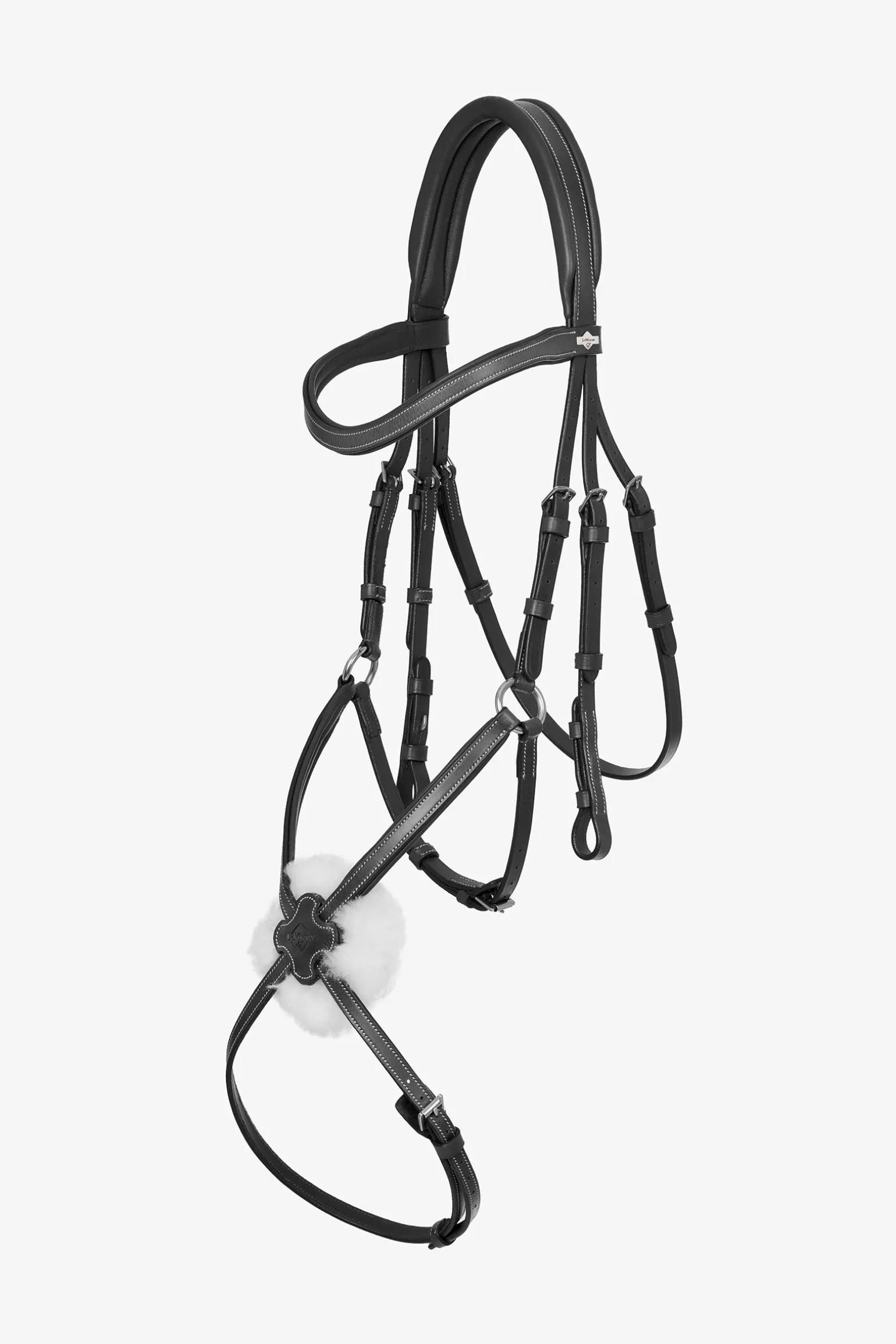 Nasenriemen und Backenstücke sind mit einem D-Ring verbunden, so dass die Stücke sanft an den Wangen und dem Kiefer des Pferdes anliegen. Dadurch wird eine taillierte Passform für unterschiedliche Kieferformen erreicht und der hintere Riemen kann sich unabhängig bewegen.