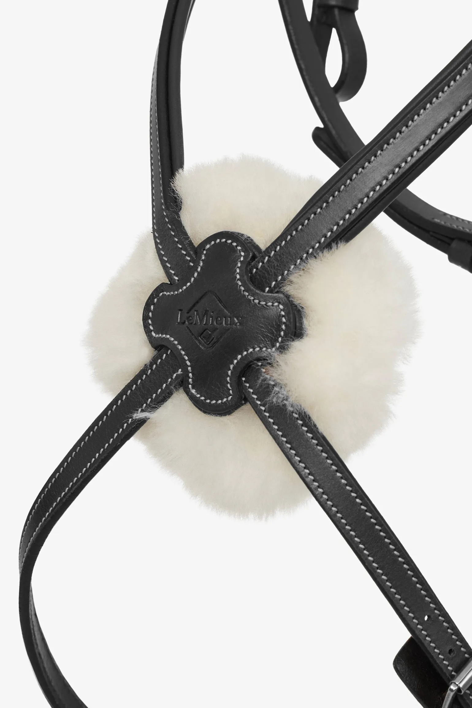 Sie verfügt über einen leicht unterlegten anatomischen Stirnriemen, ein anatomisch geformtes gepolstertes Genickstück und ein abnehmbares Wollpolster am Nasenstück, das unangenehmen Druck verhindert.