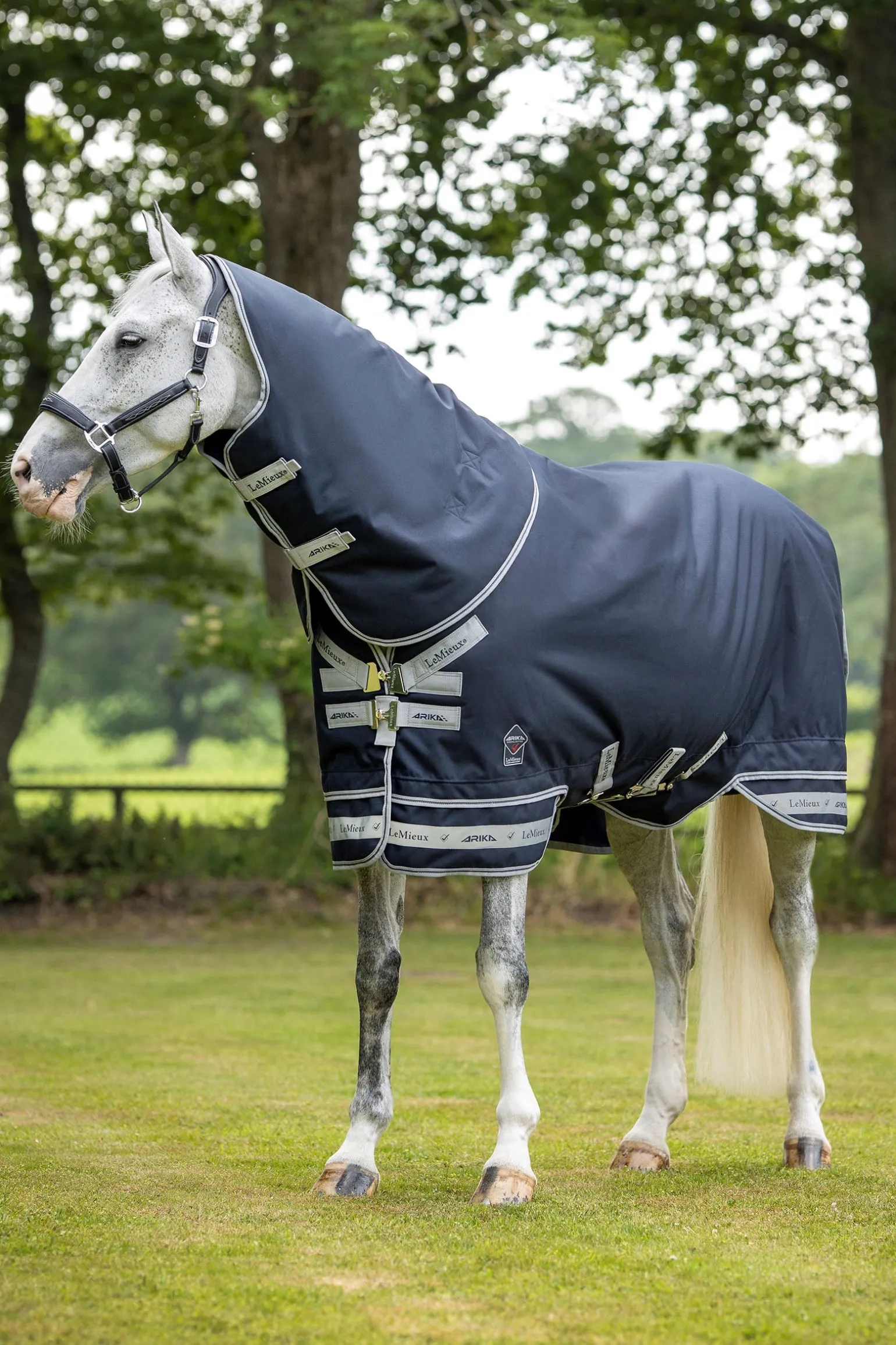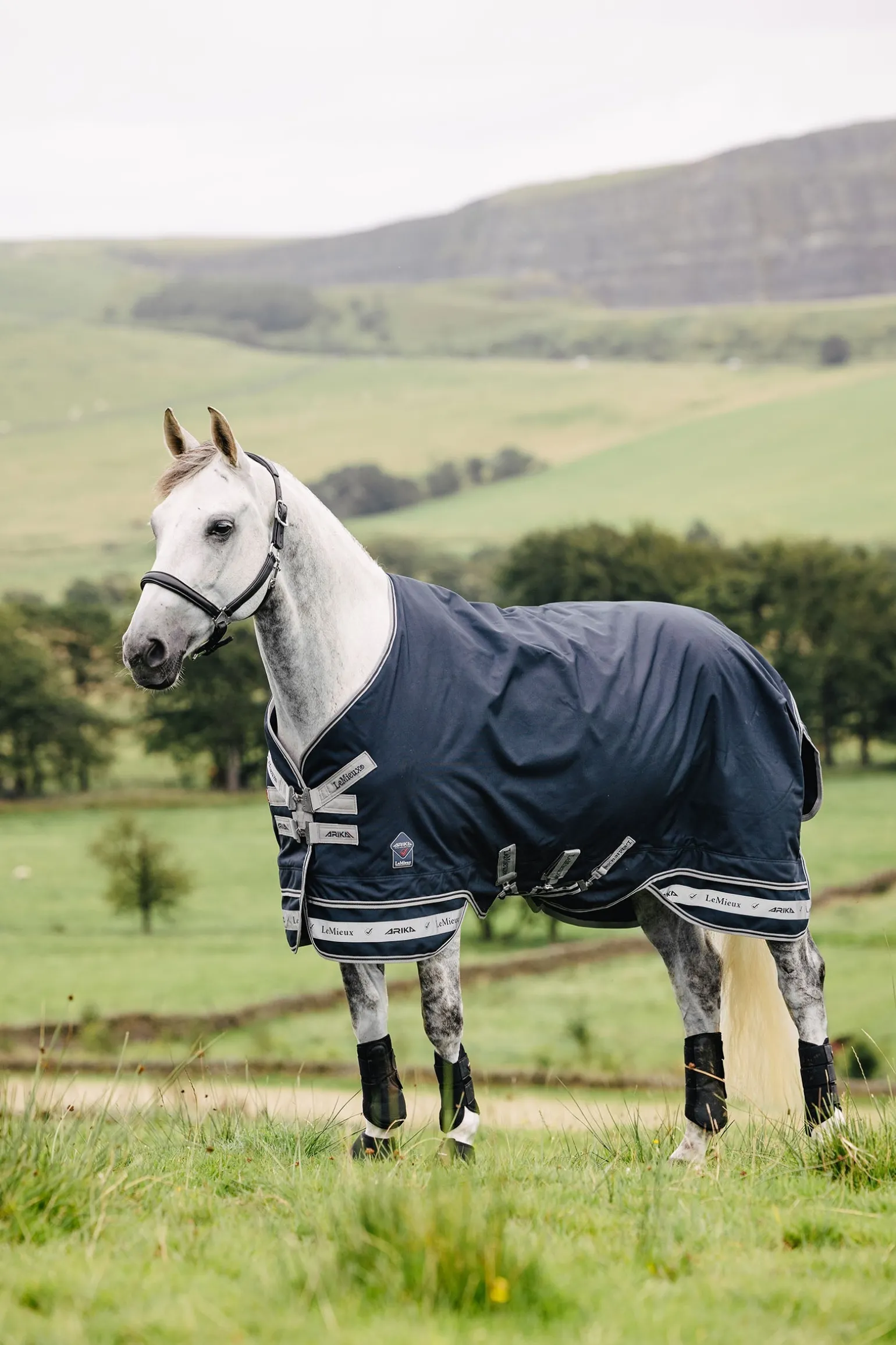 Diese technische, selbstaufrichtende Weidedecke ist leicht und fachmännisch gestaltet, um dein Pferd im Freien trocken und geschützt zu halten. Das einzigartige, atmungsaktive und wasserdichte 1200-Denier-Außenmaterial ist über die gesamte Breite zugeschnitten, wodurch Undichtigkeiten vermieden werden und keine Rückennaht notwendig ist. In Kombination mit einem antibakteriellen, antistatischen Innenfutter mit Glanz-Effekt bleibt die Decke perfekt ausbalanciert auf deinem Pferd. Die 50g thermoverklebte Füllung schützt vor leichter Kälte und bietet angenehme Wärme, ohne zu verrutschen oder zu verklumpen. Für optimale Sicherheit sorgt ein designgeschützter Frontverschluss. Der obere von zwei robusten T-Bars ist in einem Winkel von 45° angebracht, um den Druck am Schulterpunkt zu verringern und Komfort sowie Bewegungsfreiheit zu gewährleisten. Dank der Sandwich-Konstruktion aus anti-fusselndem Klettband kannst du sicher sein, dass die Decke nicht verrutscht. Traditionelle Decken, die den Pferdekörper umschließen, erzeugen Spannungen im Schulter- und Hinterbeinbereich, was die Bewegungsfreiheit einschränken und Scheuerstellen verursachen kann. Der weltweit patentierte, zweiteilige Rock bricht diese Spannung, ermöglicht freie Bewegung, hält die Wärme und schützt den Pferdekörper vor Spritzwasser. Gekreuzte Bauchgurtstrippen mit einem abnehmbaren Mittelgurt sorgen für sicheren Halt. Reflektierende Sicherheitsstreifen gewährleisten, dass dein Pferd bei schlechten Lichtverhältnissen gut sichtbar ist. Ein silikonüberzogener Schweifriemen hält alles sauber und ordentlich, während eine extra lange Schweifabdeckung die Oberseite des Schweifs schützt. Die Decke wird mit einem abnehmbaren Halsteil geliefert und ist mit der gesamten LeMieux-Produktpalette an Deckenlinern, Brustlatz und Halsteilen kompatibel, was dir über die Jahreszeiten hinweg maximale Flexibilität bietet.