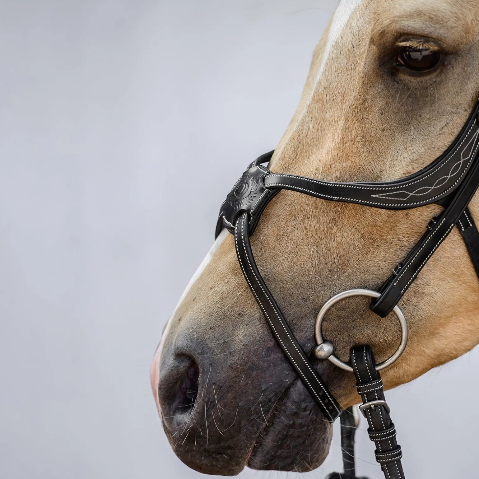 Der untere Riemen des Reithalfters ist geschwungen, um einen anatomisch perfekten Sitz um die Nase zu gewährleisten. Er ist an den Wangenknochen weich gepolstert, um Scheuerstellen zu vermeiden und hat als stilvolles Detail das PS-Logo dezent in das Leder gestanzt.