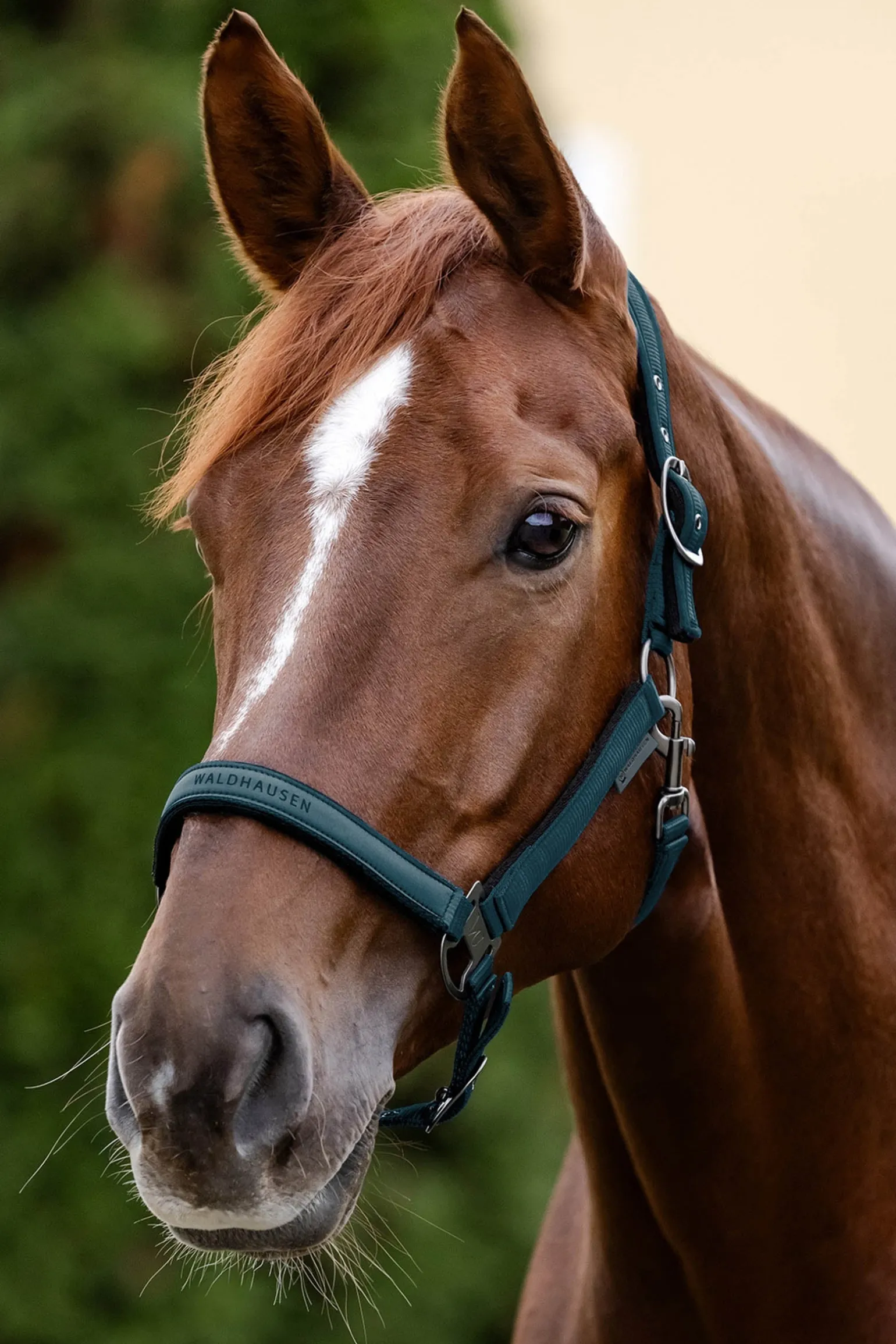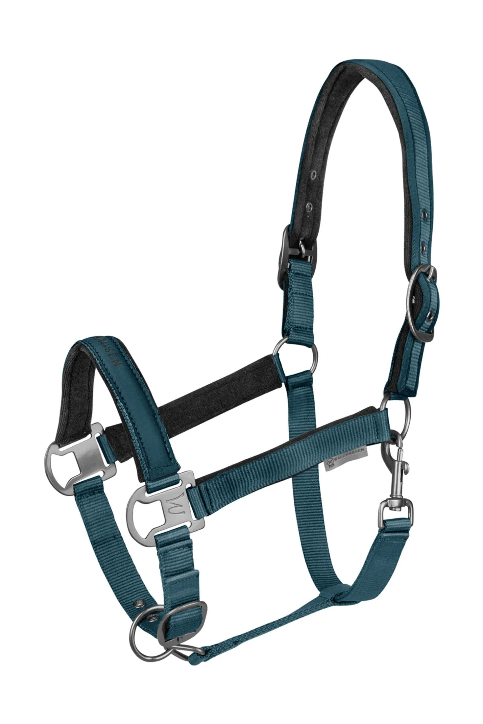 Hochwertiges Halfter mit weicher Polsterung im Nacken- und Nasenbereich, sowie an den Backenstücken. Anatomisches Genickstück für angenehmen Tragekomfort. Mehrfache Verstellbarkeit an Kinnriemen und Genickstück. Mit silber/grauen Metallbeschlägen.