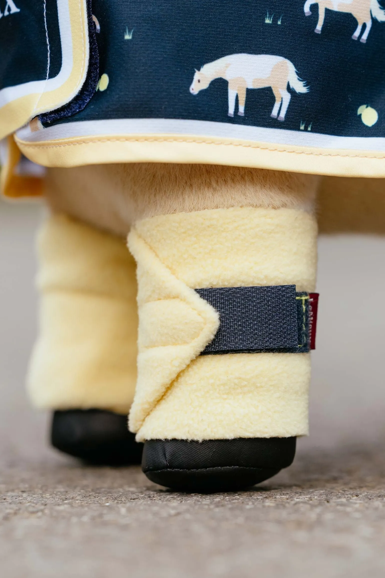 Luxuriöse Fleecebandagen mit Klettverschluss für das Spielzeugpony Lemon (Artikel-Nr. NR842). Weitere Zubehörteile: Decke aus Fleece (Artikel-Nr. 11GGA) und Halfter mit Führstrick (Artikel-Nr. UKGEX).