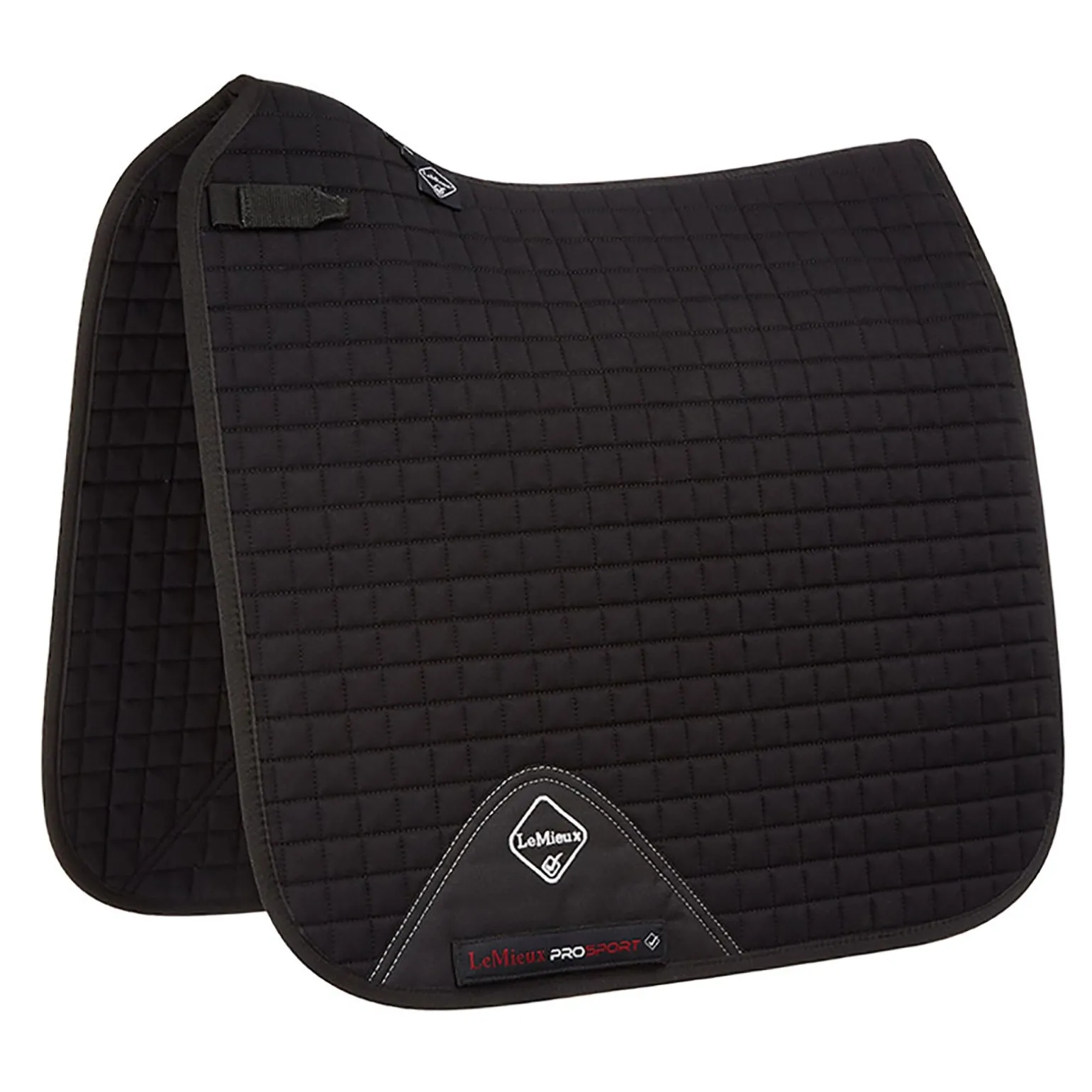 Modisches und strapazierfähiges Pad für maximale Leistung des Materials, für das tägliche Training oder Turniereinsätze geeignet. Premium Baumwolle außen und Fütterung für Temperaturregelung und Atmungsaktivität. Klassischer Dressur-Schnitt mit hohem Widerrist, elastischen D-Ringen & Gurt-Schutz mit innen versteckten Schlaufen um ein Rutschen zu verhindern. Gut in der Maschine zu waschen.