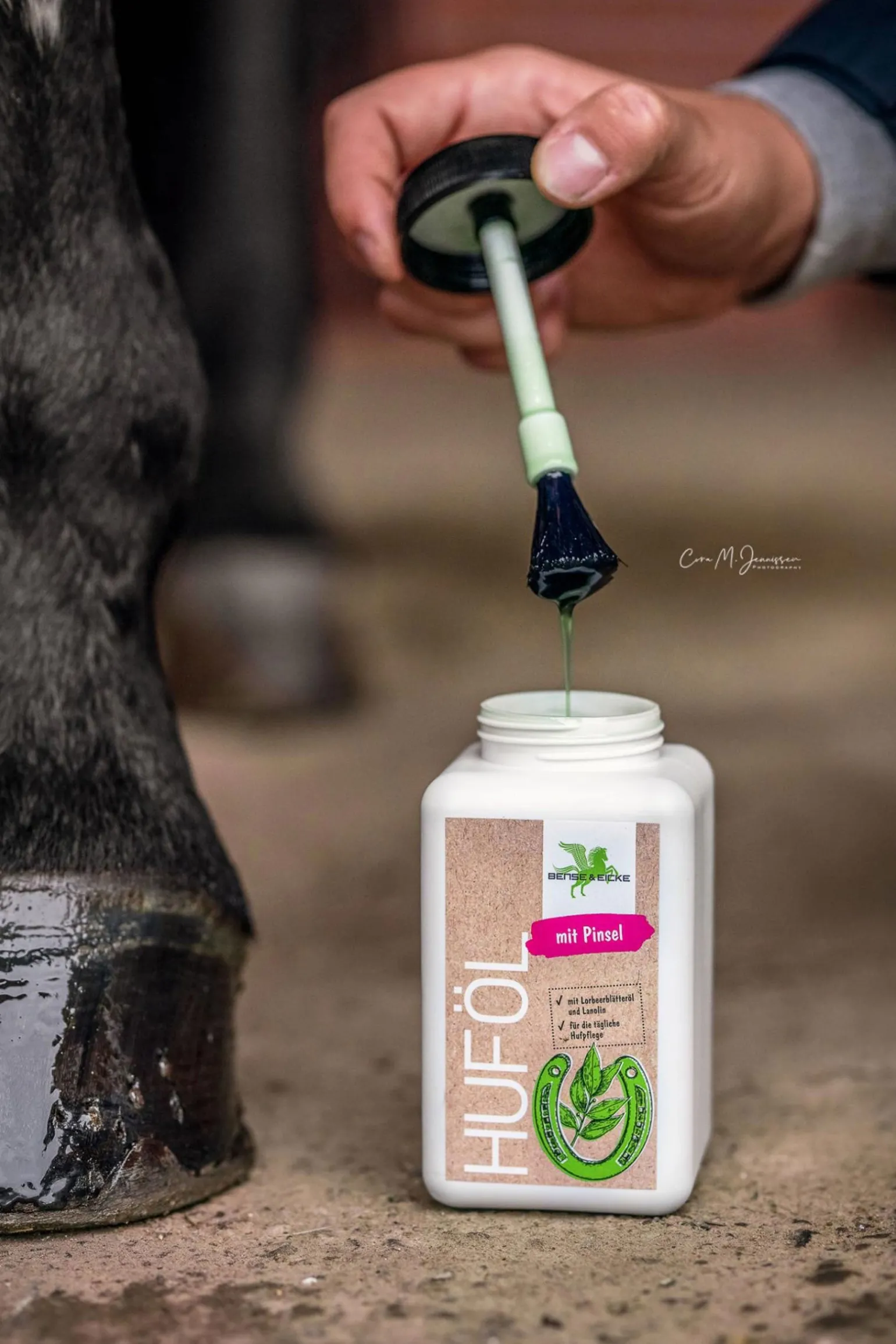 Anwendung: Nach der Hufreinigung mit dem Pinsel auf die äußere Hufwand und den Kronrandbereich auftragen. Die tägliche Anwendung bringt Schutz und Pflege für den Huf. Enthält: Hochwertige Öle, Lorbeeröl, Lorbeerblätteröl, Lanolin.