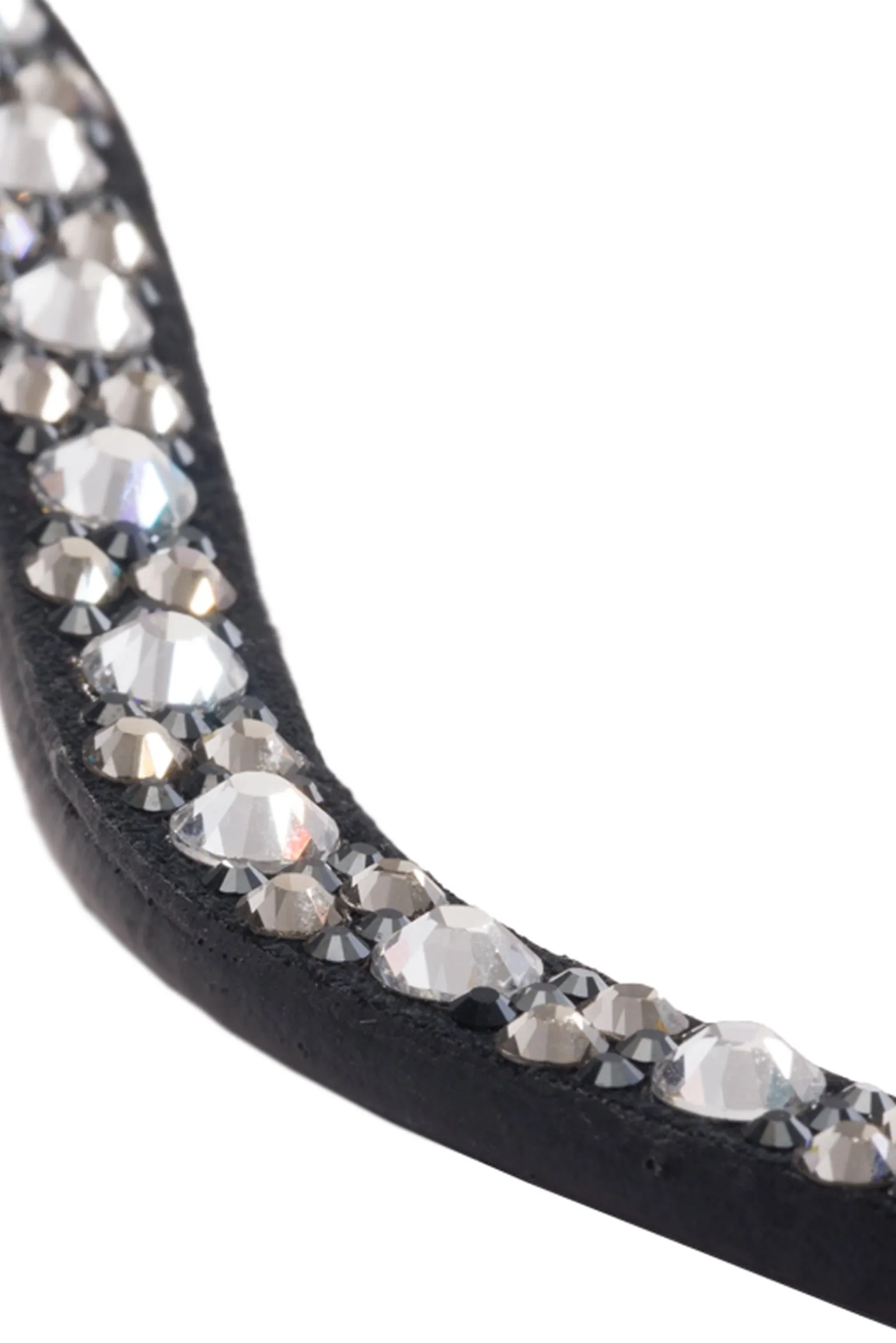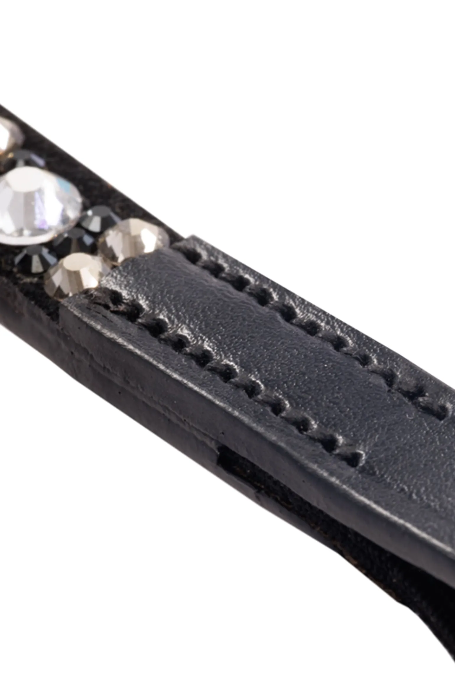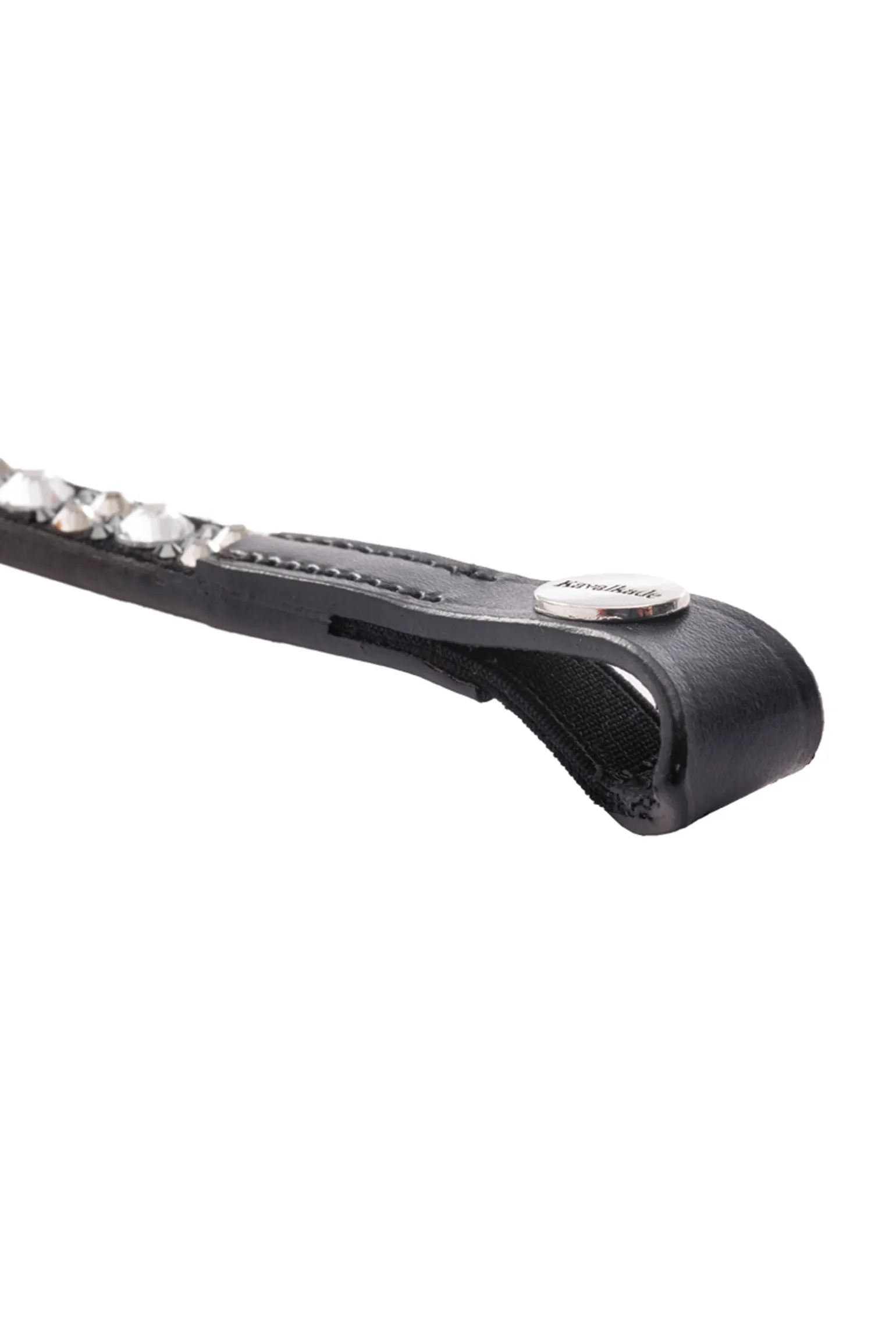 Der gebogene und schmale Stirnriemen „Blaze“ verfügt über kleine und große schwarze, graue und weiße Strasssteine. Das Besondere: Der Stirnriemen hat auf den Seiten eine elastische Schlaufe, sodass er sowohl für schmale als auch für breite Kopfstücke wie Weymouth-Trensen verwendet werden kann. Zudem liegt das elastische Material flacher am Kopf des Pferdes an und führt so zu weniger Druck an den Seiten des Kopfes.