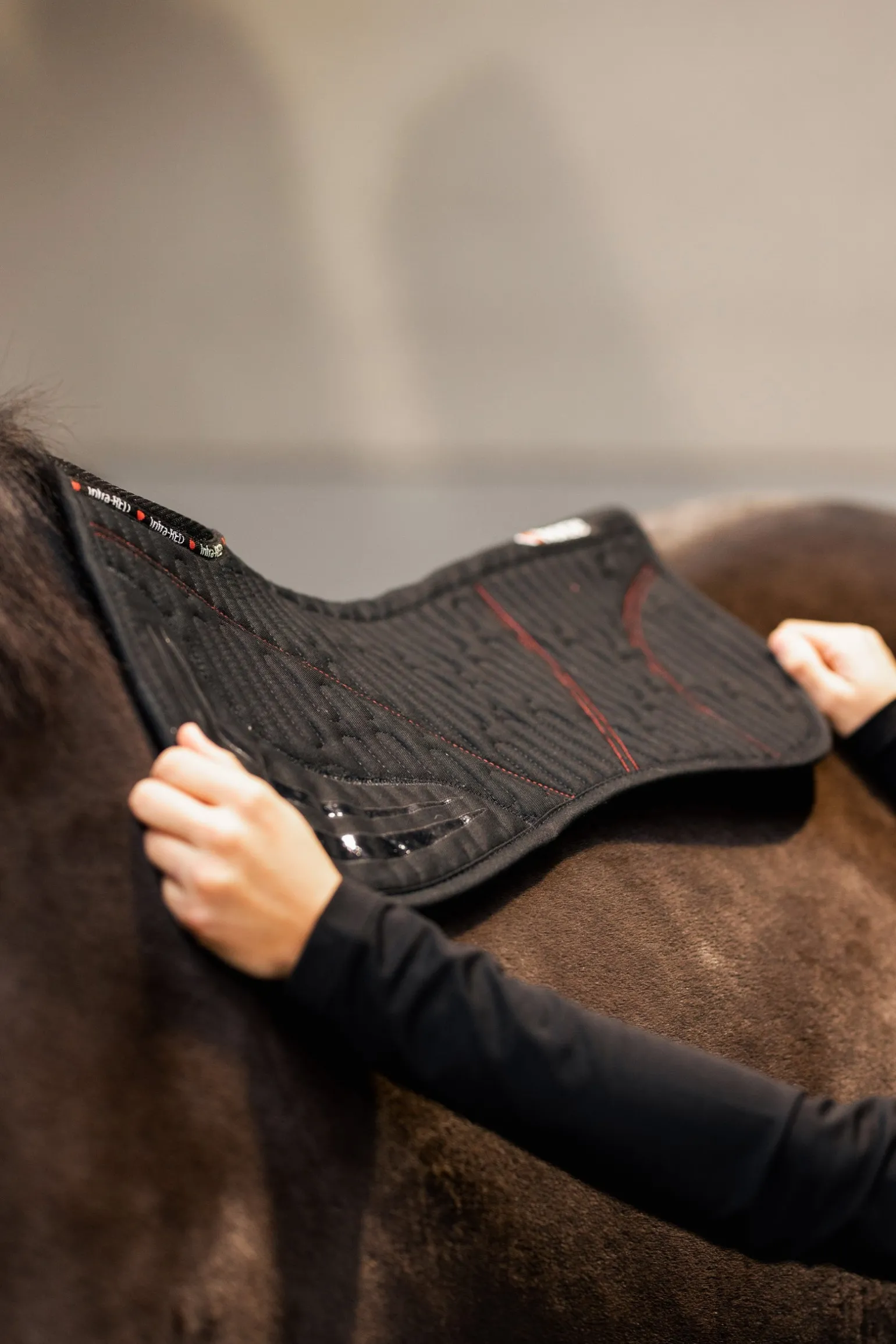 Die in den Stoff eingewebten keramischen Nanopartikel absorbieren die Energie des Pferdekörpers und geben Ferninfrarotstrahlen mit einer Wellenlänge von 8~12μm an den Körper des Tieres ab. Die Infrarotstrahlung kann tief in das Gewebe eindringen und die Wassermoleküle anregen, was wiederum zu einer Wärmeabgabe führt, die die Blutgefäße erweitert und so die Blutzirkulation und den Stoffwechsel steigert, wodurch auch die Muskeln geschmeidig werden.