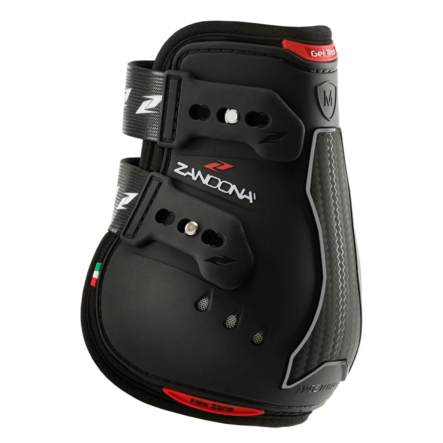 Das zu 100 % in Italien hergestellte Schutzsystem “CARBON AIR FIT Fetlock“ wurde entwickelt, um Springpferde vor Aufprall und Hämatomen an den vorderen Fesseln und einem Teil des Schienbeins zu schützen und gleichzeitig Halt für die Sehnen zu bieten. Es besteht aus einer äußeren TPU-Struktur mit differenzierter Dicke, atmungsaktiv dank des per – forierten Neoprens und belüftet mit 6 Lüftungsöffnungen. Zwischen der äußeren TPU-Struktur und dem Neoprenschutz befindet sich Gel-Tech, das, wenn nötig, als Stoßdämpfer und ansonsten als bequemes Polster dient. Kohlenstofffaser Elemente sind unter der Schale thermisch zu isolieren die Gelenke von der Wärme, die durch äußere Reibung erzeugt, bei gleichzeitiger Erhöhung der mechanischen Festigkeit gegen Stöße. Auf der äußere, zum langen Fesselknochen hin geschlossen, wurde eine Flex-Zone geschaffen, die nötig ist, um dem Bein maximale Bewegungsfreiheit zu geben. Die elastischen Bänder mit Schnellöffnern wurden für einen sicheren Verschluss kalibriert, der eigentlich aus einem doppelten Verschlusssystem besteht (horizontal/vertikal). Die Maße und die absolut ergonomische Form wurden als ge – naue Kopie der Beinstruktur entwickelt, was eine perfekte Positionierung garantiert und jegliche Spannung vermeidet.