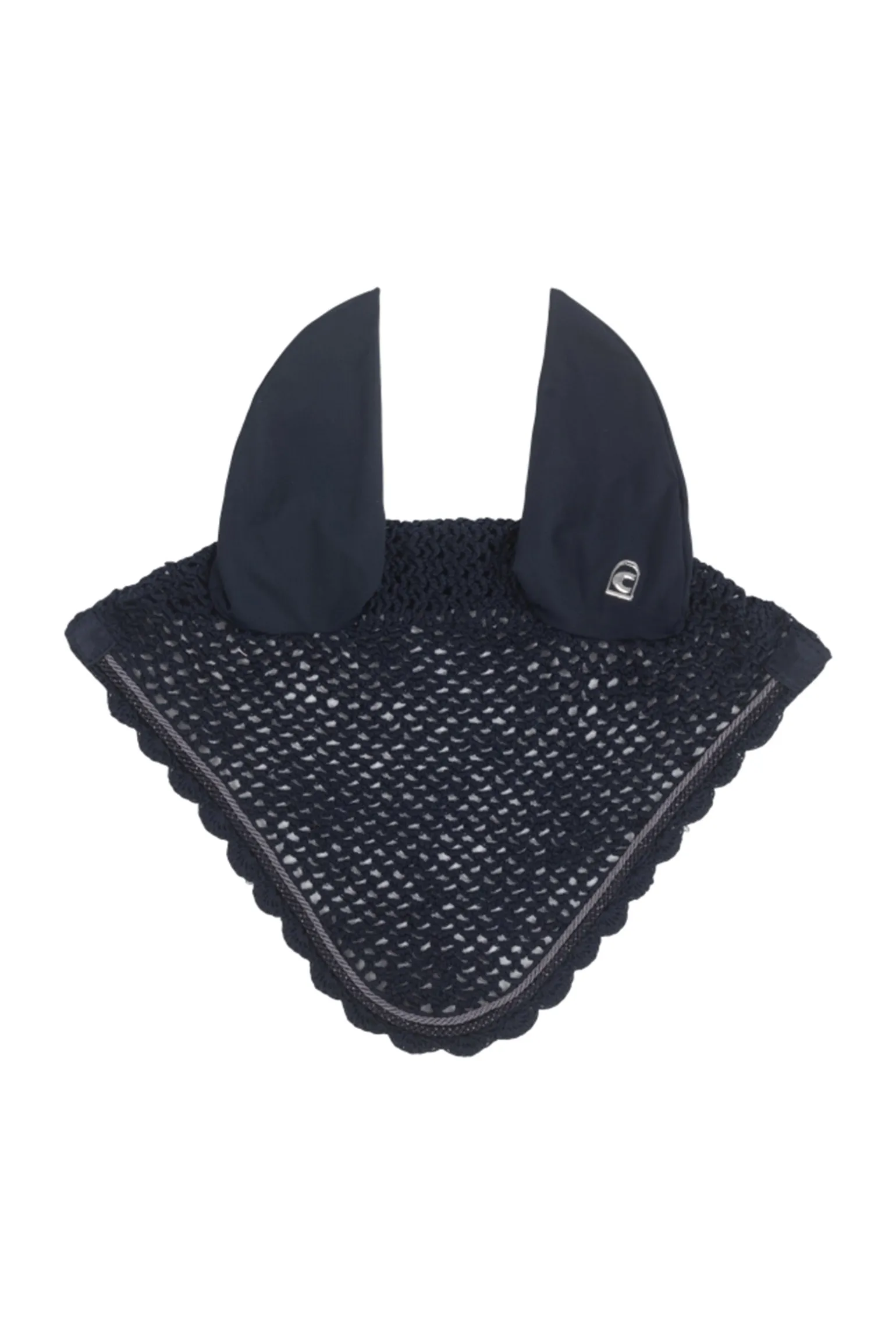 Das linke Ohr ist mit dem Cavallo Steigbügellogo bedruckt. Kopfbereich in Häkeloptik. Zwei kleine, kontrastfarbige Kordeln rahmen die Fliegenohren ein.