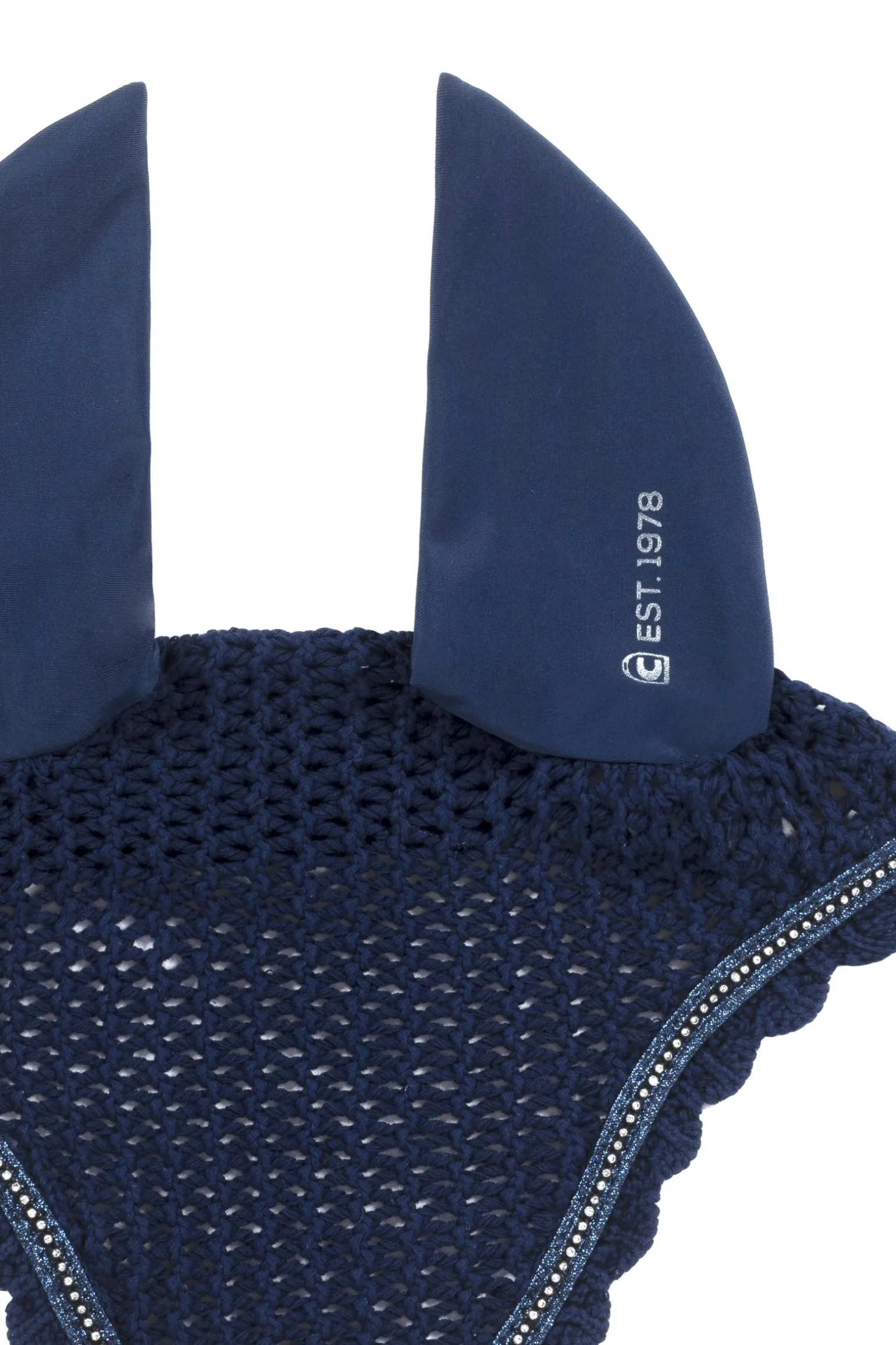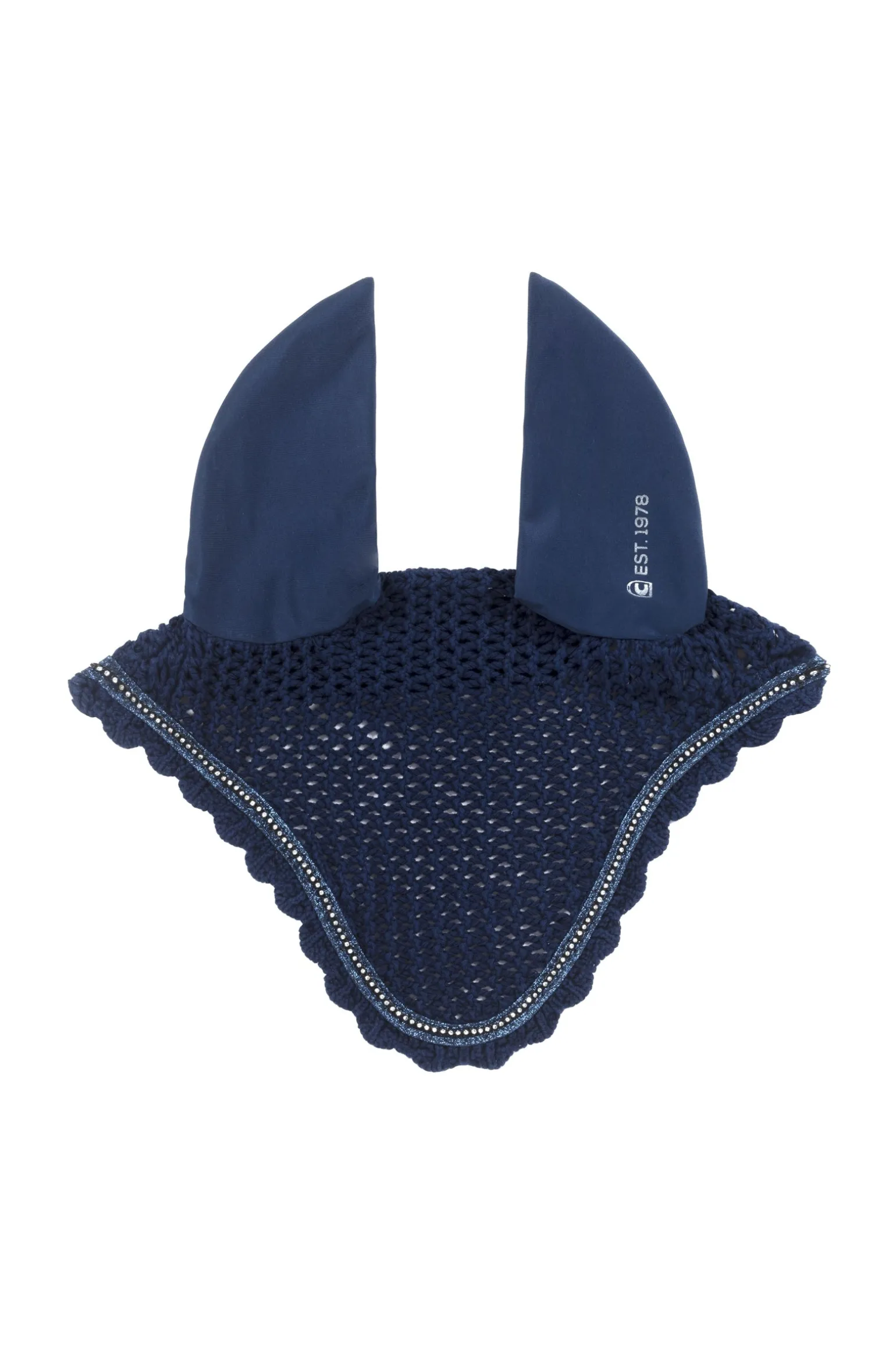 Fliegenohren aus schnell trocknendem, hautfreundlichem Funktionsjersey. Das linke Ohr ist mit einem Cavallo Schriftzug in Gunmetal Optik bedruckt.Kopfbereich in Häkeloptik.Eingefasst mit zwei Tapes und einem Kristallband in der Mitte.Diese Verzierung rahmt die Fliegenohren perfekt ein und macht sie zu einem echten Hingucker.