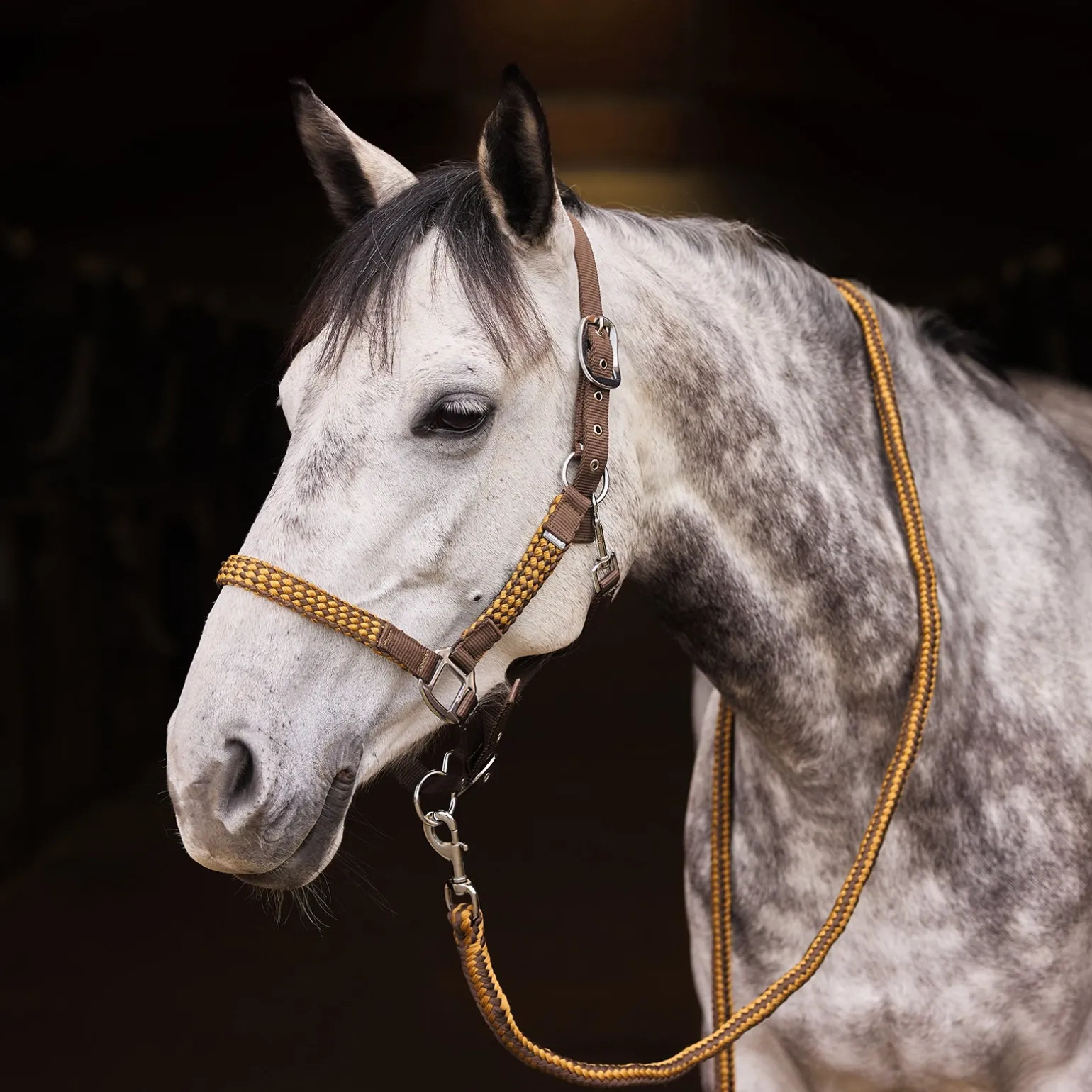 Geflochtene Backen- und Nasenriemen sorgen bei diesem Halfter und Führstrick Set für einen schönen Touch. Das geflochtene Muster wiederholt sich im Führstrick. Verstellbarer Genick- und Nasenriemen bieten eine perfekte Passform.