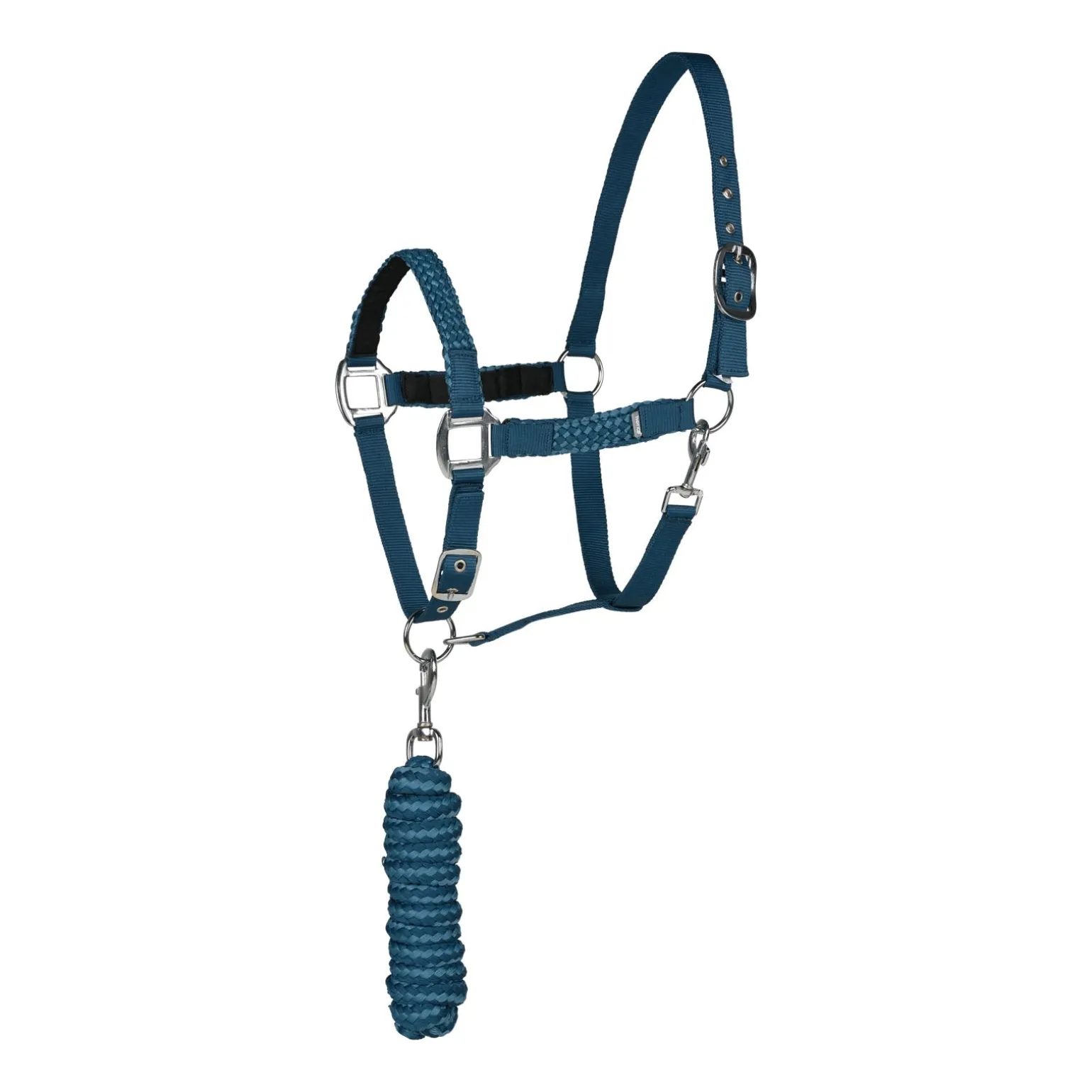 Geflochtene Backen- und Nasenriemen sorgen bei diesem Halfter und Führstrick Set für einen schönen Touch. Das geflochtene Muster wiederholt sich im Führstrick. Verstellbarer Genick- und Nasenriemen bieten eine perfekte Passform.