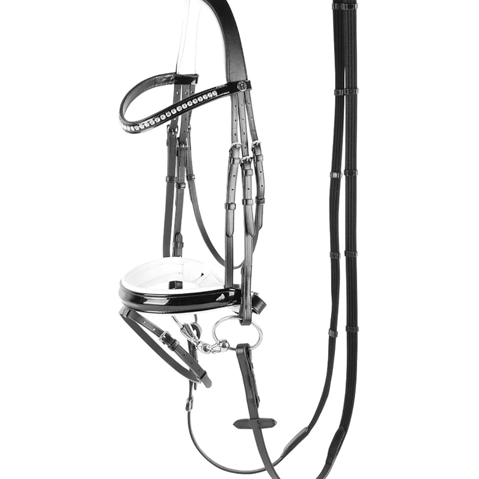 Luxuriöse Trense aus hochwertigem Leder mit weiß unterlegtem Nasenriemen (4 cm) und wellenförmigem Stirnriemen mit AB-Kristallen. Verdeckte Schließen. Inklusive Gurtzügel.