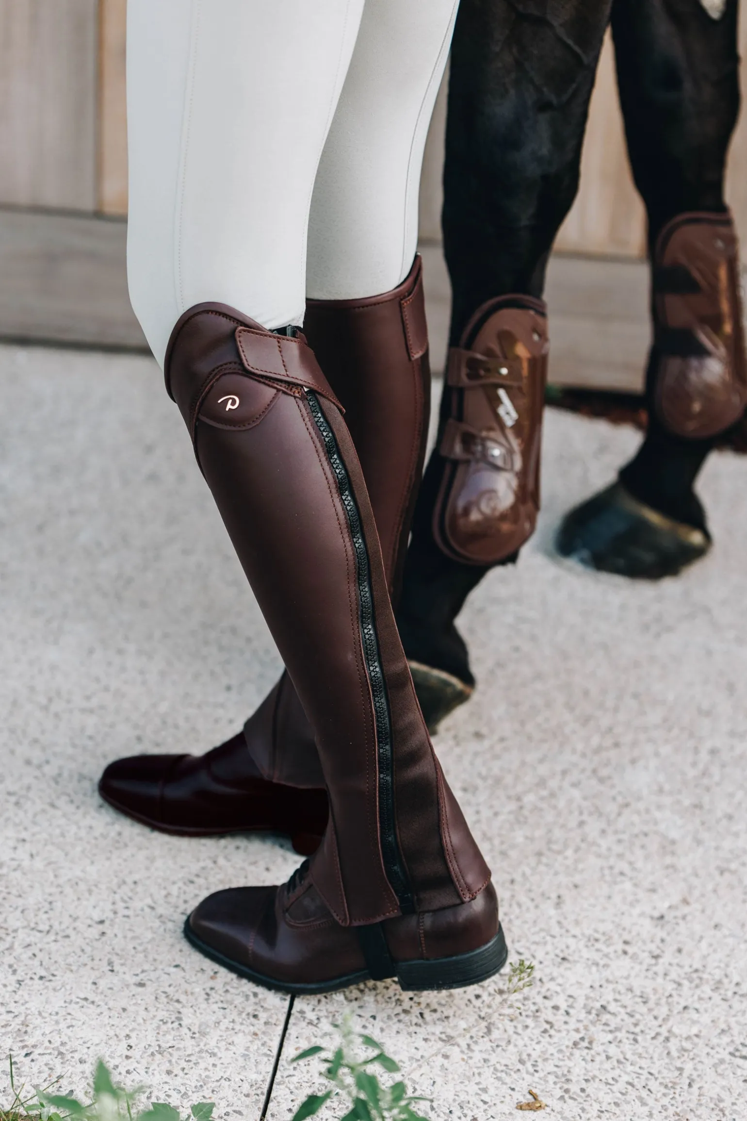 Erlebe Komfort und Langlebigkeit mit den Classic Comfort Chaps. Gefertigt aus glattem Kalbsleder, sind diese Chaps sorgfältig verarbeitet und auf dauerhafte Performance ausgelegt – ein unverzichtbarer Teil deiner Reitausrüstung für das tägliche Training. Der seitliche Reißverschluss mit Druckknopfverschluss garantiert einfaches und sicheres An- und Ausziehen. Elastikeinsätze unter dem Knie und am Fuß sorgen für eine bequeme, eng anliegende Passform und verbessern dein Reitgefühl. Die Schutzlasche über dem Reißverschluss ist mit YKK-Klettverschluss aus eingespritztem Kunststoff ausgestattet und unterstützt Stabilität und Kontrolle beim Reiten.