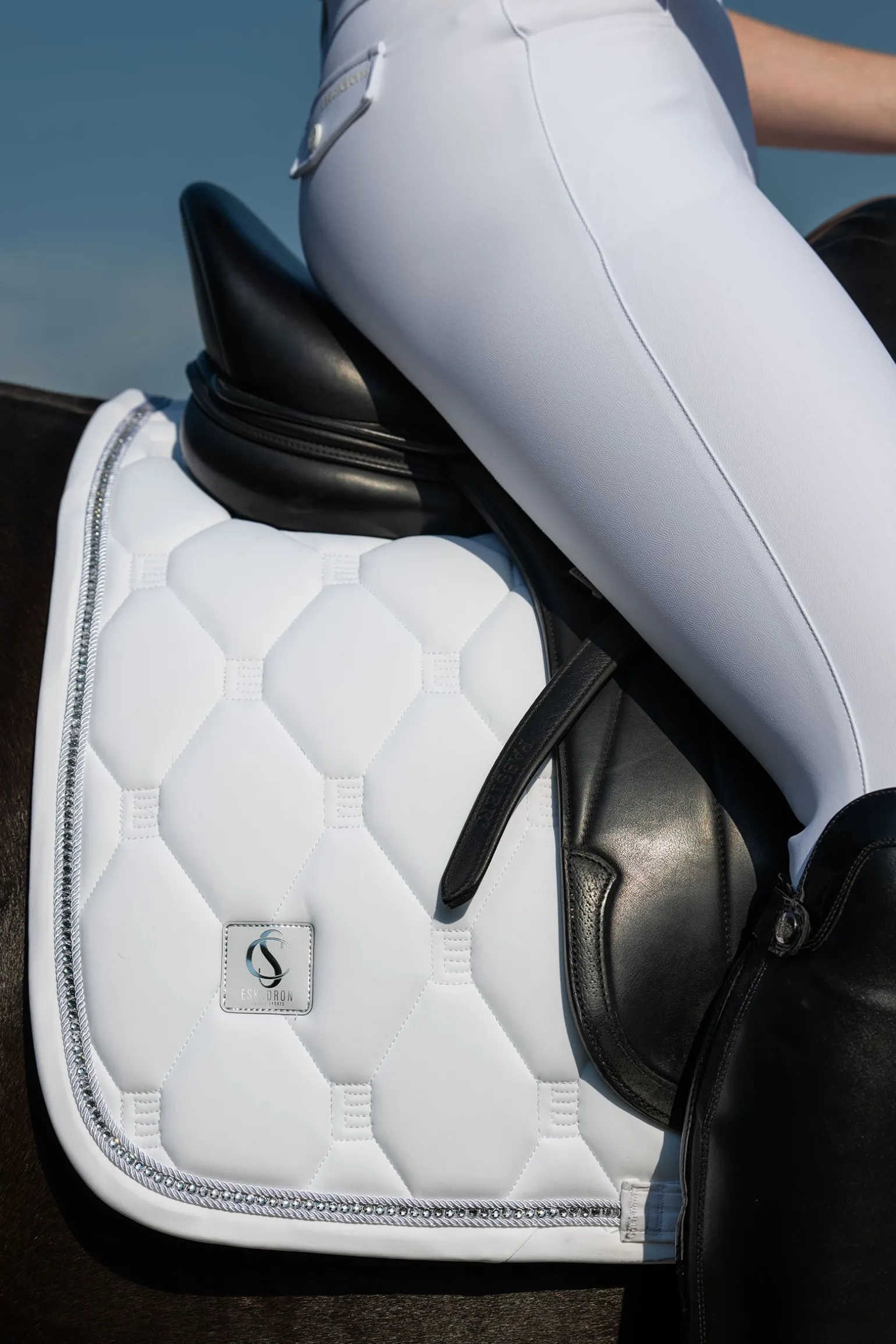Die Eskadron Classic Sports SS25 Softshell Crystal Vielseitigkeitsschabracke vereint Innovation und Eleganz. Die robuste Softshell-Oberfläche mit kühl-trockener Innenseite sorgt für optimalen Komfort und Feuchtigkeitsregulierung. Die elegante E-Steppung verleiht eine edle Optik, während rutschfeste Silikonflächen im Sattelbereich für zusätzliche Stabilität sorgen. Die stilvolle Kombination aus Kordel und Kristallkordel auf der Softshell-Einfassung setzt luxuriöse Akzente. Das Classic Sports Emblem und das Flaggenlabel auf beiden Seiten vervollständigen das Design. Für optimale Luftzirkulation sorgt der Mesh-Rückenkanal. Das Innostrap-System gewährleistet eine sichere Frontfixierung, während der Gurtriemen mit dreifacher Befestigungsmöglichkeit eine präzise Positionierung erlaubt. Eine exklusive Wahl für den täglichen Reiteinsatz.