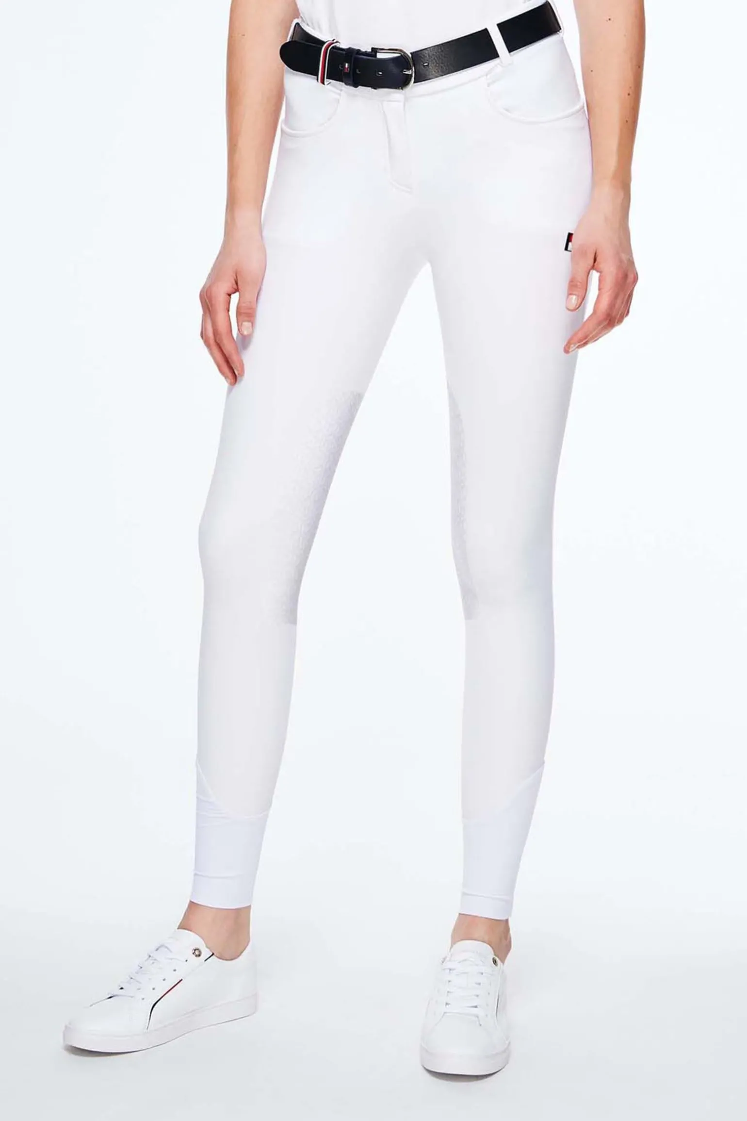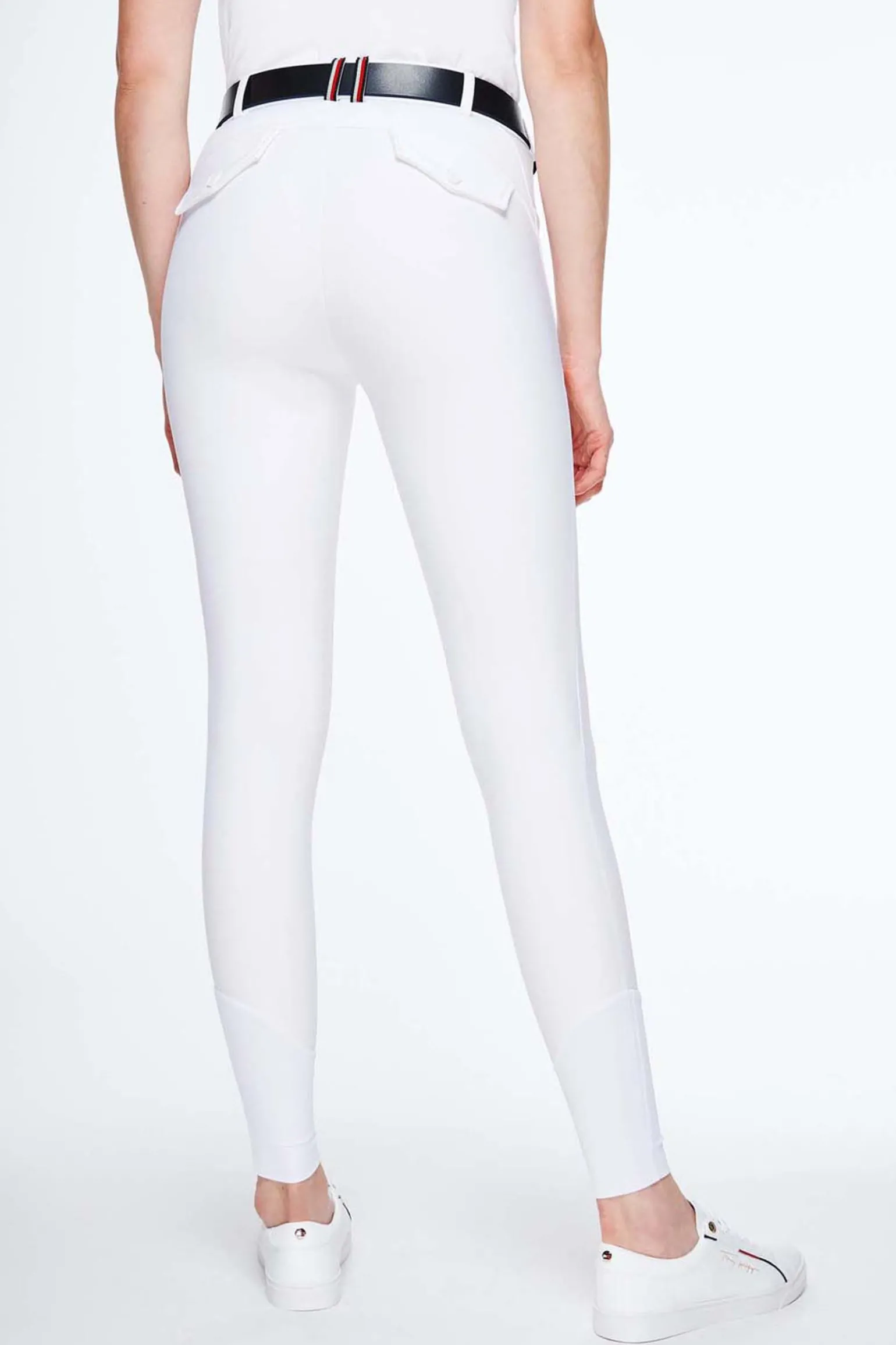 All-Season Kneegrip Reithose von Tommy Hilfiger mit zwei Jeans Taschen vorne und zwei Attrappen-Klappentaschen mit Knopf hinten. Die Reithose besitzt einen Beinabschluss aus elastischem Jersey für einen bequemen Einstieg und einen Bund Verschluss vorne mit Haken und zusätzlichem Safety-Button. Es gibt eine Logo Stickerei vorne seitlich unterhalb des Bundes, sowie eine TH Global Stripe Applikation auf einer Gurtschlaufe vorne und auf den zwei Mittleren hinten.