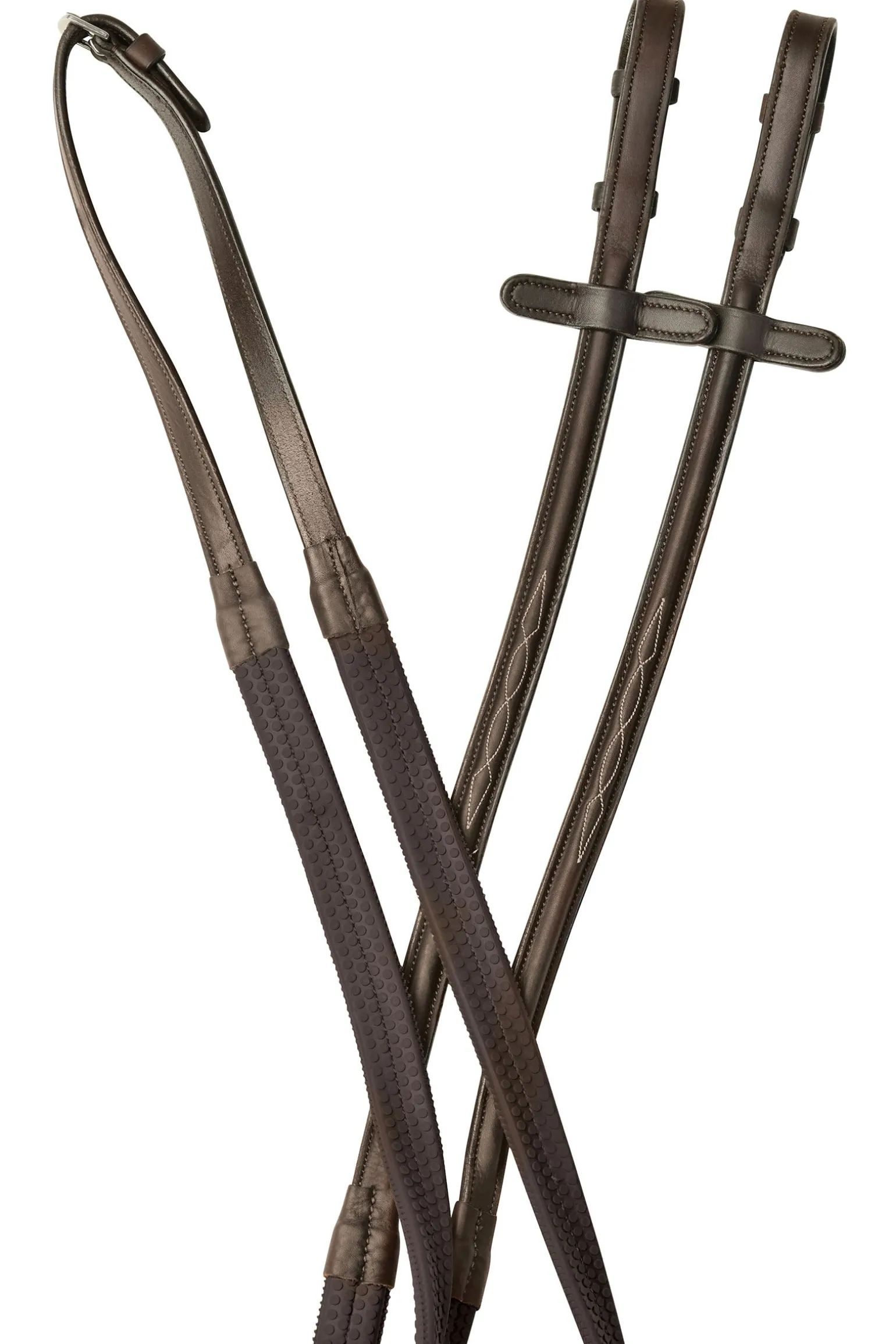 Gefertigt aus feinstem europäisch und indisch gegerbtem Leder, fühlen sich diese Zügel besonders weich und geschmeidig an – für optimalen Komfort deines Pferdes. Elegante weiße Nähte, erhabenes Leder und das charakteristische Fancy Stitch Design machen sie zum idealen Match für das Luxury Fancy Stitch Padded Hanoverian Bridle. Der weiche Gummigriff sorgt für zusätzlichen Halt und Stabilität. Robuste Beschläge aus rostfreiem Stahl sowie Lederstopper für Martingal- oder Brustpanzerringe runden das hochwertige Design ab.