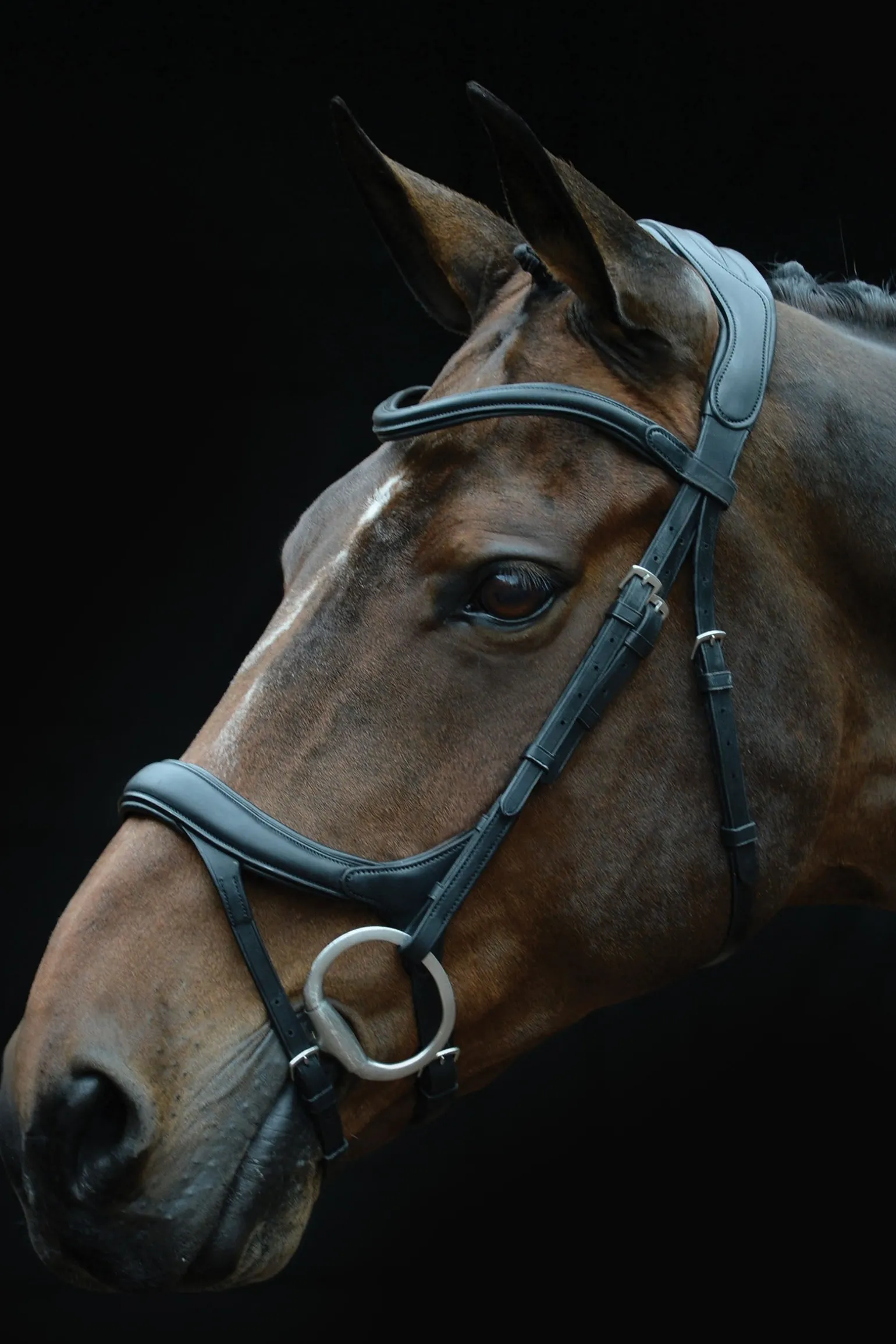 Der Collegiate ComFiTec Vogue Anatomical Bridle ist ein anatomisch geformter Zaum aus hochwertigem europäischem Leder mit einem gebogenen, gepolsterten Lederstirnband. Das anatomische Kopfstück ist durchgehend weich gepolstert und zwischen den Ohren des Pferdes breiter geformt, um den Druck gleichmäßig und bequem zu verteilen. Das gebogene Nasenstück ist so geformt, dass es alle empfindlichen Hauptgesichtsnerven umgeht und ultimativen Komfort und Schutz bietet. FEI & Pony Club (EA, DE und BD) zugelassen.
