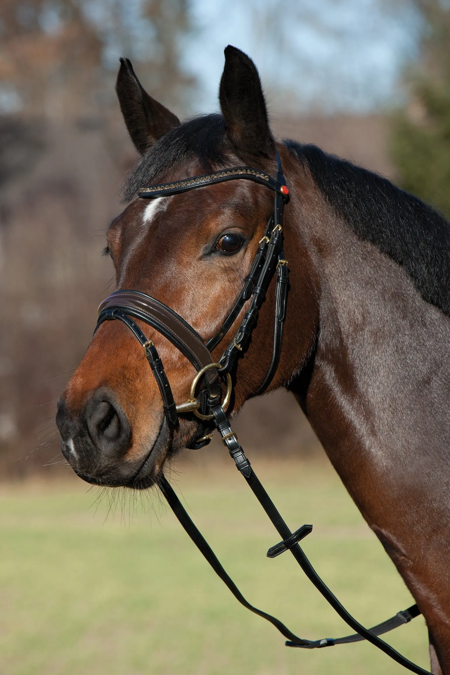 Luxuriöse, englisch kombinierte Trense mit Lack-Reithalfter.