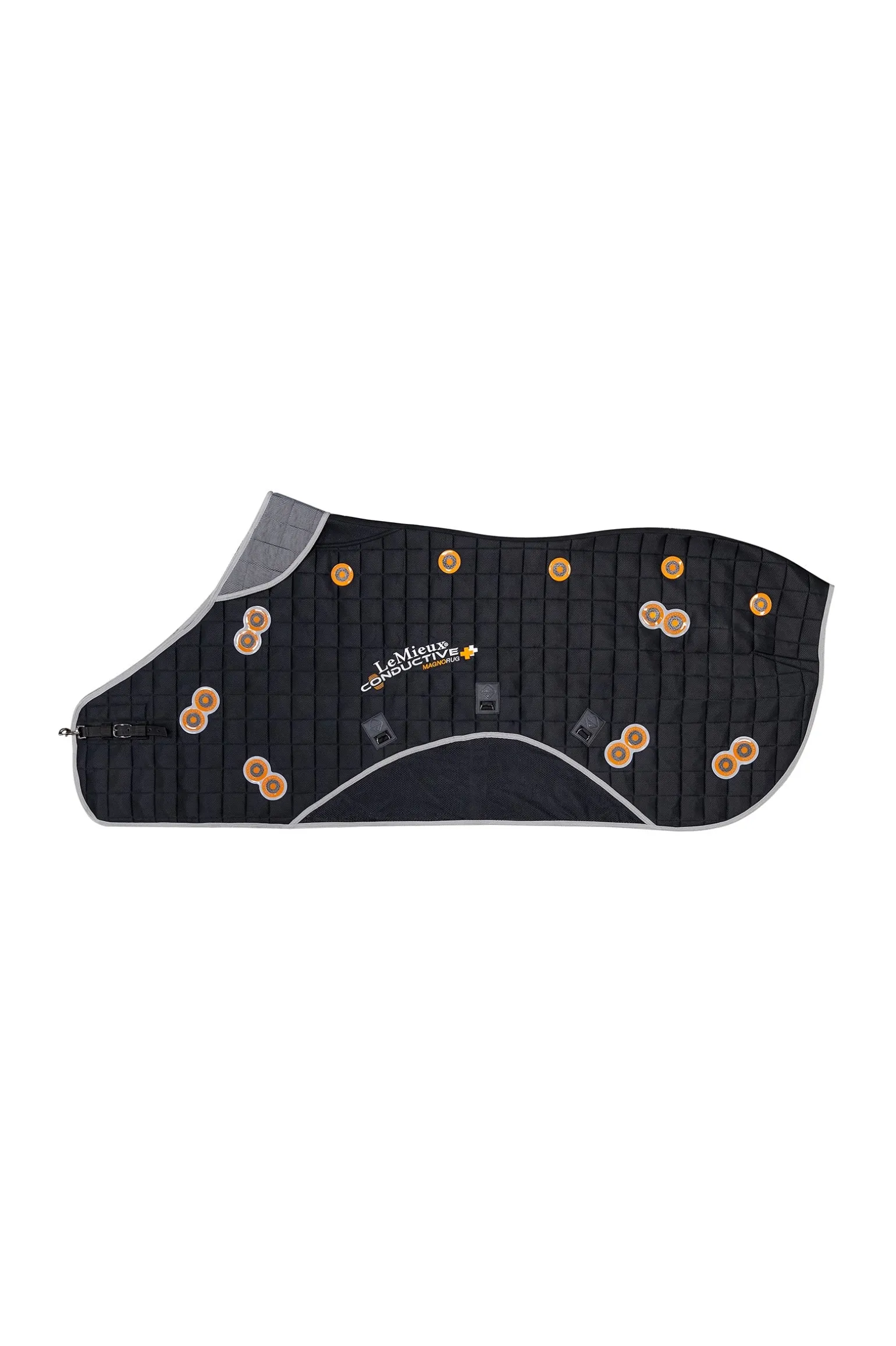 Die LeMieux Conductive Magno Rug läutet einen neuen Ansatz in der Magnettherapie ein. Einzigartige Innenschichten enthalten eine gewebte Schicht aus Stahlfasern direkt unter leistungsstarken 2600-Gauss-Doppelmagneten, die an Schlüsselstellen über Schulter, Ellenbogen, Hüfte, Kniegelenk, Oberschenkel und an beiden Seiten der Wirbelsäule platziert sind. Die Stahlfäden leiten die magnetischen Wellen gleichmäßig um das Futter herum und bringen so den gesamten Oberkörper in das Magnetfeld. Die atmungsaktive Oberseite aus 3D Mesh leitet die von den Magneten aufgestaute Wärme ab. Mit den 3-fach verstellbaren Bauchgurten kannst du die Decke gut an dein Pferd anpassen und so die optimale Magnetwirkung erzielen.