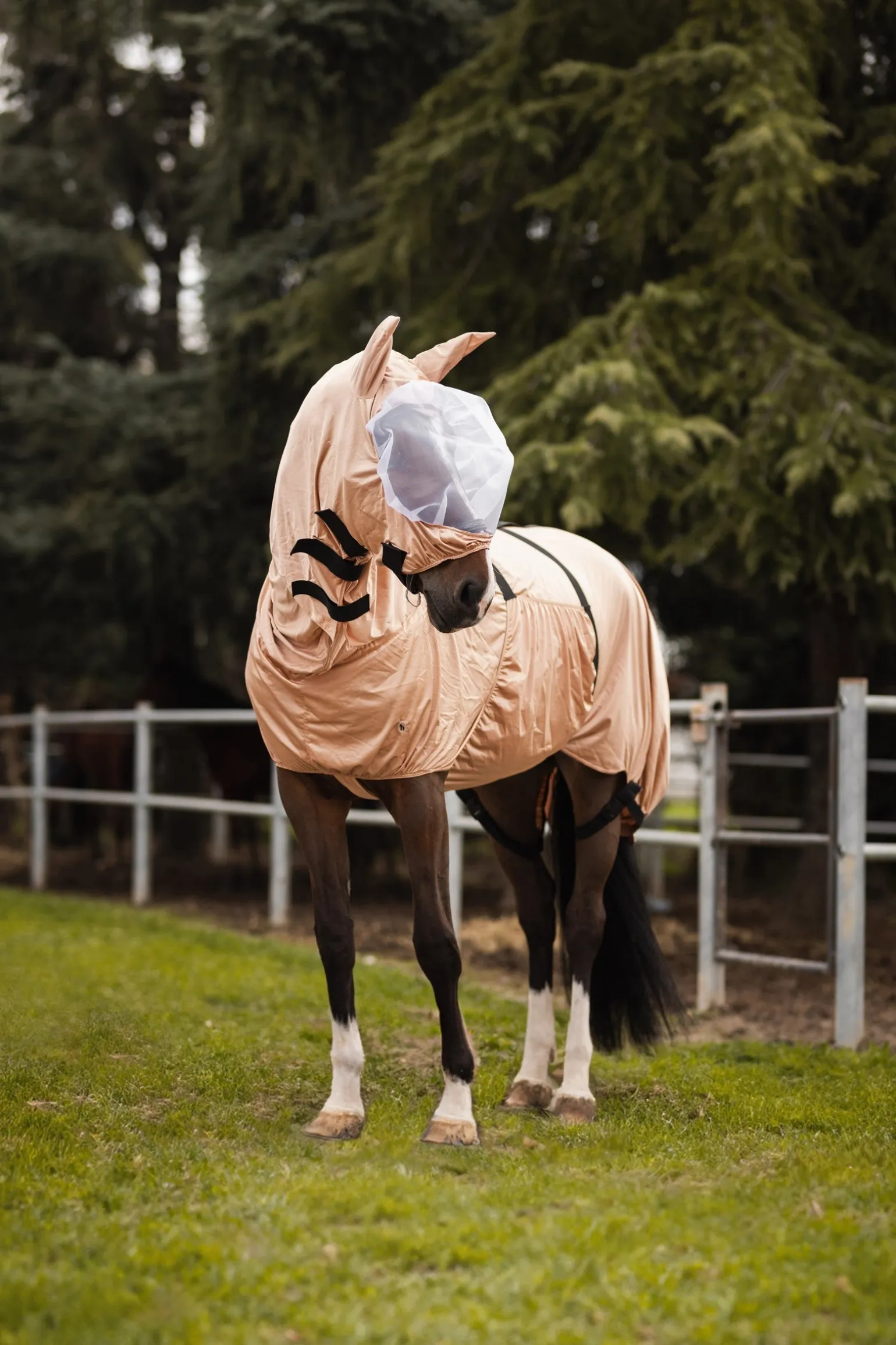 Die Horze Cover Ekzemerdecke sorgt für die Erholung von Sommerekzemen von Hals bis Schweif. UV-Stoff schützt dein Pferd vor der Sonne. Elastik am Hals sorgt für Komfort. Am Halsteil kann leicht eine Maske (#24874) befestigt werden. Der Bauchlatz ist mit Gurten einfach verstellbar und schließt mit einer Schnalle. Der Schweifriemen kann mit einem Klettverschluss befestigt werden. Elastik an den Beinen hält die Decke an ihrem Platz.