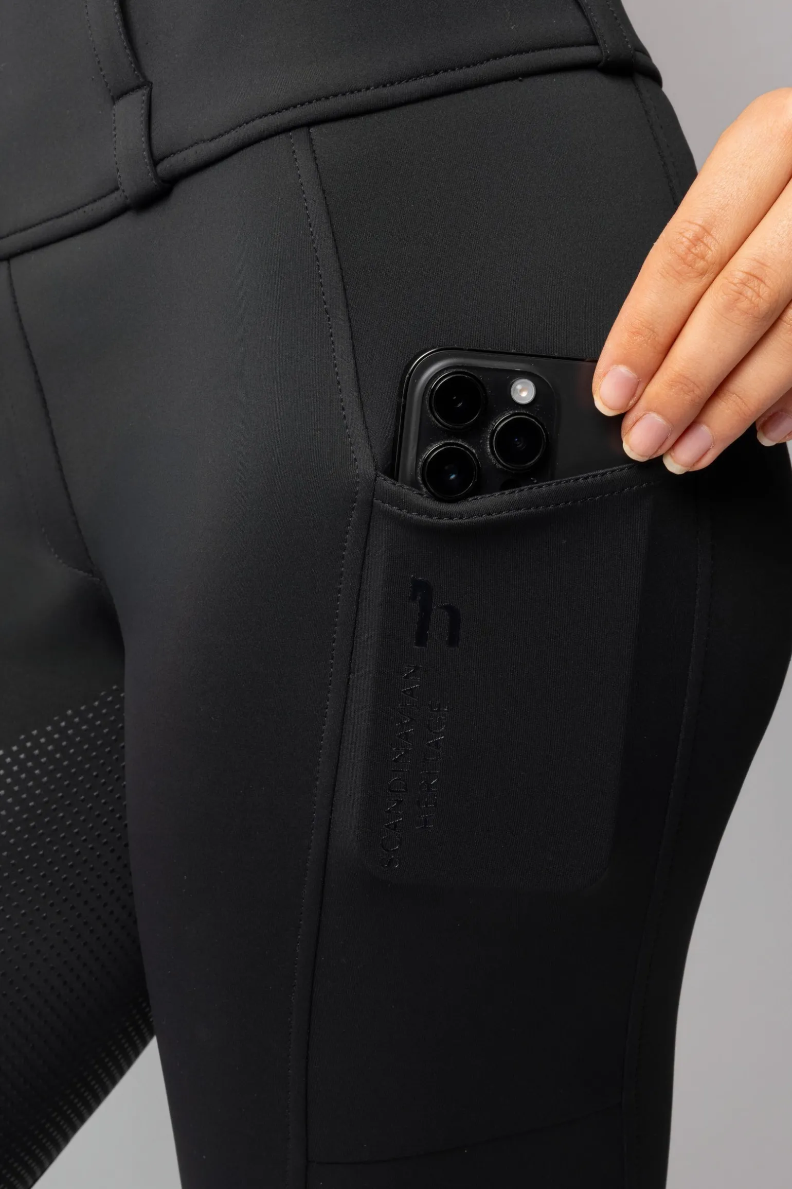 Diese leichte und atmungsaktive Vollbesatzreitleggings kombiniert Funktionalität und Komfort. Sie besteht aus atmungsaktivem Funktionsmaterial und sorgt für ein angenehmes Tragegefühl im Sattel. An den Oberschenkeln befinden sich spezielle Taschen für das Mobiltelefon, sodass es jederzeit griffbereit ist. Die angedeuteten Gesäßtaschen verleihen eine stilvolle Optik. Der Vollbesatz-Silikonprint bietet hervorragenden Halt im Sattel. Die Reithose ist pflegeleicht und mit praktischen Gürtelschlaufen ausgestattet.