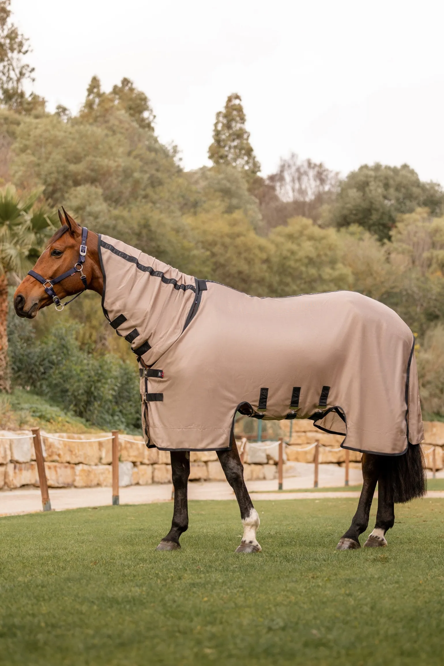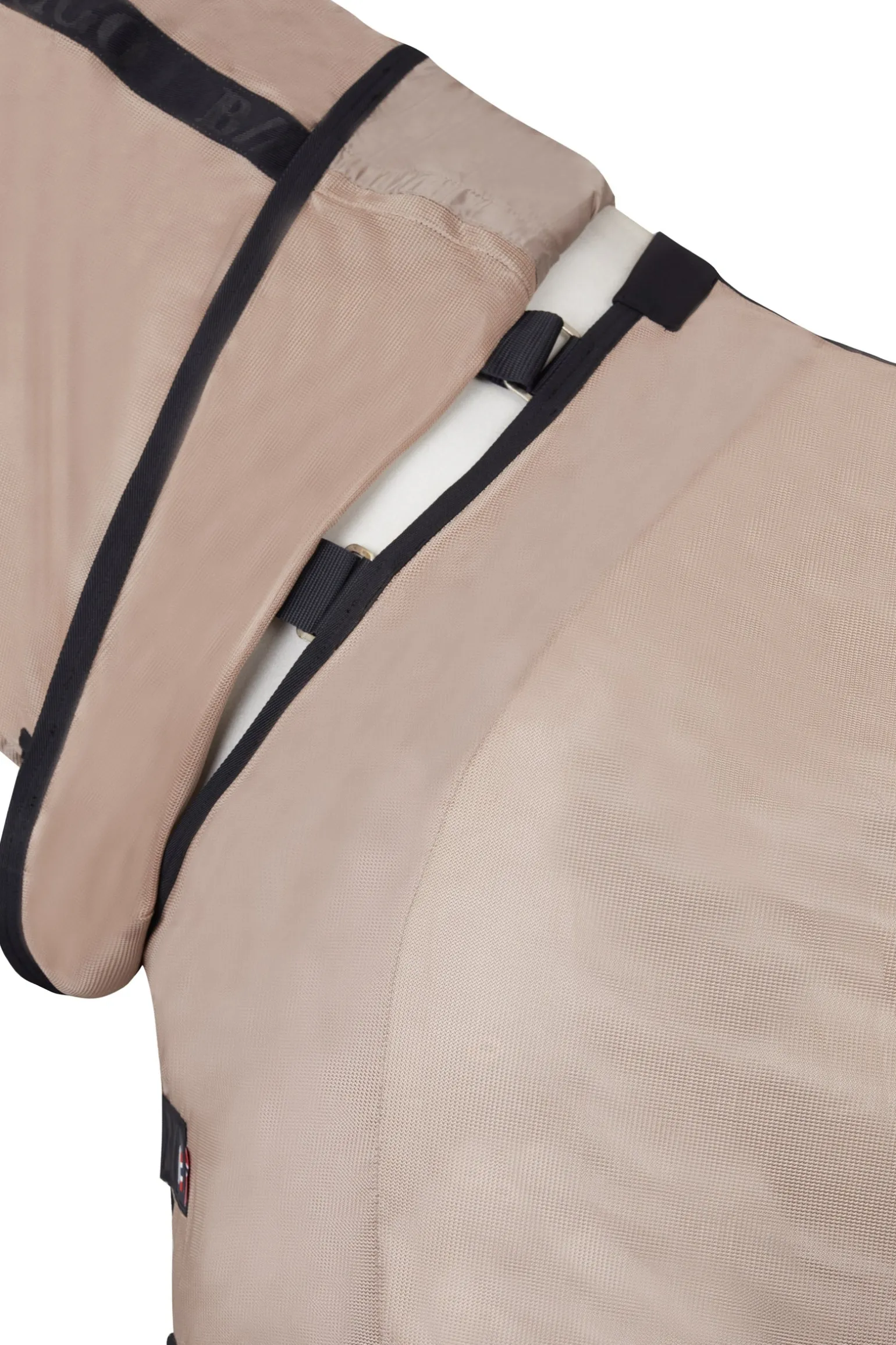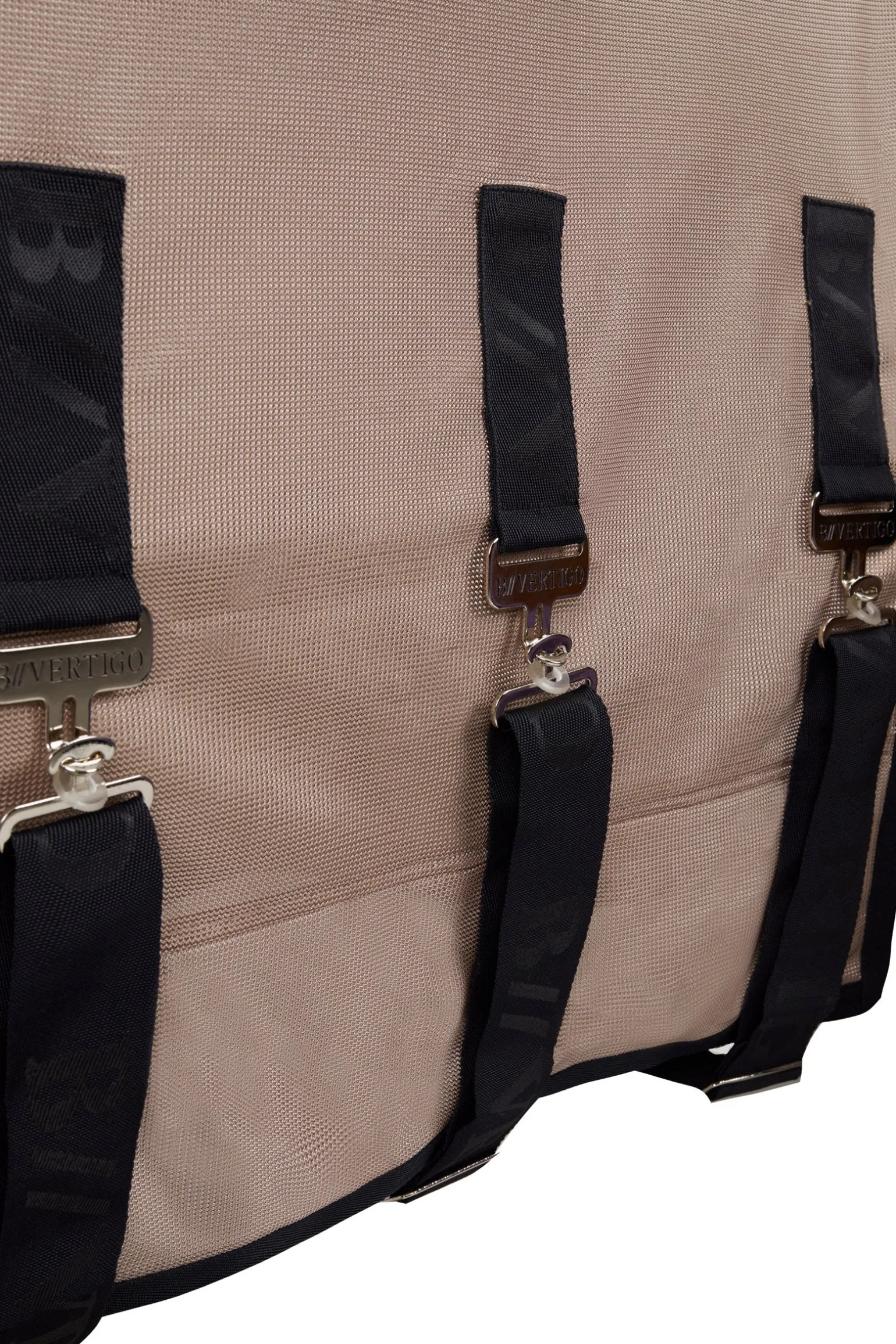 Die B Vertigo Delux Fliegendecke wird mit einem abnehmbaren Halsteil geliefert und bietet UV-Schutz und hält lästige Insekten fern. Der große Schweiflatz und der Bauchlatz bieten maximale Deckung und machen die Decke auch für empfindliche Pferde geeignet. Das Halsteil lässt sich mit Schlaufen und Klettverschluss an der Decke befestigen, ebenso wie das Halsteil geschlossen werden kann. Um Scheuerstellen zu vermeiden, sind Brust-, Schulter-, Mähnen- und Schweifbereich glatt gefüttert. Elegante Logo-Jaquardtape-Details sorgen für einen schlichten Blickfang, der den funktionalen Stil abrundet. 2 klassische Frontverschlüsse, 3 verstellbare, gerade Bauchgurte, Beinschnüre und ein Schweifriemen halten die Fliegendecke sicher an ihrem Platz.