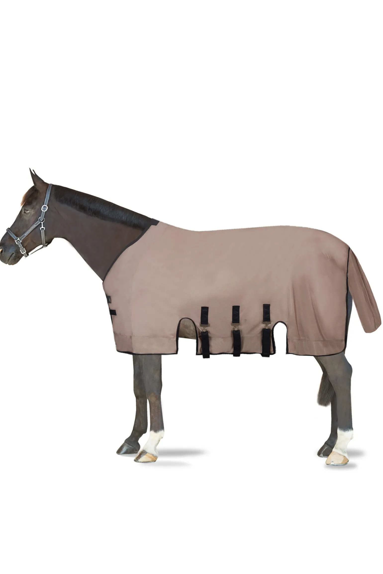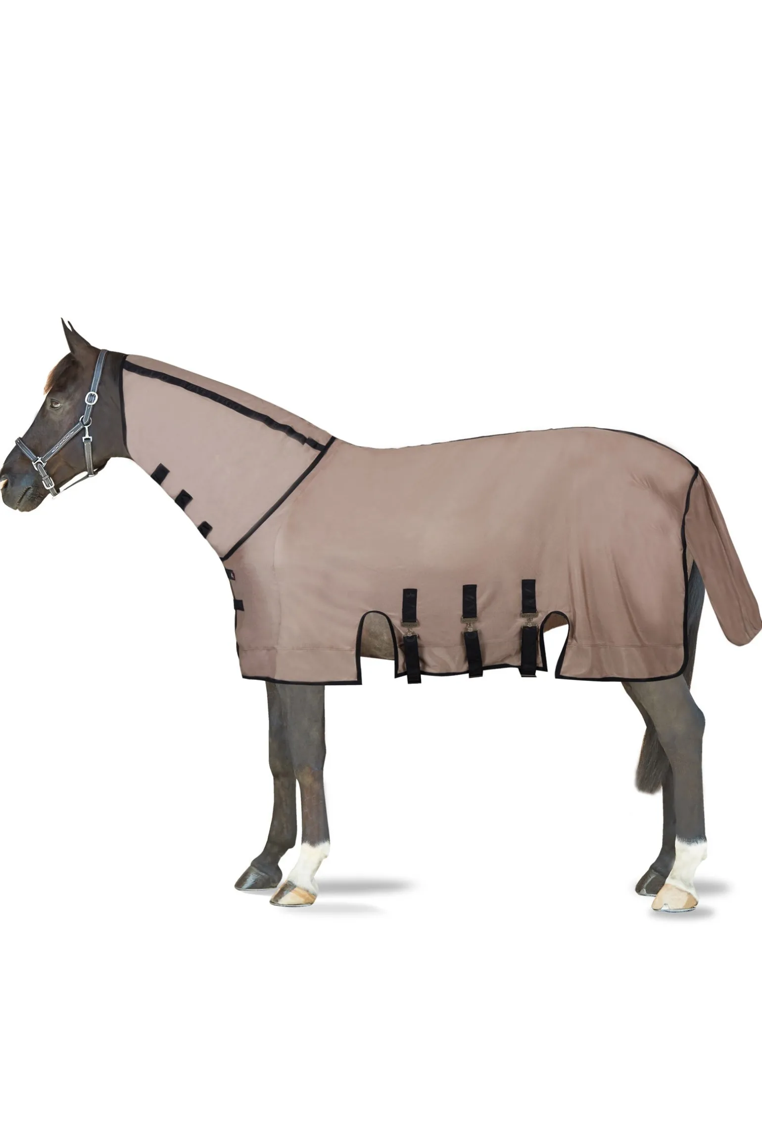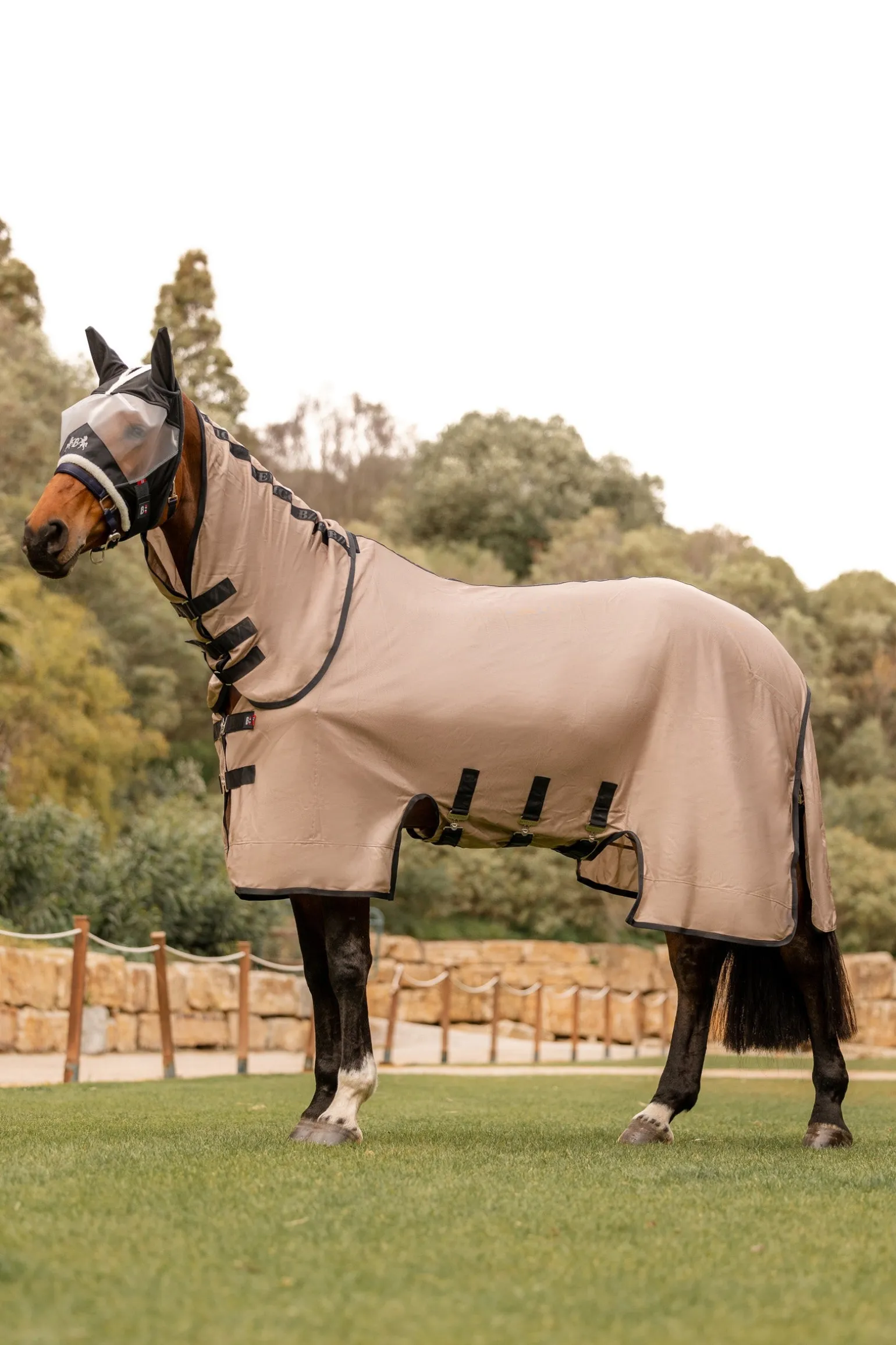 Die B Vertigo Delux Fliegendecke wird mit einem abnehmbaren Halsteil geliefert und bietet UV-Schutz und hält lästige Insekten fern. Der große Schweiflatz und der Bauchlatz bieten maximale Deckung und machen die Decke auch für empfindliche Pferde geeignet. Das Halsteil lässt sich mit Schlaufen und Klettverschluss an der Decke befestigen, ebenso wie das Halsteil geschlossen werden kann. Um Scheuerstellen zu vermeiden, sind Brust-, Schulter-, Mähnen- und Schweifbereich glatt gefüttert. Elegante Logo-Jaquardtape-Details sorgen für einen schlichten Blickfang, der den funktionalen Stil abrundet. 2 klassische Frontverschlüsse, 3 verstellbare, gerade Bauchgurte, Beinschnüre und ein Schweifriemen halten die Fliegendecke sicher an ihrem Platz.