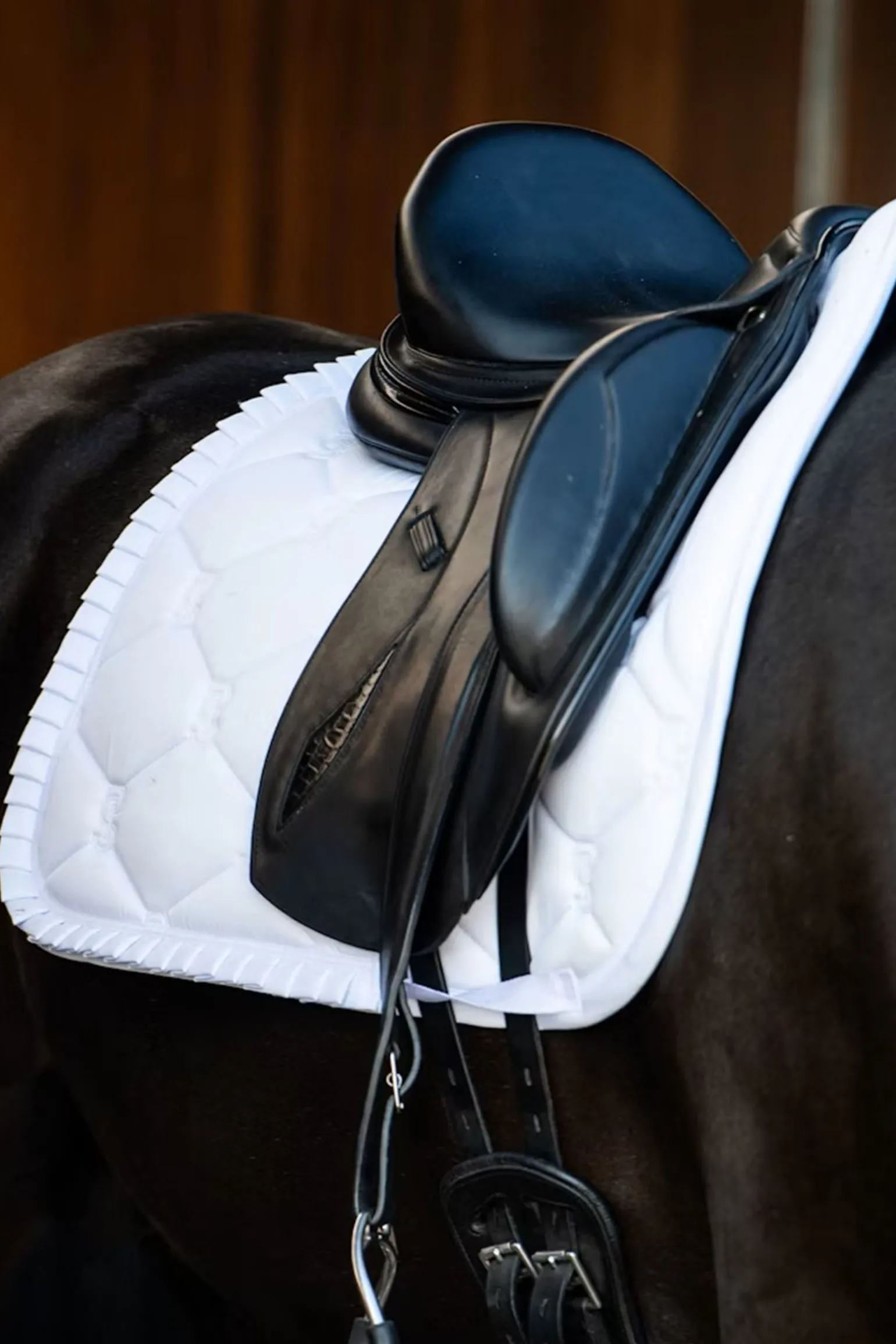 Anatomisch geformte Satteldecke mit einer Rüscheneinfassung und dem ikonischen PS-Zitat entlang der Wirbelsäule. Die Satteldecken haben zusätzlichen Platz am Widerrist und einzigartige Stopp-Polster, die die Satteldecke unter dem Sattel an Ort und Stelle halten. Die Unterseite besteht aus schnell trocknendem Material, das Feuchtigkeit transportiert und antibakteriell ist, und die Oberfläche ist schmutzabweisend.