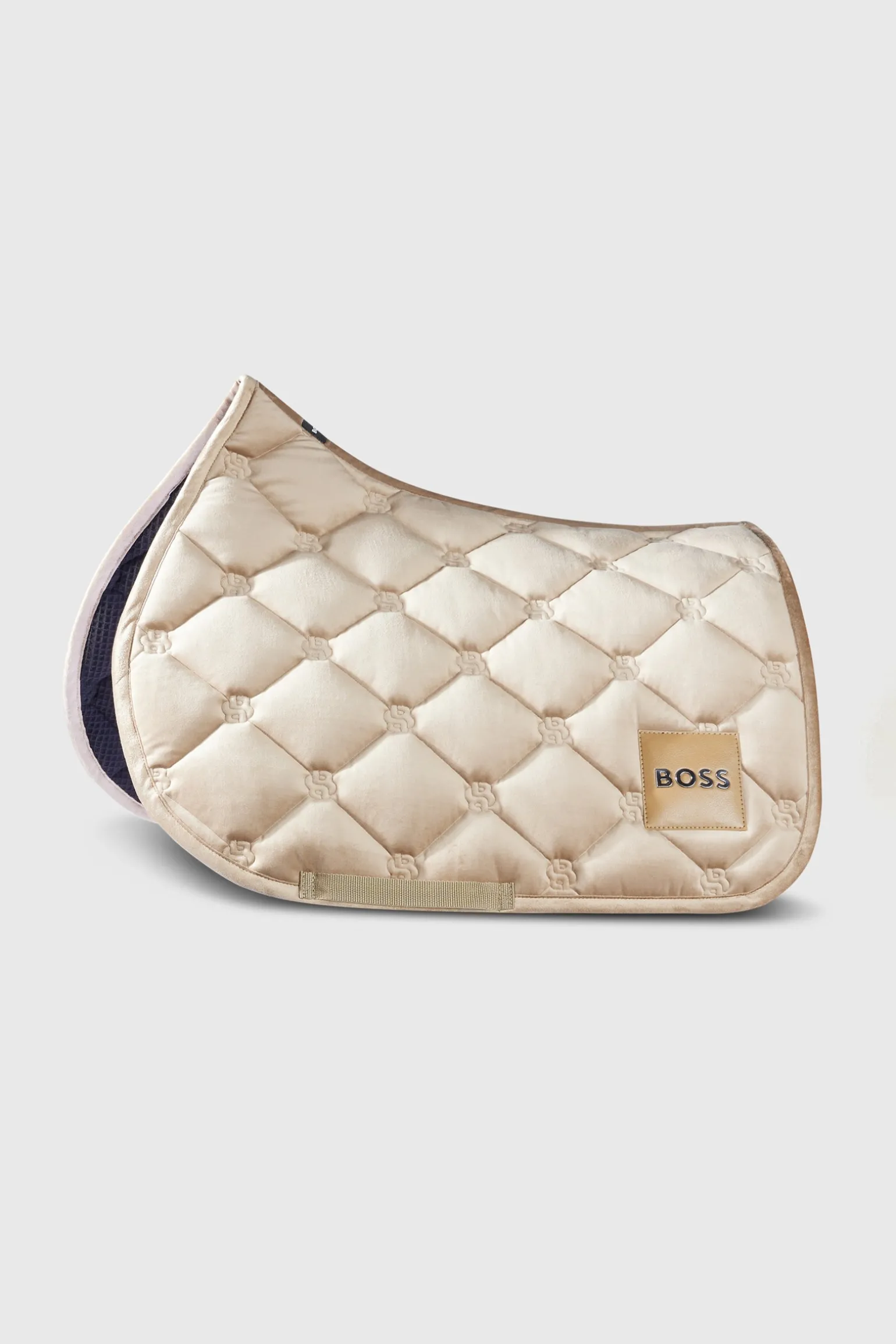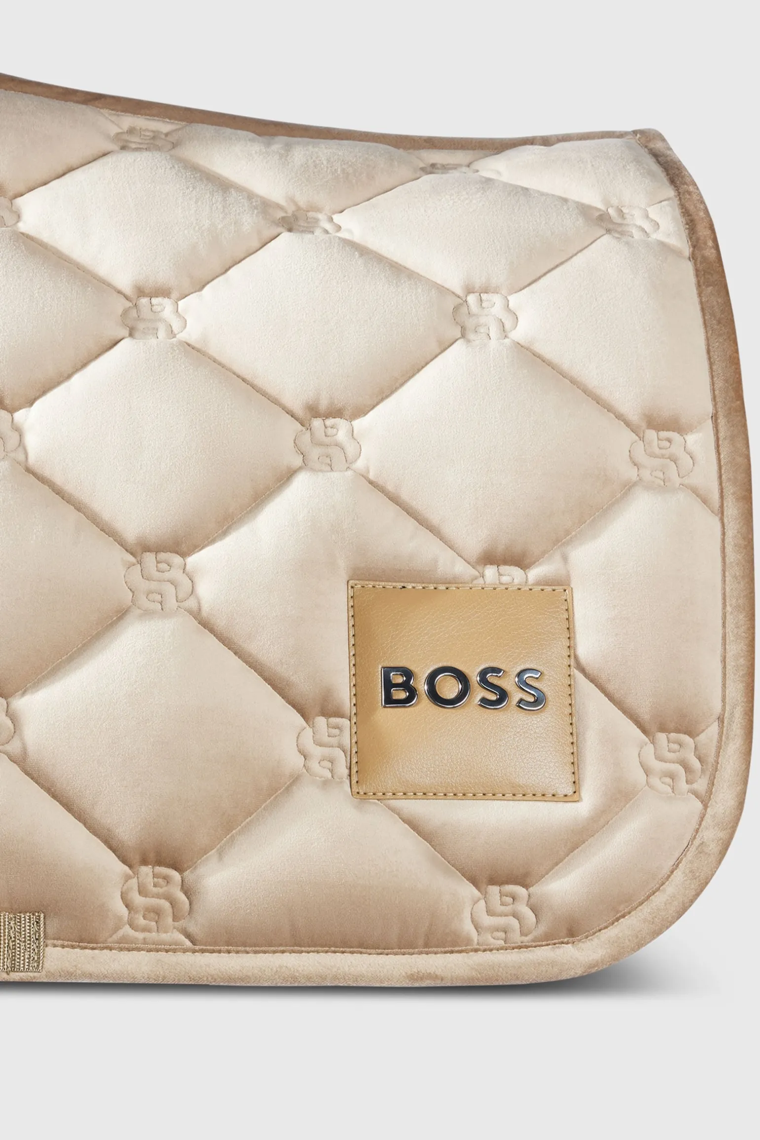 Qualitativ hochwertige Samt Dressurschrabracke mit extra dicker Steppung und Füllung. BOSS-Logo-Stickerei in der Steppung, Schnitt mit hohem Baum, Schulterfreiheit für optimale Sattellage, kein Verrutschen. Innen mit natürlicher Hightech-Faserfüllung, die Feuchtigkeit optimal ableitet. Großer BOSS Logo Kunstleder-Aufnäher.