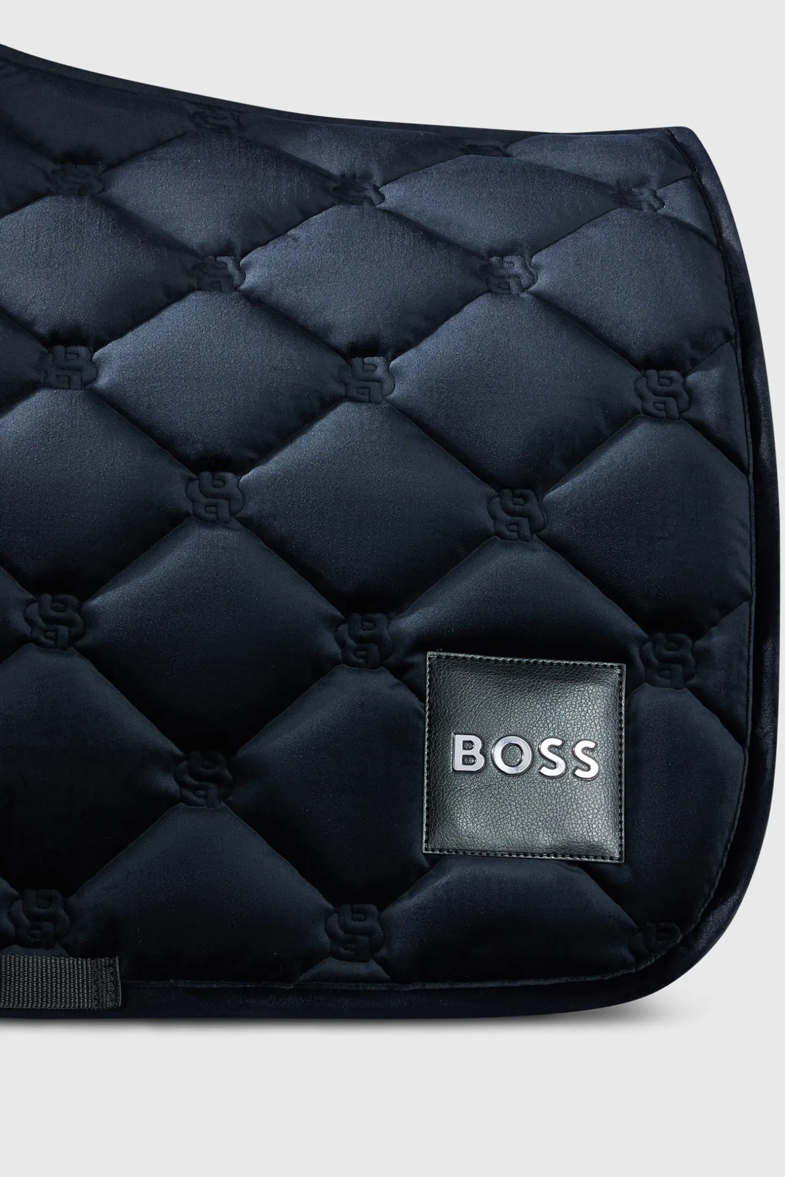Qualitativ hochwertige Samt Dressurschrabracke mit extra dicker Steppung und Füllung. BOSS-Logo-Stickerei in der Steppung, Schnitt mit hohem Baum, Schulterfreiheit für optimale Sattellage, kein Verrutschen. Innen mit natürlicher Hightech-Faserfüllung, die Feuchtigkeit optimal ableitet. Großer BOSS Logo Kunstleder-Aufnäher.