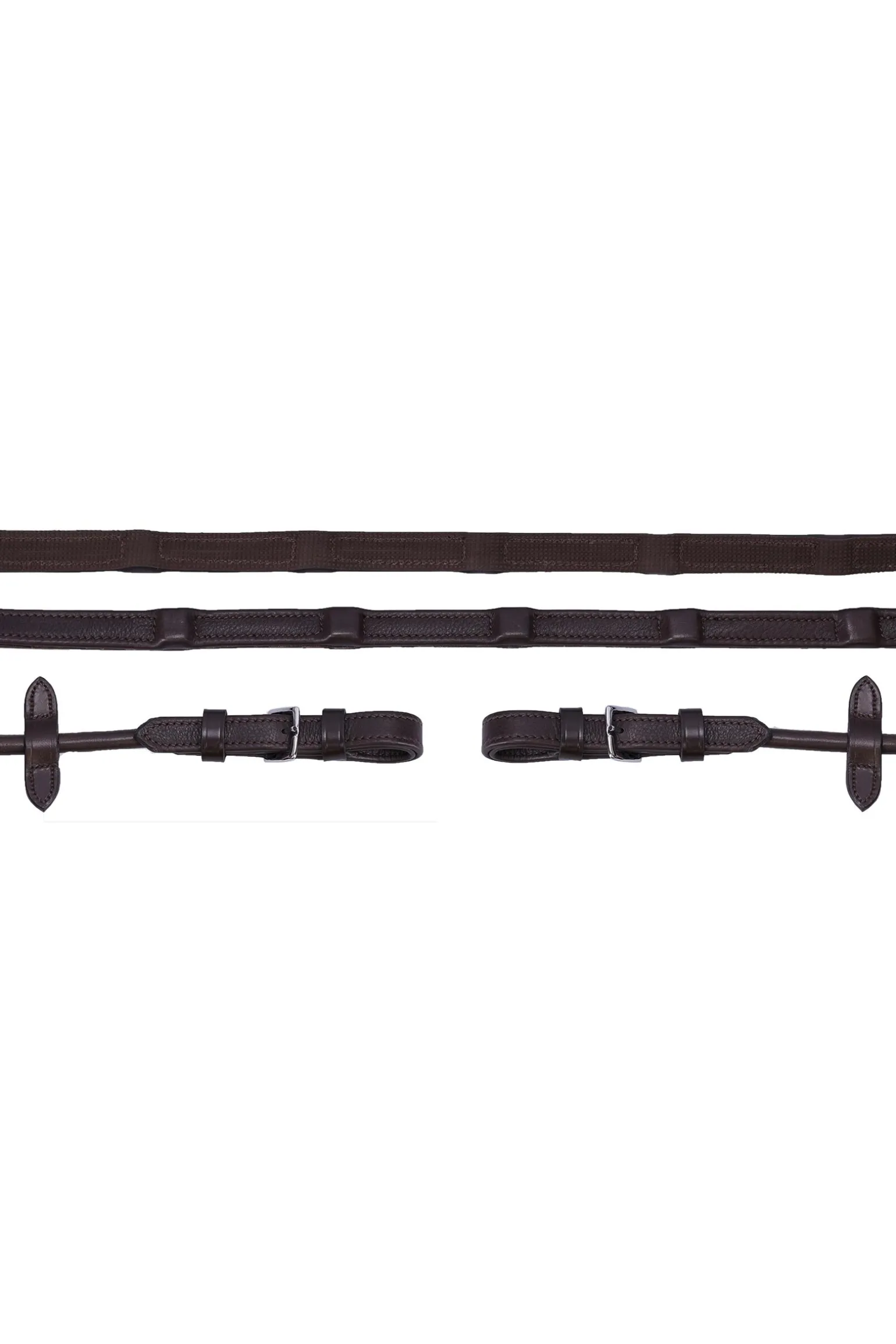 Der rundgenähte Zügel hat einen reißfesten Nylonkern, einschließlich der Gebissschlaufe. Sein Kernmaterial ist vergleichbar mit dem Material eines Sicherheitsgurts.