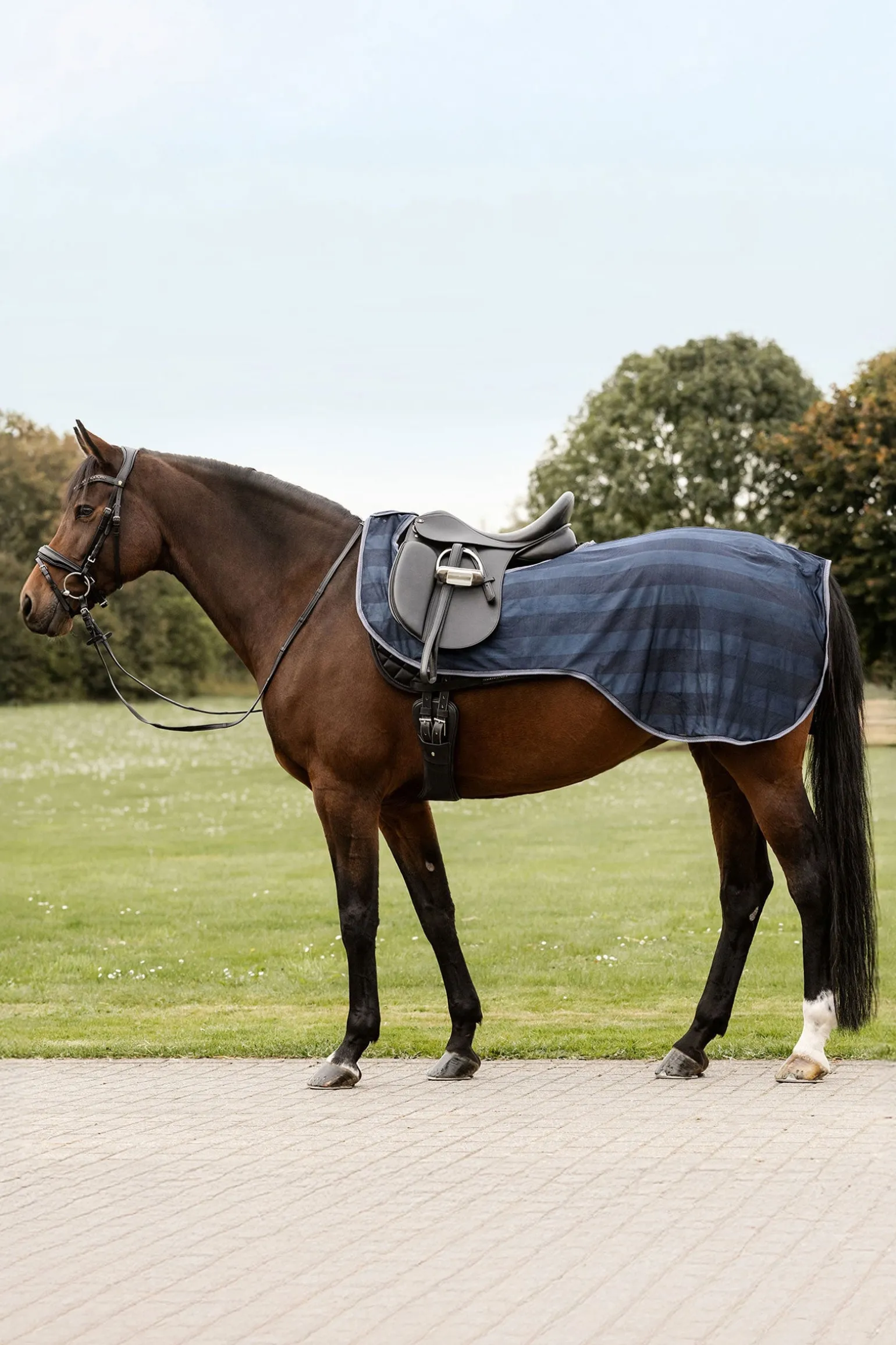 Die stilvolle Fliegenausreitdecke besticht durch ihr klassisches Design und wird am Widerrist mit einem praktischen Klettverschluss geschlossen. Sie ist mit einem Sattelausschnitt versehen und schützt zuverlässig vor lästigen Fliegen. Zudem sorgt eine tiefe Hinterhandkordel dafür, dass die Decke stets an ihrem Platz bleibt und nicht verrutscht.
