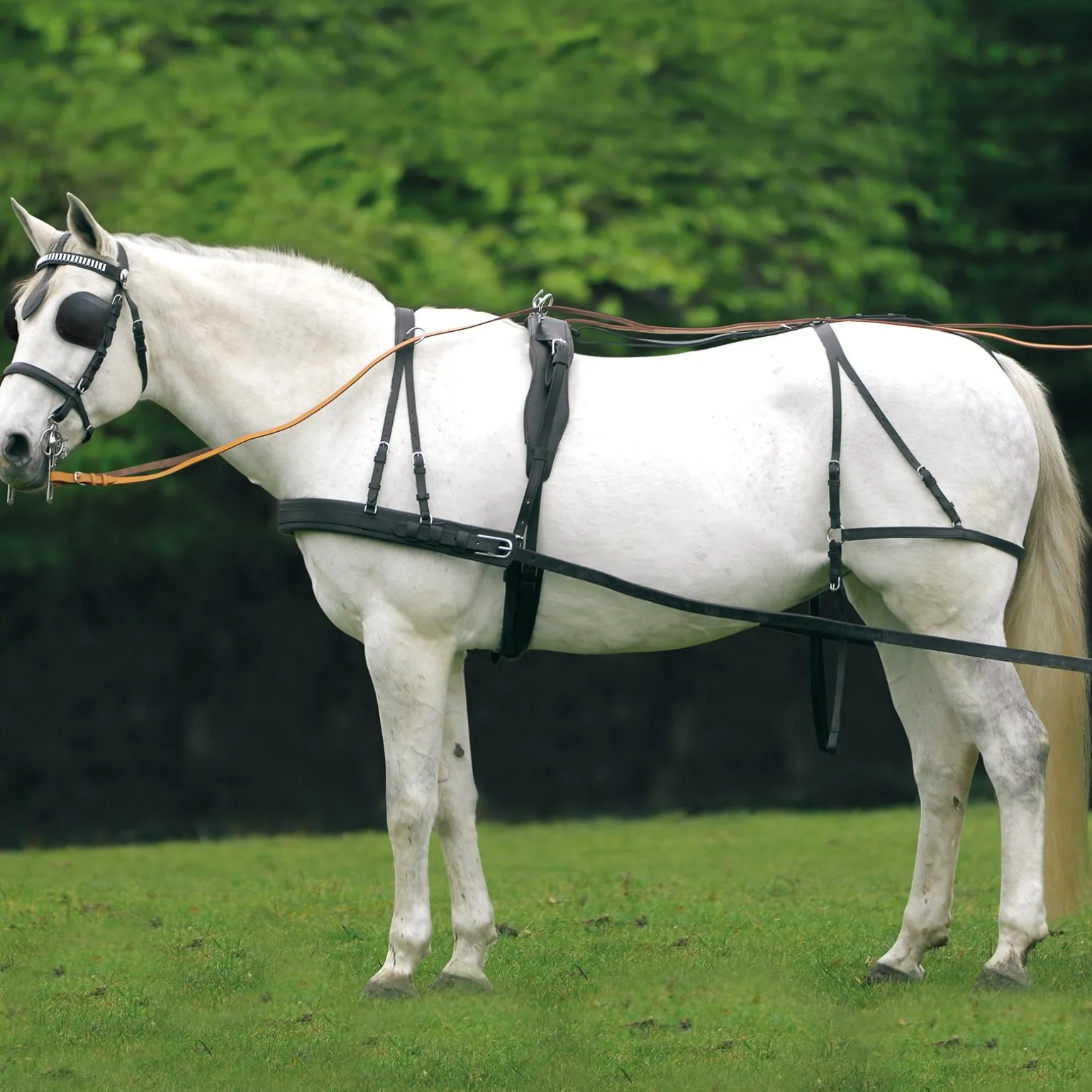 Robustes Brustblatt-Geschirr aus Leder, weich unterlegt, nylonverstärkt. Komplett mit Fahrzaum mit Scheuklappen, Fahrleinen, Brustblatt, Selett, Zugsträngen, Schweifriemen und Hintergeschirr. Tragösen am Bauchgurt beweglich. Inkl. Geschirrtasche.
