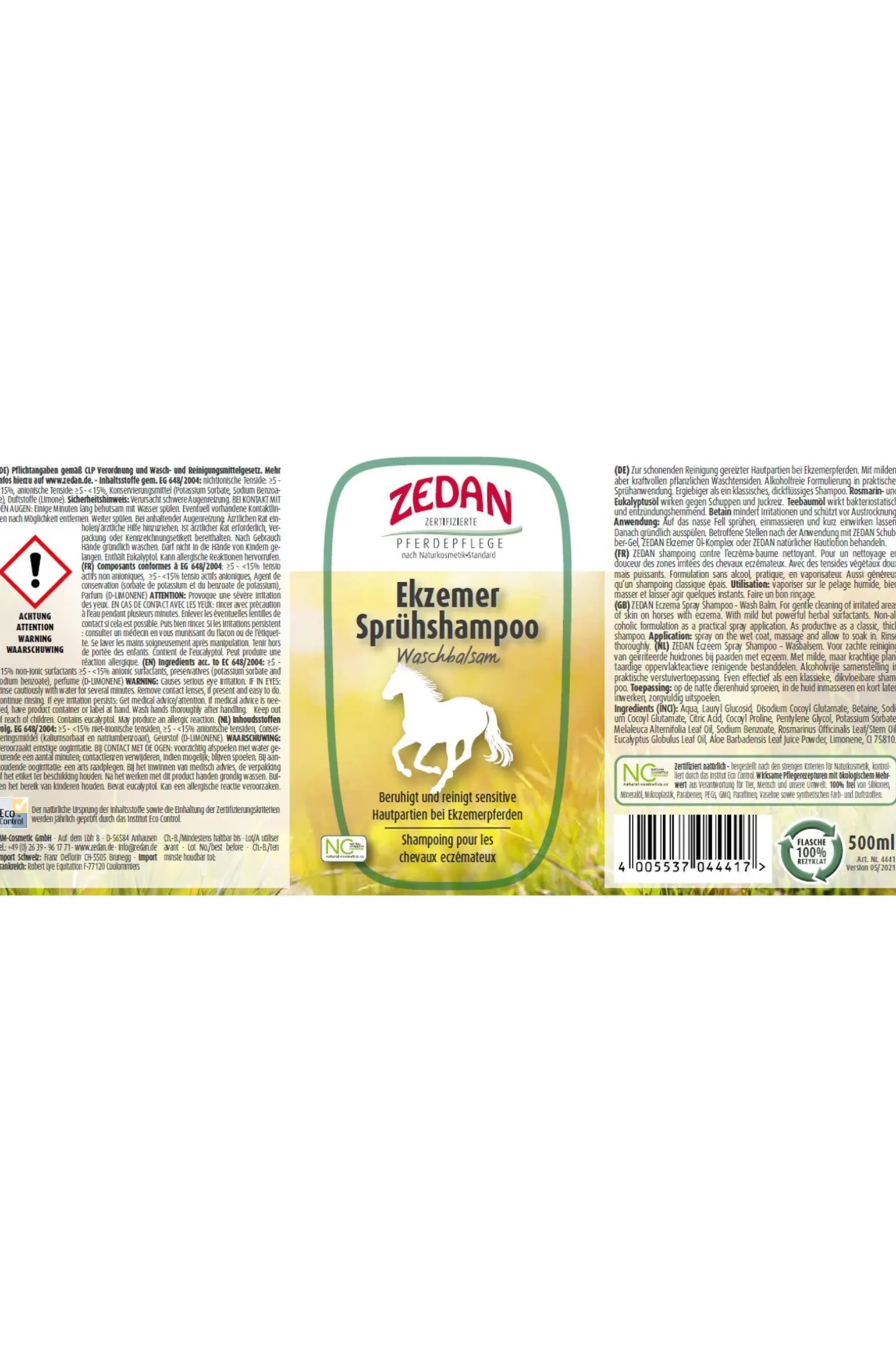 Zur schonenden Reinigung gereizter Hautpartien bei Ekzemerpferden. Mit milden, aber kraftvollen pflanzlichen Waschtensiden. Alkoholfreie Formulierung in praktischer Sprühanwendung. Ergiebiger als ein klassisches, dickflüssiges Shampoo. Rosmarin- und Eukalyptusöl wirken gegen Schuppen und Juckreiz. Teebaumöl wirkt bakteriostatisch und entzündungshemmend. Betain mindert Irritationen und schützt vor Austrocknung. Wirksame Pflegerezepturen mit ökologischem Mehrwert aus Verantwortung für Tier, Mensch und unsere Umwelt.
