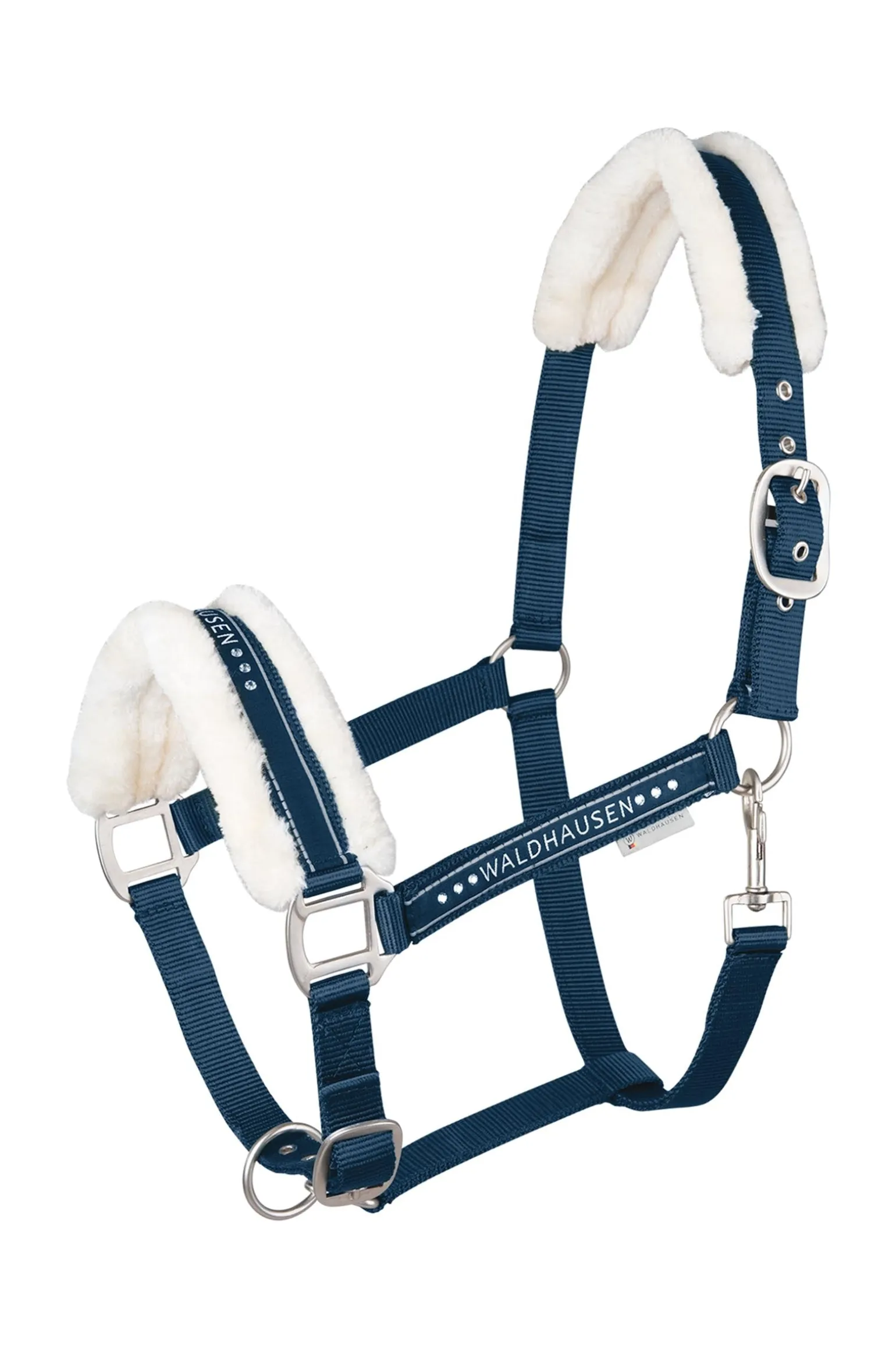 Flauschiges Halfter mit Waldhausen-Modeband und matten Beschlägen Highlight: zusätzliche Strasssteine am Nasenriemen Weiche Polsterung aus Kunstfell am Genickstück und Nasenriemen Mehrfach verstellbar am Kinnriemen und Genickstück