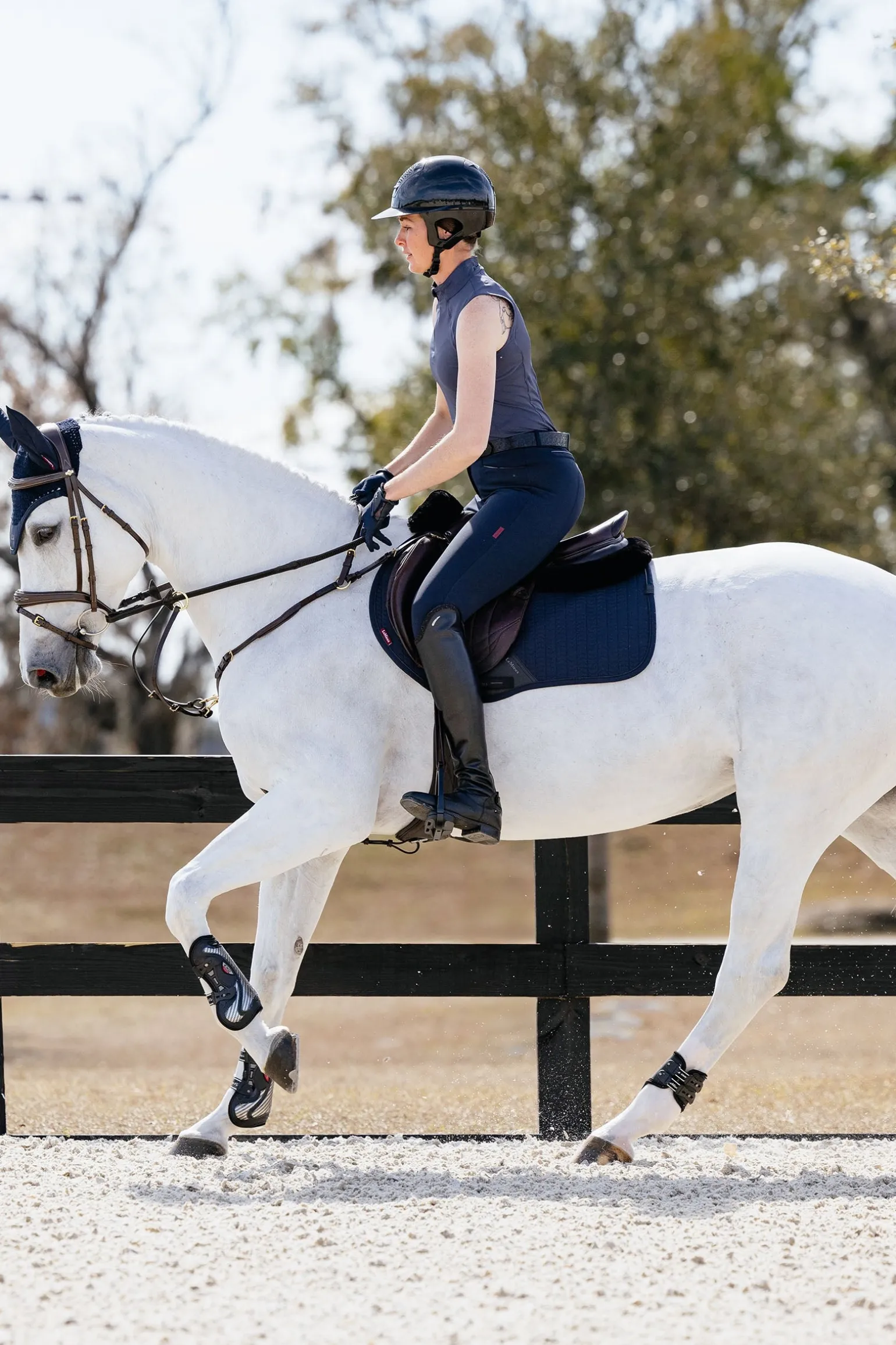 Entwickelt für anspruchsvolle Reiter mit technischer Performance, die jeder genießen kann. Das weiche Softshell-Material der Essence-Kollektion strahlt Eleganz aus. Die konturierte, gesteppte Softshell-Oberseite wurde präzise geformt, um sich perfekt an die Körperlinien deines Pferdes anzupassen, ohne zu Falten. Das weiche, atmungsaktive Innenfutter enthält kühlende Fasern. Je wärmer dein Pferd wird, desto intensiver arbeitet das feuchtigkeitsaktivierte Kühlsystem unter dem Sattel. In Kombination mit einem durchgehenden 3D-Carbon-Mesh-Rücken für maximale Luftzirkulation ist dies eine Schabracke, die speziell für leistungsstarke Pferde entwickelt wurde. Die hohe Widerristform reduziert den Druck und verbessert die Passform des Sattels. Der sportliche, matt strukturierte Kunstleder-Bereich zum Schutz des Gurtes wird durch ein geprägtes Logo ergänzt.