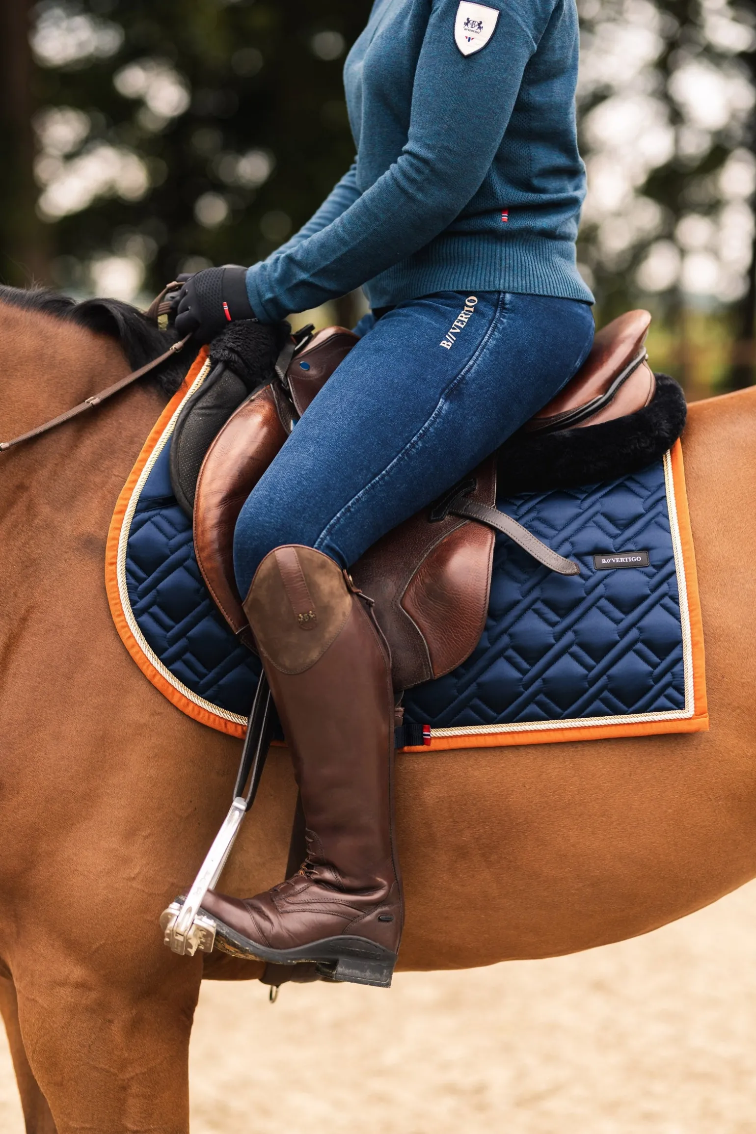 Diese Schabracke ist anatomisch geformt und passt sich perfekt an den Rücken deines Pferdes an. Das Anti-Rutsch-Polster sorgt dafür, dass der Sattel an seinem Platz bleibt. Die große, zaunartige Steppung sorgt für einen Hauch von Eleganz. Mit kontrastierenden Paspeln und Kordeln besticht diese Schabracke durch ihr raffiniertes Design. Die Gurtschlaufe ist mit einer Logostickerei verziert, die ein dezentes Markendetail darstellt. Die Schabracke ist zusätzlich mit einem zarten B Vertigo-Logo auf der linken Seite verziert und zeigt, wie viel Liebe zum Detail in dieser Schabracke steckt. Hebe deine Leistung mit der B Vertigo Evolve Springschabracke hervor.