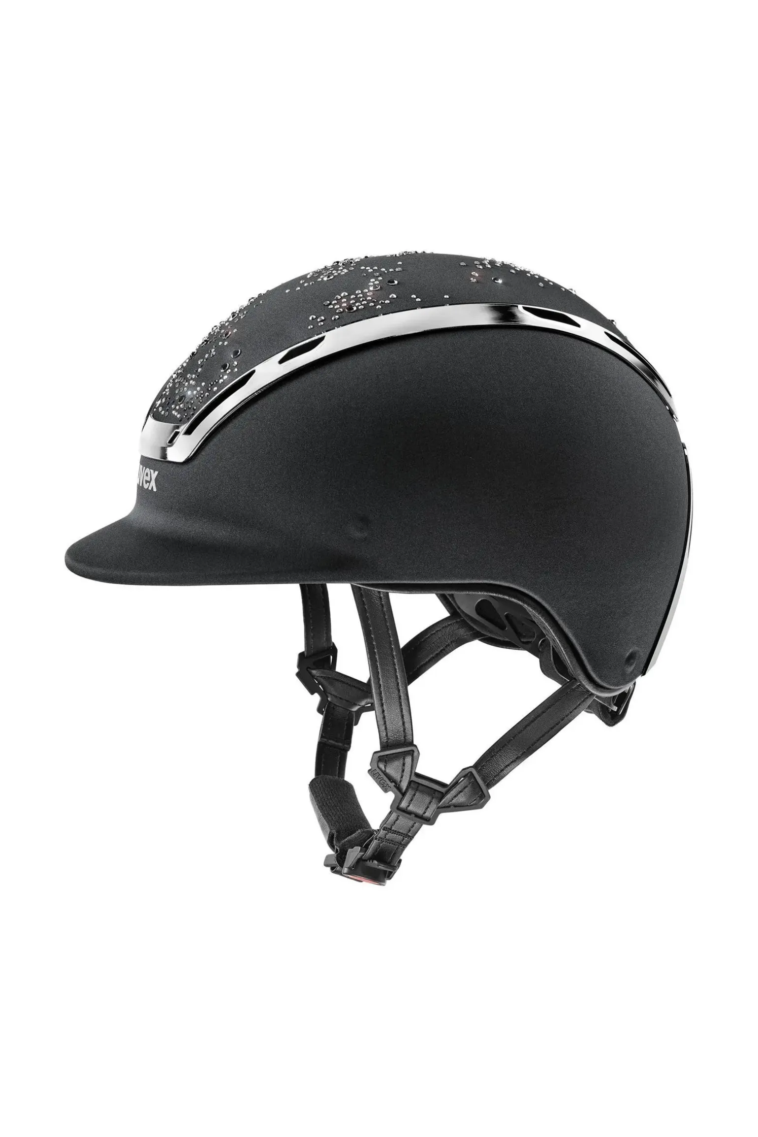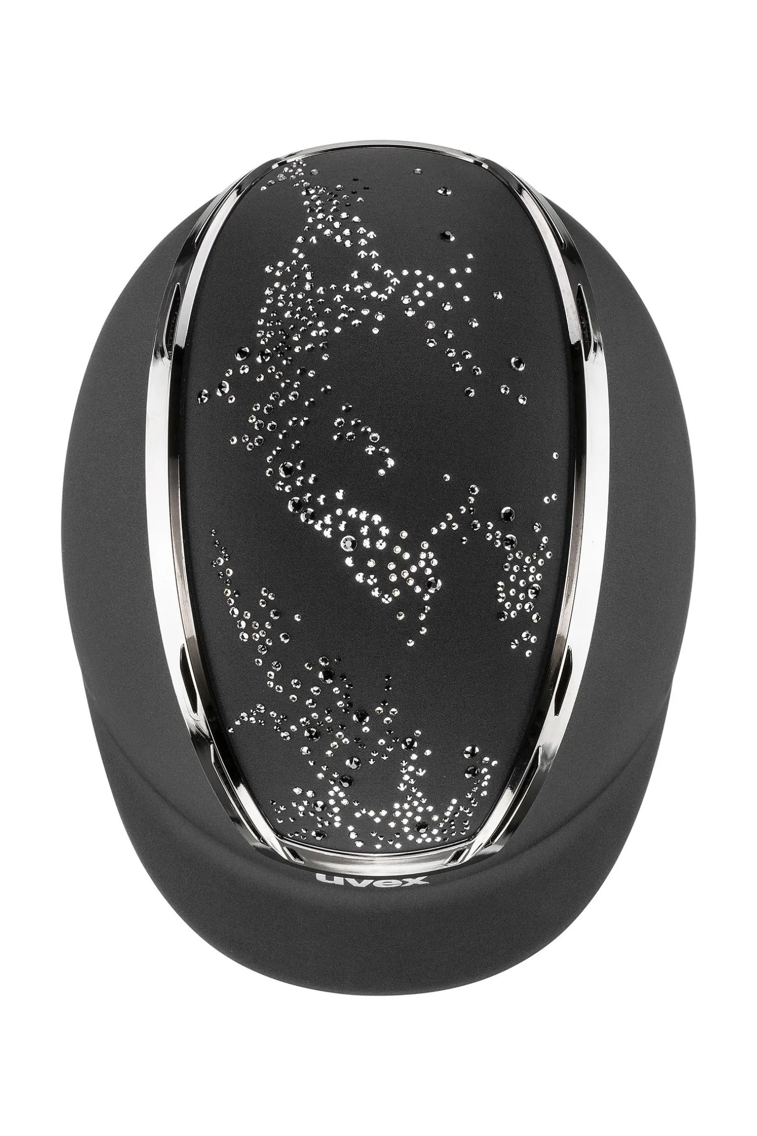 Eine Kaskade applizierter Swarovski®-Kristalle umgeben von einem edlen Chromrahmen ziert das Top dieses eleganten Reithelms. Mehr als 500 Steine glitzern wie Sternenstaub und sind ein echter Blickfang! Darunter garantieren hochwertige Features optimalen Sitz und einen sicheren Schutz in jeder Situation. Dazu gehören zum Beispiel die neuen veganen Ledergurtbänder, die durch einen neu entwickelten Y-Verteiler flexibel verstellt werden können, oder die bewährte Hardshell Technologie. Für Reiterinnen, die ganz genau wissen, worauf es ankommt.