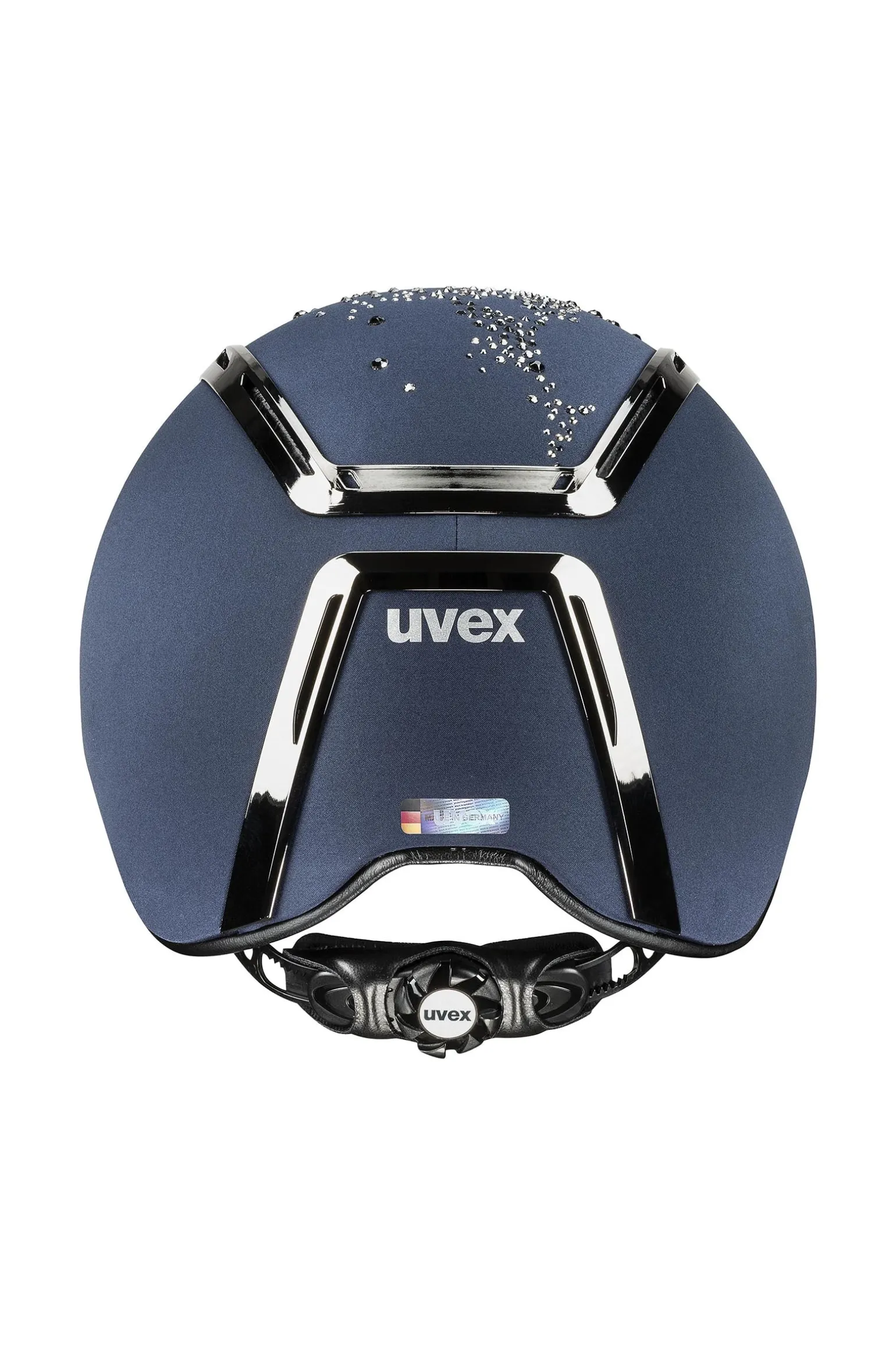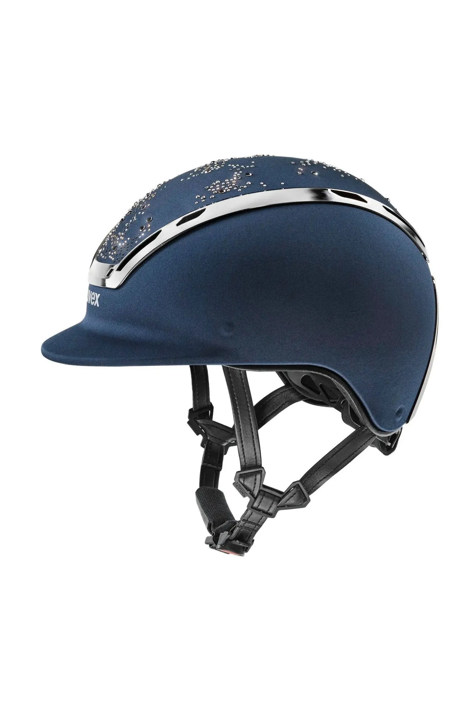 Eine Kaskade applizierter Swarovski®-Kristalle umgeben von einem edlen Chromrahmen ziert das Top dieses eleganten Reithelms. Mehr als 500 Steine glitzern wie Sternenstaub und sind ein echter Blickfang! Darunter garantieren hochwertige Features optimalen Sitz und einen sicheren Schutz in jeder Situation. Dazu gehören zum Beispiel die neuen veganen Ledergurtbänder, die durch einen neu entwickelten Y-Verteiler flexibel verstellt werden können, oder die bewährte Hardshell Technologie. Für Reiterinnen, die ganz genau wissen, worauf es ankommt.