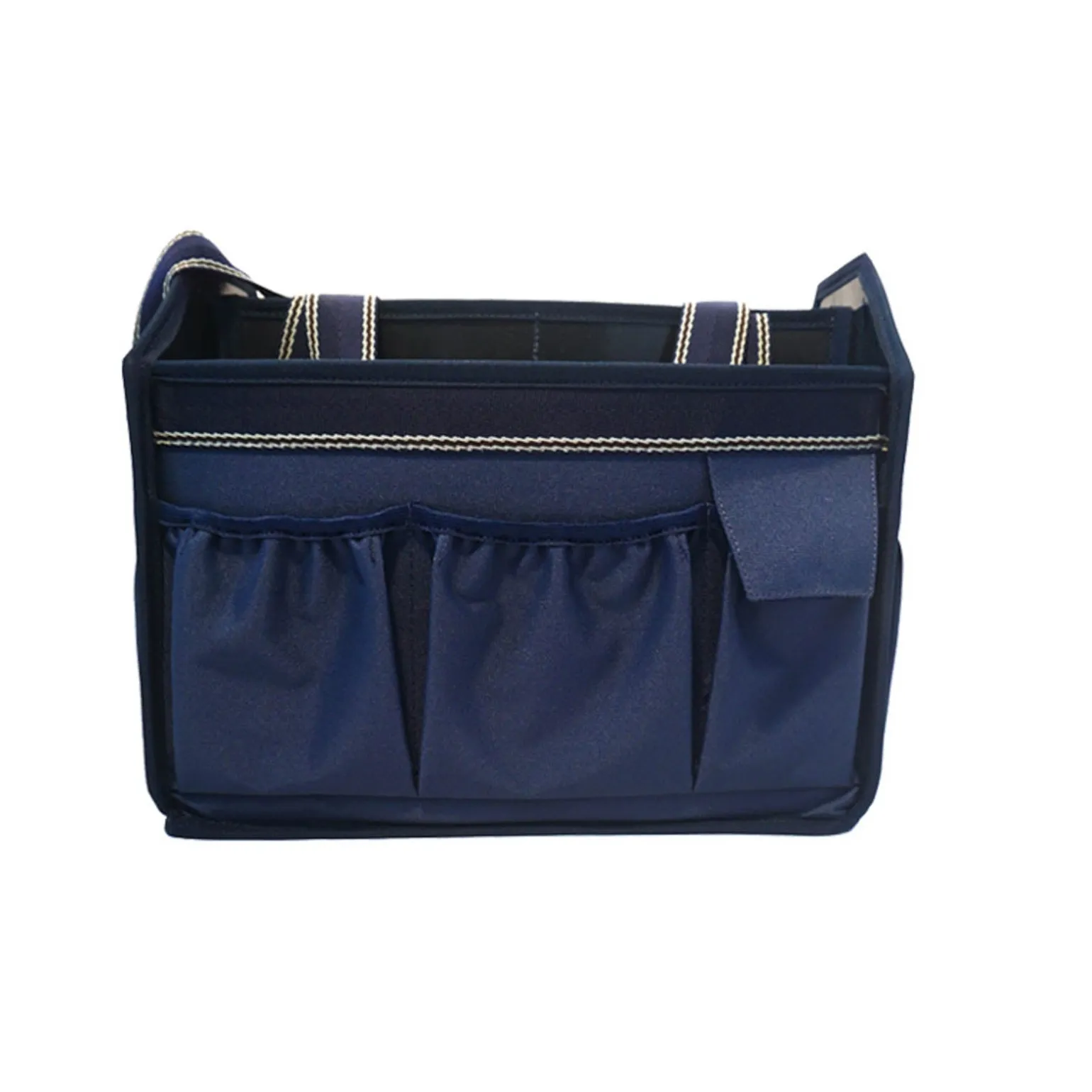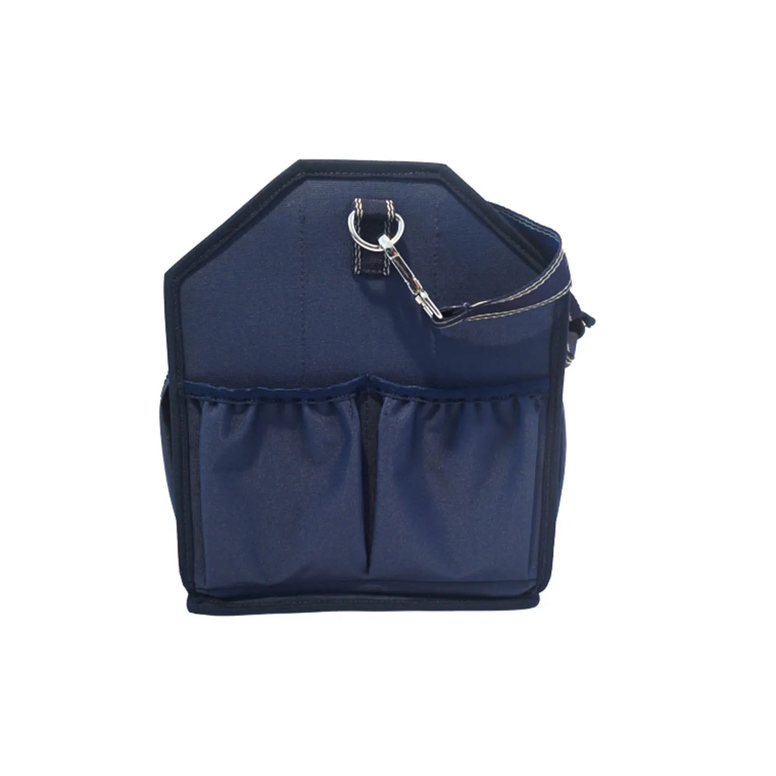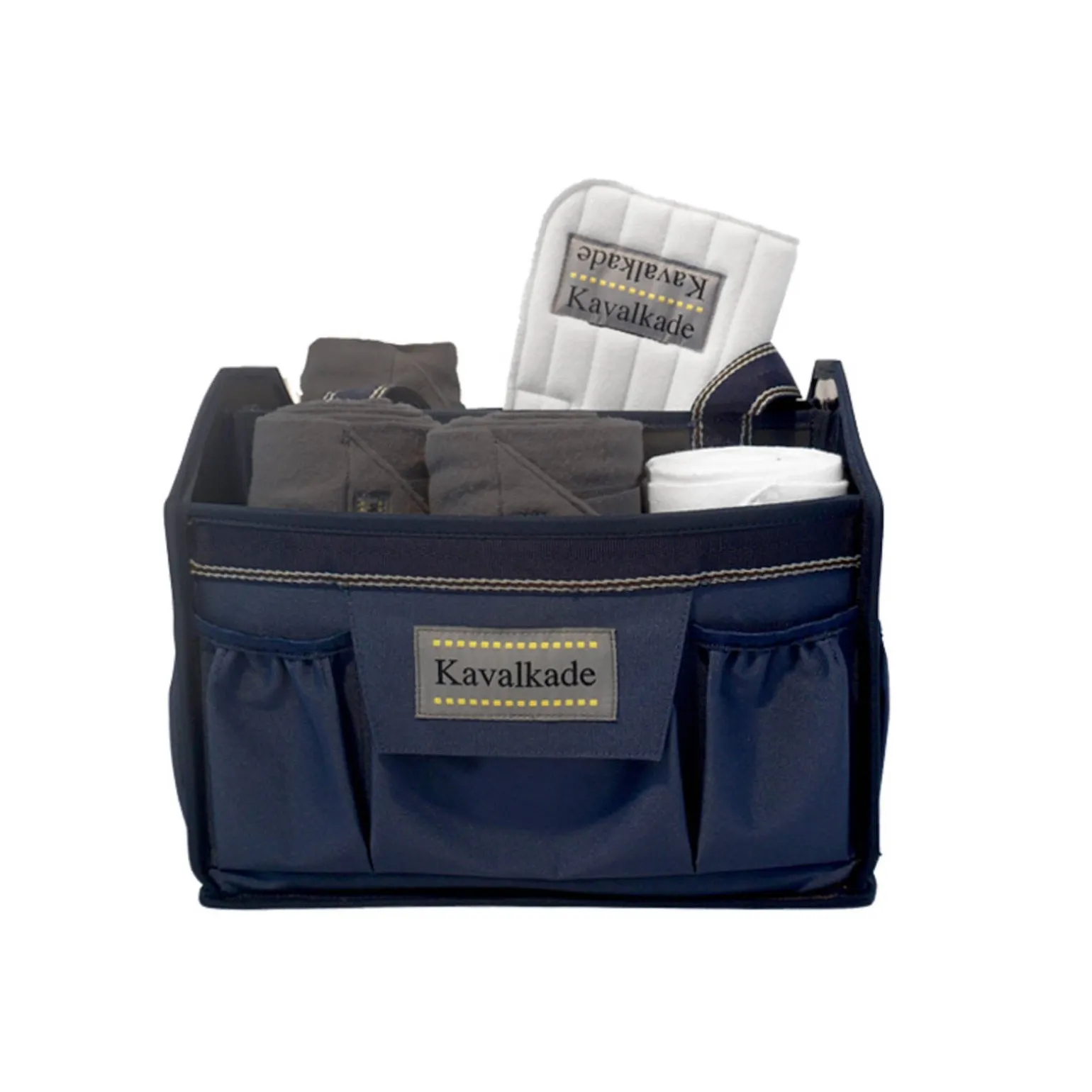 Die stabile Putztasche ist ideal für Putzzeug, Bandagen oder Pflegemittel. Damit auch kleinere Artikel nicht verloren gehen, hat die Tasche insgesamt neun unterschiedlich große Außenfächer, von denen zwei durch ein Klett geschlossen werden können. Getragen werden kann die Tasche entweder mit kurzen Henkeln oder einem langen Schulterhenkel. Letzteres kann auch abgenommen werden. Der Boden ist aus stabilem Netzmaterial, so das Schmutz und Haare im Inneren der Tasche keine Chance haben. Die Innenwände sind leicht zu reinigen und abwaschbar. Zum optimalen Verstauen ist die Putztasche faltbar.