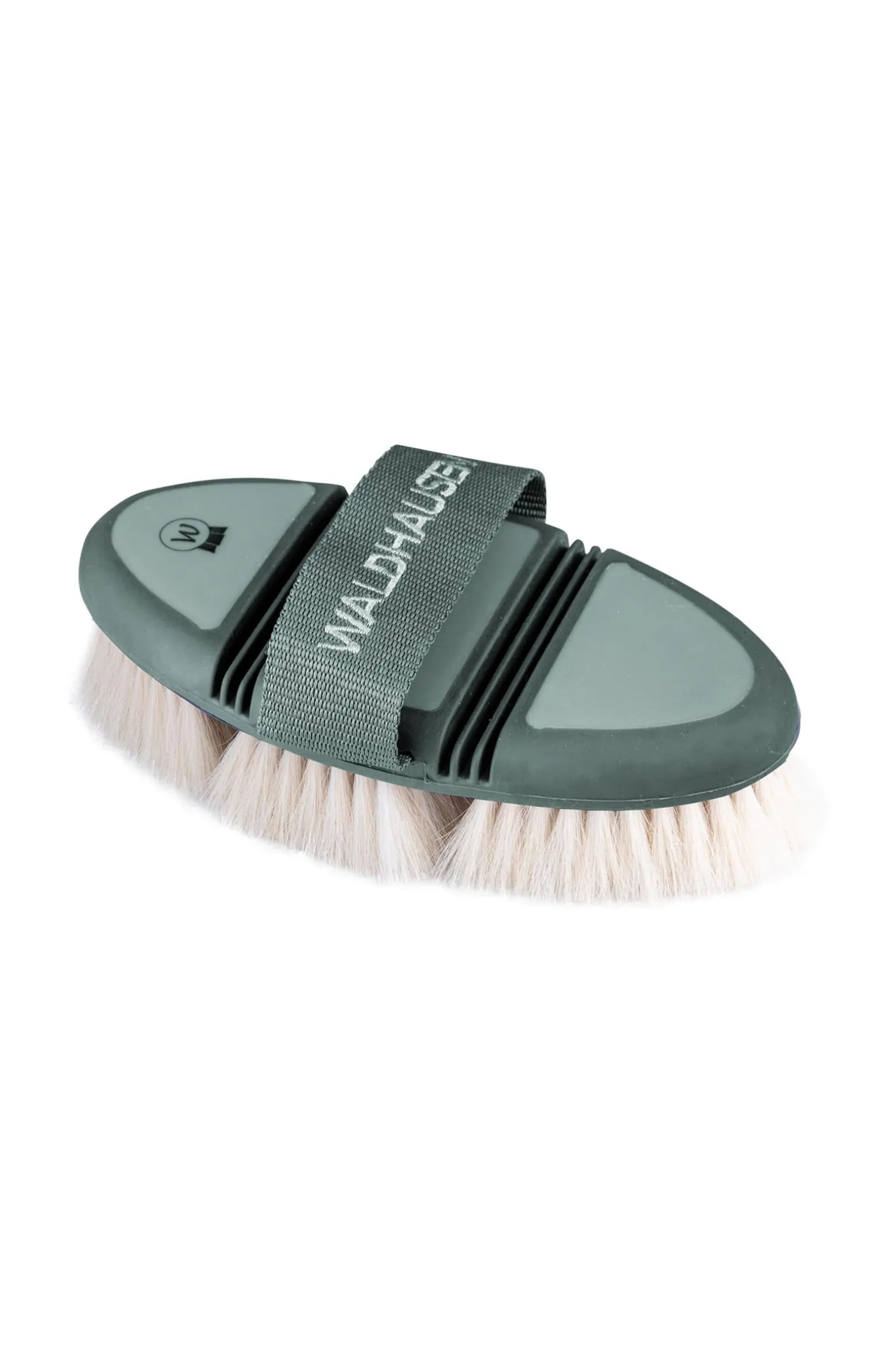 Mit ihren extrem weichen Borsten aus Ziegenhaar sorgt diese Glanzbürste für besondere Pflegemomente und entfernt feinen Staub, sodass das Fell wunderschön glänzt. Die Waldhausen Flex Line schont dank ihrer doppelt biegsamen Rückseite das Handgelenk und passt sich optimal dem Pferdekörper an.